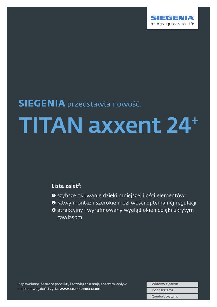 SIEGENIA przedstawia nowość: TITAN axxent 24 + Lista zalet3: ➊ s zybsze okuwanie dzięki mniejszej ilości elementów ➋ ł atwy montaż i szerokie możliwości optymalnej regulacji ➌ atrakcyjny i wyrafinowany wygląd okien dzięki ukrytym zawiasom Zapewniamy, że nasze produkty i rozwiązania mają znaczący wpływ na poprawę jakości życia: www.raumkomfort.com. Window systems Door systems Comfort systems Kryta strona z awiasowa TITAN axxent 24 + . W pełni ukryte okucia to aktualnie obo wiązujący trend, który w połączeniu z oknami o dużych powierzchniach staje się obecnie nieomal wymogiem. W przypadku nowoczesnej architektury – dążącej do ograniczenia i uproszczenia formy – okna z wąskimi profilami czy szklane fasady stanowią same w sobie istotny element dekoracyjny. To co szybkie i łatwe nigdy nie było takie piękne. Korzyści dla producentów do profili drewnianych i drewniano- aluminiowych o minimalnej szerokości wrębu zaczepowego 24 mm, oraz profili PCV i aluminiowych z rowkiem okuciowym 16 mm. wysoka nośność – do 150 kg bez konieczności stosowania dodatkowych elementów Przemyślany design, zastosowanie odpo wiedniej kombinacji najwyższej jakości materiałów i najnowszych technologii montażu, decydują o tym, że nasz nowy TITAN axxent 24+ jest tak prosty, niezawodny, wytrzymały i bezpieczny jak żadna z dotychczasowych stron zawiasowych. Innymi słowy: lepiej czym prędzej zapomnieć o jakichkolwiek uprzedzeniach w odniesieniu do ukrytych zawiasów! płynna regulacja docisku na obu zawiasach zapewnia wyjątkową szczelność łatwe zakładanie i ściąganie skrzydeł, również w pozycji lekkiego uchyłu maksymalnie dostępna regulacja 3D obniżone koszty magazynowania i szybkie okuwanie dzięki niewielkiej ilości elementów szybszy montaż gotowego okna Korzyści dla użytkowników całkowicie ukryte zawiasy decydują o spójności i atrakcyjnym wyglądzie oraz dają znaczną swobodę w aranżacji kolorystycznej okien dzięki wysokiej nośności mogą być stosowane w dużych oknach doskonałe również do małych skrzydeł z uwagi na kompaktowe wymiary wyjątkowo trwałe i niezawodne w działaniu ciągłe uszczelnienie zapewnia wyższe parametry i podnosi stopień izolacji cieplnej wygodna możliwość optymalnej regulacji pozwala idealnie ustawić skrzydło i zapewnia wygodne użytkowanie okien przez długi czas zawias dolny zabezpieczony przed zabrudzeniem przez odpowiednio dobraną osłonkę Dodatkowe informacje techniczne znajdą Państwo w katalogu „TITAN axxent 24+ “ dostępnym na naszej stronie Downloadportal. SIEGENIA GROUP /// ul. Ossowskiego 64 /// 46-203 Kluczbork /// Tel. +48 77 447 7700 /// [email protected] /// www.siegenia.com 2015-05 / Zastrzegamy sobie możliwość zmiany parametrów technicznych i wizualnych.