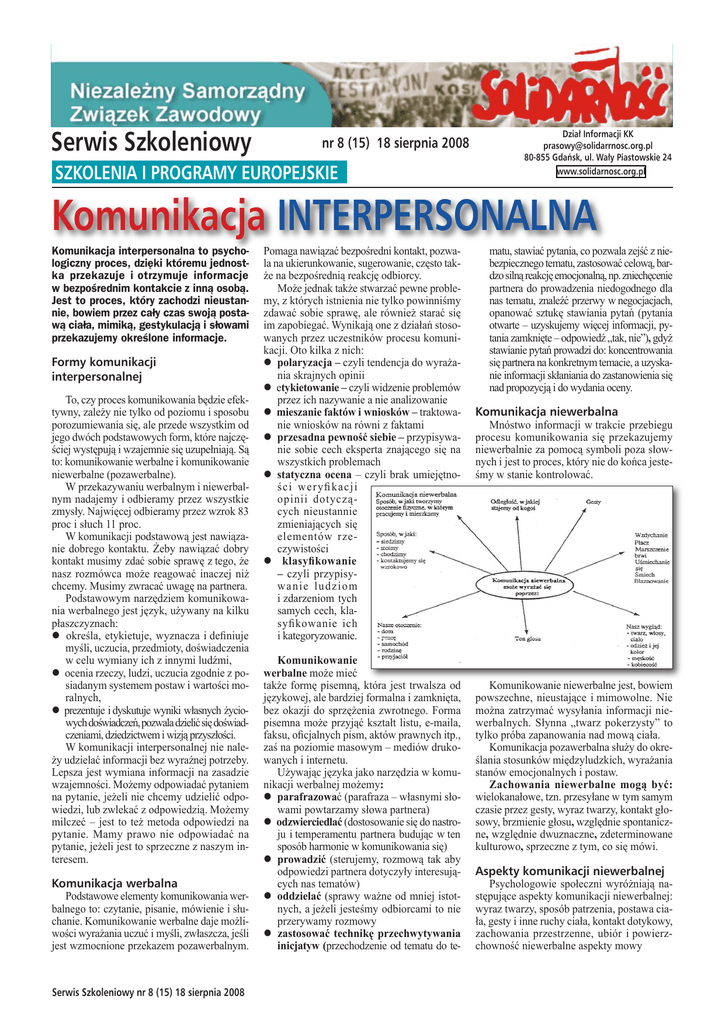Serwis Szkoleniowy nr 8 (15) 18 sierpnia 2008 SZKOLENIA I PROGRAMY EUROPEJSKIE Dział Informacji KK [email protected] 80-855 Gdańsk, ul. Wały Piastowskie 24 www.solidarnosc.org.pl Komunikacja INTERPERSONALNA Komunikacja interpersonalna to psychologiczny proces, dzięki któremu jednostka przekazuje i otrzymuje informacje w bezpośrednim kontakcie z inną osobą. Jest to proces, który zachodzi nieustannie, bowiem przez cały czas swoją postawą ciała, mimiką, gestykulacją i słowami przekazujemy określone informacje. Formy komunikacji interpersonalnej To, czy proces komunikowania będzie efektywny, zależy nie tylko od poziomu i sposobu porozumiewania się, ale przede wszystkim od jego dwóch podstawowych form, które najczęściej występują i wzajemnie się uzupełniają. Są to: komunikowanie werbalne i komunikowanie niewerbalne (pozawerbalne). W przekazywaniu werbalnym i niewerbalnym nadajemy i odbieramy przez wszystkie zmysły. Najwięcej odbieramy przez wzrok 83 proc i słuch 11 proc. W komunikacji podstawową jest nawiązanie dobrego kontaktu. Żeby nawiązać dobry kontakt musimy zdać sobie sprawę z tego, że nasz rozmówca może reagować inaczej niż chcemy. Musimy zwracać uwagę na partnera. Podstawowym narzędziem komunikowania werbalnego jest język, używany na kilku płaszczyznach: określa, etykietuje, wyznacza i definiuje myśli, uczucia, przedmioty, doświadczenia w celu wymiany ich z innymi ludźmi, ocenia rzeczy, ludzi, uczucia zgodnie z posiadanym systemem postaw i wartości moralnych, prezentuje i dyskutuje wyniki własnych życiowych doświadczeń, pozwala dzielić się doświadczeniami, dziedzictwem i wizją przyszłości. W komunikacji interpersonalnej nie należy udzielać informacji bez wyraźnej potrzeby. Lepsza jest wymiana informacji na zasadzie wzajemności. Możemy odpowiadać pytaniem na pytanie, jeżeli nie chcemy udzielić odpowiedzi, lub zwlekać z odpowiedzią. Możemy milczeć – jest to też metoda odpowiedzi na pytanie. Mamy prawo nie odpowiadać na pytanie, jeżeli jest to sprzeczne z naszym interesem. Komunikacja werbalna Podstawowe elementy komunikowania werbalnego to: czytanie, pisanie, mówienie i słuchanie. Komunikowanie werbalne daje możliwości wyrażania uczuć i myśli, zwłaszcza, jeśli jest wzmocnione przekazem pozawerbalnym. Serwis Szkoleniowy nr 8 (15) 18 sierpnia 2008 Pomaga nawiązać bezpośredni kontakt, pozwala na ukierunkowanie, sugerowanie, często także na bezpośrednią reakcję odbiorcy. Może jednak także stwarzać pewne problemy, z których istnienia nie tylko powinniśmy zdawać sobie sprawę, ale również starać się im zapobiegać. Wynikają one z działań stosowanych przez uczestników procesu komunikacji. Oto kilka z nich: polaryzacja – czyli tendencja do wyrażania skrajnych opinii etykietowanie – czyli widzenie problemów przez ich nazywanie a nie analizowanie mieszanie faktów i wniosków – traktowanie wniosków na równi z faktami przesadna pewność siebie – przypisywanie sobie cech eksperta znającego się na wszystkich problemach statyczna ocena – czyli brak umiejętności weryfikacji opinii dotyczących nieustannie zmieniających się elementów rzeczywistości klasyfikowanie – czyli przypisyw anie ludziom i zdarzeniom tych samych cech, klasyfikowanie ich i kategoryzowanie. Komunikowanie werbalne może mieć także formę pisemną, która jest trwalsza od językowej, ale bardziej formalna i zamknięta, bez okazji do sprzężenia zwrotnego. Forma pisemna może przyjąć kształt listu, e-maila, faksu, oficjalnych pism, aktów prawnych itp., zaś na poziomie masowym – mediów drukowanych i internetu. Używając języka jako narzędzia w komunikacji werbalnej możemy: parafrazować (parafraza – własnymi słowami powtarzamy słowa partnera) odzwierciedlać (dostosowanie się do nastroju i temperamentu partnera budując w ten sposób harmonie w komunikowania się) prowadzić (sterujemy, rozmową tak aby odpowiedzi partnera dotyczyły interesujących nas tematów) oddzielać (sprawy ważne od mniej istotnych, a jeżeli jesteśmy odbiorcami to nie przerywamy rozmowy zastosować technikę przechwytywania inicjatyw (przechodzenie od tematu do te- matu, stawiać pytania, co pozwala zejść z niebezpiecznego tematu, zastosować celową, bardzo silną reakcję emocjonalną, np. zniechęcenie partnera do prowadzenia niedogodnego dla nas tematu, znaleźć przerwy w negocjacjach, opanować sztukę stawiania pytań (pytania otwarte – uzyskujemy więcej informacji, pytania zamknięte – odpowiedź „tak, nie”), gdyż stawianie pytań prowadzi do: koncentrowania się partnera na konkretnym temacie, a uzyskanie informacji skłaniania do zastanowienia się nad propozycją i do wydania oceny. Komunikacja niewerbalna Mnóstwo informacji w trakcie przebiegu procesu komunikowania się przekazujemy niewerbalnie za pomocą symboli poza słownych i jest to proces, który nie do końca jesteśmy w stanie kontrolować. Komunikowanie niewerbalne jest, bowiem powszechne, nieustające i mimowolne. Nie można zatrzymać wysyłania informacji niewerbalnych. Słynna „twarz pokerzysty” to tylko próba zapanowania nad mową ciała. Komunikacja pozawerbalna służy do określania stosunków międzyludzkich, wyrażania stanów emocjonalnych i postaw. Zachowania niewerbalne mogą być: wielokanałowe, tzn. przesyłane w tym samym czasie przez gesty, wyraz twarzy, kontakt głosowy, brzmienie głosu, względnie spontaniczne, względnie dwuznaczne, zdeterminowane kulturowo, sprzeczne z tym, co się mówi. Aspekty komunikacji niewerbalnej Psychologowie społeczni wyróżniają następujące aspekty komunikacji niewerbalnej: wyraz twarzy, sposób patrzenia, postawa ciała, gesty i inne ruchy ciała, kontakt dotykowy, zachowania przestrzenne, ubiór i powierzchowność niewerbalne aspekty mowy Różnice między komunikowaniem werbalnym a niewerbalnym Błędy popełniane w procesie komunikowania się: Bardzo w
