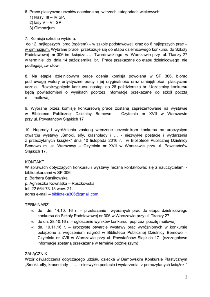 6. Prace plastyczne uczniów oceniane są w trzech kategoriach wiekowych: 1) klasy III – IV SP, 2) lasy V – VI SP 3) Gimnazjum 7. Komisja szkolna wybiera: do 12 najlepszych prac (ogółem) – w szkole podstawowej oraz do 6 najlepszych prac – w gimnazjum. Wybrane prace przekazuje się do etapu dzielnicowego konkursu do Szkoły Podstawowej nr 306 im. księdza . J. Twardowskiego w Warszawie przy ul. Tkaczy 27 w terminie do dnia 14 października br. Prace przekazane do etapu dzielnicowego nie podlegają zwrotowi. 8. Na etapie dzielnicowym prace ocenia komisja powołana w SP 306, biorąc pod uwagę walory artystyczne pracy i jej oryginalność oraz umiejętności plastyczne ucznia. Rozstrzygnięcie konkursu nastąpi do 28 października br. Uczestnicy konkursu będą powiadomieni o wynikach poprzez informacje przekazane do szkół pocztą e — mailową. 9. Wybrane przez komisję konkursową prace zostaną zaprezentowane na wystawie w Bibliotece Publicznej Dzielnicy Bemowo – Czytelnia nr XVII w Warszawie przy ul. Powstańców Śląskich 17 10. Nagrody i wyróżnienia zostaną wręczone uczestnikom konkursu na uroczystym otwarciu wystawy „Smoki, elfy, krasnoludy i … - niezwykłe postacie i wydarzenia z przeczytanych książek” dnia 10 listopada 2016 r. w Bibliotece Publicznej Dzielnicy Bemowo m. st. Warszawy – Czytelnia nr XVII w Warszawie przy ul. Powstańców Śląskich 17. KONTAKT W sprawach dotyczących konkursu i wystawy można kontaktować się z nauczycielami bibliotekarzami w SP 306: p. Barbara Stasikowska p. Agnieszka Kownatka – Ruszkowska tel. 22 664-73-13 wew. 21. adres e-mail – [email protected] TERMINARZ • do dn. 14.10. 16 r. – przekazanie wybranych prac do etapu dzielnicowego konkursu do Szkoły Podstawowej nr 306 w Warszawie przy ul. Tkaczy 27 • do dn. 28.10.16 r. – ogłoszenie wyników konkursu poprzez pocztę mailową • dn. 10.11.16 r. – uroczyste otwarcie wystawy prac wyróżnionych w konkursie połączone z wręczeniem nagród w Bibliotece Publicznej Dzielnicy Bemowo – Czytelnia nr XVII w Warszawie przy ul. Powstańców Śląskich 17 (szczegółowe informacje zostaną przekazane w terminie późniejszym) ZAŁĄCZNIK Wzór oświadczenia dotyczącego udziału dziecka w Bemowskim Konkursie Plastycznym „Smoki, elfy, krasnoludy i … - niezwykłe postacie i wydarzenia z przeczytanych książek ” 2 Szkoła Podstawowa nr 306 im. ks. J. Twardowskiego przy ul. Tkaczy 27 zaprasza uczniów klas III-VI szkół podstawowych oraz gimnazjów na Bemowie do udziału w konkursie plastycznym „Smoki, elfy, krasnoludy i… - niezwykłe postacie i wydarzenia z przeczytanych książek” pod honorowym patronatem. Burmistrza Dzielnicy Bemowo. REGULAMIN BEMOWSKIEGO KONKURSU PLASTYCZNEGO „SMOKI, ELFY, KRASNOLUDY i ….. – niezwykłe postacie i wydarzenia z przeczytanych książek” Cele konkursu: 1. Rozwijanie wyobraźni i umiejętności plastycznych uczniów. 2. Promowanie czytelnictwa. 3. Włączenie szkół w dzielnicy Bemowo do realizacji założeń „Narodowego Programu Rozwoju Czytelnictwa 2016 – 2020”. Adresat konkursu – uczniowie klas III – VI szkół podstawowych oraz gimnazjów Zasady: 1. Zadaniem uczestnika konkursu jest wykonanie ilustracji do przeczytanej książki (opowiadania, baśni, legendy), w której występowały niezwykłe wydarzenia i postacie (smoki, elfy, krasnoludy / krasnoludki, czarownice, czarodzieje i wszystkie inne, które stworzyła wyobraźnia autora). 2. Technika – dowolna płaska. 3. Format – A4 lub A3. 4. Ilustracja opatrzona jest wydrukowaną „metryczką” Tekst metryczki powinien być napisany czcionką Arial w rozmiarze 14 i należy go umieścić na ilustracji (przednia strona kartonu) w prawym dolnym rogu. Poniżej wzór metryczki:: Tytuł książki (opowiadania, baśni, legendy) ………………… Imię, nazwisko autora………………………………………… Nazwa szkoły Imię i nazwisko ucznia – autora pracy , klasa 5.Do pracy plastycznej dołączone jest podpisane przez rodziców ucznia oświadczenie dotyczące udziału dziecka w Bemowskim Konkursie Plastycznym „Smoki, elfy, krasnoludy i … - niezwykłe postacie i wydarzenia z przeczytanych książek ” Wzór oświadczenia – w załączeniu. 1