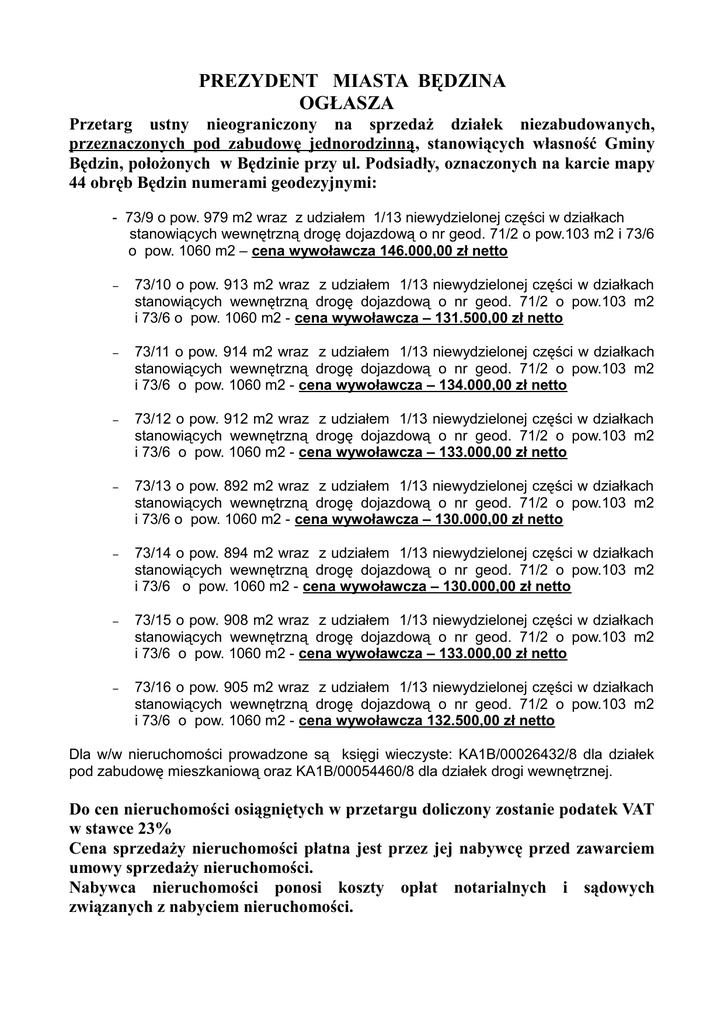 PREZYDENT MIASTA BĘDZINA OGŁASZA Przetarg ustny nieograniczony na sprzedaż działek niezabudowanych, przeznaczonych pod zabudowę jednorodzinną, stanowiących własność Gminy Będzin, położonych w Będzinie przy ul. Podsiadły, oznaczonych na karcie mapy 44 obręb Będzin numerami geodezyjnymi: - 73/9 o pow. 979 m2 wraz z udziałem 1/13 niewydzielonej części w działkach stanowiących wewnętrzną drogę dojazdową o nr geod. 71/2 o pow.103 m2 i 73/6 o pow. 1060 m2 – cena wywoławcza 146.000,00 zł netto – 73/10 o pow. 913 m2 wraz z udziałem 1/13 niewydzielonej części w działkach stanowiących wewnętrzną drogę dojazdową o nr geod. 71/2 o pow.103 m2 i 73/6 o pow. 1060 m2 - cena wywoławcza – 131.500,00 zł netto – 73/11 o pow. 914 m2 wraz z udziałem 1/13 niewydzielonej części w działkach stanowiących wewnętrzną drogę dojazdową o nr geod. 71/2 o pow.103 m2 i 73/6 o pow. 1060 m2 - cena wywoławcza – 134.000,00 zł netto – 73/12 o pow. 912 m2 wraz z udziałem 1/13 niewydzielonej części w działkach stanowiących wewnętrzną drogę dojazdową o nr geod. 71/2 o pow.103 m2 i 73/6 o pow. 1060 m2 - cena wywoławcza – 133.000,00 zł netto – 73/13 o pow. 892 m2 wraz z udziałem 1/13 niewydzielonej części w działkach stanowiących wewnętrzną drogę dojazdową o nr geod. 71/2 o pow.103 m2 i 73/6 o pow. 1060 m2 - cena wywoławcza – 130.000,00 zł netto – 73/14 o pow. 894 m2 wraz z udziałem 1/13 niewydzielonej części w działkach stanowiących wewnętrzną drogę dojazdową o nr geod. 71/2 o pow.103 m2 i 73/6 o pow. 1060 m2 - cena wywoławcza – 130.000,00 zł netto – 73/15 o pow. 908 m2 wraz z udziałem 1/13 niewydzielonej części w działkach stanowiących wewnętrzną drogę dojazdową o nr geod. 71/2 o pow.103 m2 i 73/6 o pow. 1060 m2 - cena wywoławcza – 133.000,00 zł netto – 73/16 o pow. 905 m2 wraz z udziałem 1/13 niewydzielonej części w działkach stanowiących wewnętrzną drogę dojazdową o nr geod. 71/2 o pow.103 m2 i 73/6 o pow. 1060 m2 - cena wywoławcza 132.500,00 zł netto Dla w/w nieruchomości prowadzone są księgi wieczyste: KA1B/00026432/8 dla działek pod zabudowę mieszkaniową oraz KA1B/00054460/8 dla działek drogi wewnętrznej. Do cen nieruchomości osiągniętych w przetargu doliczony zostanie podatek VAT w stawce 23% Cena sprzedaży nieruchomości płatna jest przez jej nabywcę przed zawarciem umowy sprzedaży nieruchomości. Nabywca nieruchomości ponosi koszty opłat notarialnych i sądowych związanych z nabyciem nieruchomości. Przeznaczenie w miejscowym planie zagospodarowania przestrzennego : Zabudowa mieszkaniowa jednorodzinna - symbol planu A6 MN Wadium uprawniające do uczestnictwa w przetargu wnoszone w pieniądzu wynosi 13.000,00 zł. Wpłata jednego wadium upoważnia do nabycia jednej działki. Przetarg odbędzie się, w dniu 15 września 2016r. roku o godz. 10.00 w siedzibie Urzędu Miejskiego w Będzinie ul.11 Listopada 20, sala Nr 101, I piętro. OSOBY ZAINTERESOWANE UCZESTNICTWEM W PRZETARGU WINNY: ● ● zapoznać się z regulaminem przetargowym dostępnym w Wydziale Gospodarki Nieruchomościami Urzędu Miejskiego w Będzinie ul. 11 Listopada 20, pokój 107, I piętro oraz na stronie www.bip.bedzin najpóźniej do dnia 12 września 2016 roku wpłacić wadium w podanej wysokości na konto Urzędu Miejskiego w Będzinie – Wydziału Księgowo Budżetowego w ING Banku Śląskim S.A. Oddział w Będzinie Nr 44 1050 1142 1000 0023 0074 0087 lub w kasie Urzędu Miejskiego w Będzinie. Wymagane jest aby w podanym terminie wadium znajdowało się na koncie organizatora przetargu. Uwaga ! Osoby , które wpłacą wadium po terminie wskazanym w ogłoszeniu nie zostaną dopuszczone do uczestnictwa w przetargu. W przypadku nie przystąpienia przez osoby wygrywające przetarg do notarialnej umowy sprzedaży nieruchomości w terminie ustalonym przez sprzedającego, Prezydent Miasta Będzina może odstąpić od zawarcia notarialnej umowy sprzedaży, a wpłacone wadium nie będzie podlegać zwrotowi. Wszelkich informacji dotyczących przetargu udziela Wydział Gospodarki Nieruchomościami w Urzędzie Miejskim w Będzinie telefon 32 267 - 92 - 35 . Prezydent Miasta Będzina zastrzega sobie możliwość odwołania przetargu.