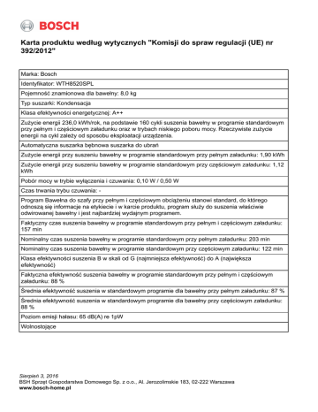 Karta produktu według wytycznych "Komisji do spraw regulacji (UE) nr 392/2012" Marka: Bosch Identyfikator: WTH8520SPL Pojemność znamionowa dla bawełny: 8,0 kg Typ suszarki: Kondensacja Klasa efektywności energetycznej: A++ Zużycie energii 236,0 kWh/rok, na podstawie 160 cykli suszenia bawełny w programie standardowym przy pełnym i częściowym załadunku oraz w trybach niskiego poboru mocy. Rzeczywiste zużycie energii na cykl zależy od sposobu eksploatacji urządzenia. Automatyczna suszarka bębnowa suszarka do ubrań Zużycie energii przy suszeniu bawełny w programie standardowym przy pełnym załadunku: 1,90 kWh Zużycie energii przy suszeniu bawełny w programie standardowym przy częściowym załadunku: 1,12 kWh Pobór mocy w trybie wyłączenia i czuwania: 0,10 W / 0,50 W Czas trwania trybu czuwania: Program Bawełna do szafy przy pełnym i częściowym obciążeniu stanowi standard, do którego odnoszą się informacje na etykiecie i w karcie produktu, program służy do suszenia właściwie odwirowanej bawełny i jest najbardziej wydajnym programem. Faktyczny czas suszenia bawełny w programie standardowym przy pełnym i częściowym załadunku: 157 min Nominalny czas suszenia bawełny w programie standardowym przy pełnym załadunku: 203 min Nominalny czas suszenia bawełny w programie standardowym przy częściowym załadunku: 122 min Klasa efektywności suszenia B w skali od G (najmniejsza efektywność) do A (największa efektywność) Faktyczna efektywność suszenia bawełny w programie standardowym przy pełnym i częściowym załadunku: 88 % Średnia efektywność suszenia w standardowym programie dla bawełny przy pełnym załadunku: 87 % Średnia efektywność suszenia w standardowym programie dla bawełny przy częściowym załadunku: 88 % Poziom emisji hałasu: 65 dB(A) re 1pW Wolnostojące Sierpień 3, 2016 BSH Sprzęt Gospodarstwa Domowego Sp. z o.o., Al. Jerozolimskie 183, 02-222 Warszawa www.bosch-home.pl