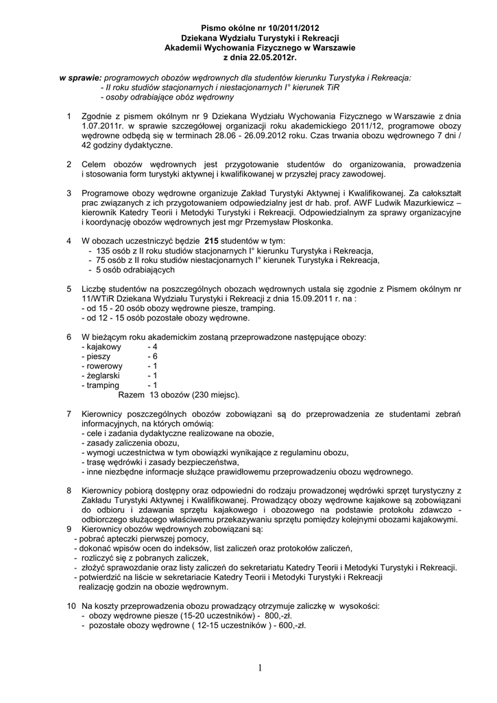 Pismo okólne nr 10/2011/2012 Dziekana Wydziału Turystyki i Rekreacji Akademii Wychowania Fizycznego w Warszawie z dnia 22.05.2012r. w sprawie: programowych obozów wędrownych dla studentów kierunku Turystyka i Rekreacja: - II roku studiów stacjonarnych i niestacjonarnych I° kierunek TiR - osoby odrabiające obóz wędrowny 1 Zgodnie z pismem okólnym nr 9 Dziekana Wydziału Wychowania Fizycznego w Warszawie z dnia 1.07.2011r. w sprawie szczegółowej organizacji roku akademickiego 2011/12, programowe obozy wędrowne odbędą się w terminach 28.06 - 26.09.2012 roku. Czas trwania obozu wędrownego 7 dni / 42 godziny dydaktyczne. 2 Celem obozów wędrownych jest przygotowanie studentów do organizowania, prowadzenia i stosowania form turystyki aktywnej i kwalifikowanej w przyszłej pracy zawodowej. 3 Programowe obozy wędrowne organizuje Zakład Turystyki Aktywnej i Kwalifikowanej. Za całokształt prac związanych z ich przygotowaniem odpowiedzialny jest dr hab. prof. AWF Ludwik Mazurkiewicz – kierownik Katedry Teorii i Metodyki Turystyki i Rekreacji. Odpowiedzialnym za sprawy organizacyjne i koordynację obozów wędrownych jest mgr Przemysław Płoskonka. 4 W obozach uczestniczyć będzie 215 studentów w tym: - 135 osób z II roku studiów stacjonarnych I° kierunku Turystyka i Rekreacja, - 75 osób z II roku studiów niestacjonarnych I° kierunek Turystyka i Rekreacja, - 5 osób odrabiających 5 Liczbę studentów na poszczególnych obozach wędrownych ustala się zgodnie z Pismem okólnym nr 11/WTiR Dziekana Wydziału Turystyki i Rekreacji z dnia 15.09.2011 r. na : - od 15 - 20 osób obozy wędrowne piesze, tramping. - od 12 - 15 osób pozostałe obozy wędrowne. 6 W bieżącym roku akademickim zostaną przeprowadzone następujące obozy: - kajakowy -4 - pieszy -6 - rowerowy -1 - żeglarski -1 - tramping -1 Razem 13 obozów (230 miejsc). 7 Kierownicy poszczególnych obozów zobowiązani są do przeprowadzenia ze studentami zebrań informacyjnych, na których omówią: - cele i zadania dydaktyczne realizowane na obozie, - zasady zaliczenia obozu, - wymogi uczestnictwa w tym obowiązki wynikające z regulaminu obozu, - trasę wędrówki i zasady bezpieczeństwa, - inne niezbędne informacje służące prawidłowemu przeprowadzeniu obozu wędrownego. Kierownicy pobiorą dostępny oraz odpowiedni do rodzaju prowadzonej wędrówki sprzęt turystyczny z Zakładu Turystyki Aktywnej i Kwalifikowanej. Prowadzący obozy wędrowne kajakowe są zobowiązani do odbioru i zdawania sprzętu kajakowego i obozowego na podstawie protokołu zdawczo odbiorczego służącego właściwemu przekazywaniu sprzętu pomiędzy kolejnymi obozami kajakowymi. 9 Kierownicy obozów wędrownych zobowiązani są: - pobrać apteczki pierwszej pomocy, - dokonać wpisów ocen do indeksów, list zaliczeń oraz protokołów zaliczeń, - rozliczyć się z pobranych zaliczek, - złożyć sprawozdanie oraz listy zaliczeń do sekretariatu Katedry Teorii i Metodyki Turystyki i Rekreacji. - potwierdzić na liście w sekretariacie Katedry Teorii i Metodyki Turystyki i Rekreacji realizację godzin na obozie wędrownym. 8 10 Na koszty przeprowadzenia obozu prowadzący otrzymuje zaliczkę w wysokości: - obozy wędrowne piesze (15-20 uczestników) - 800,-zł. - pozostałe obozy wędrowne ( 12-15 uczestników ) - 600,-zł. 1 Wydatki obejmują: - śluzowanie, - cumowanie w portach, - opłaty za wstęp na teren Parków Narodowych, - opłaty za wstęp do muzeum, - rezerwę na nieprzewidziane wydatki ( w tym uzupełnienie butli gazowych). 11 Prowadzący obóz nie jest upoważniony do zaciągania zobowiązań w imieniu Uczelni innych niż wynikających z programu obozu. 12 Pracownikom przysługuje zwrot kosztów przejazdu, zakwaterowania i diet zgodnie z aktualnym rozporządzeniem Ministra Pracy i Polityki Społecznej oraz obowiązującym w roku akademickim 2011/12 Zarządzeniem Kanclerza Akademii Wychowania Fizycznego Józefa Piłsudskiego w Warszawie. 13 Wymienionym w piśmie okólnym pracownikom Uczelni Dziekan Wydziału Turystyki i Rekreacji wystawi delegacje służbowe: PROWADZĄCY TERMIN 1. dr hab. prof. AWF Stanisław Piekarski 2. dr Janusz Matusiak 3. dr Jerzy Chełmecki 1-6.08.2012 7-13.08.2012 pieszy 7-13.07.2012 13-19.07.2012 kajakowy 30.06-7.07.2012 kajakowy 4. dr Jacek Klawender 5. dr Artur Kieszek 6. dr Joanna Kalecińska 7. dr Joanna Kalecińska 8. mgr Katarzyna Dzioban 9. mgr Przemysław Płoskonka LP. 10. mgr Przemysław Płoskonka 11. mgr Artur Bosek 27.06-03.07.2012 pieszy 16-22.07. 2012 pieszy 20-26.07.2012 pieszy 30.06-6.07.2012 żeglarstwo 1-7.09.2012 pieszy 19-25.07.2012 kajakowy 6-13.09.2012 tramping 9-15.07.2012 rowerowy TRASA Warszawa – Olsztynek Olsztynek- Warszawa – Waplewo Warszawa – Suwałki – Stary Folwark - Suwałki – Warszawa Warszawa – Giżycko- Piękna Góra - Suwałki – Stary Folwark - Suwałki – Warszawa (transport kajaków) Warszawa – Nowy Targ – Szczawnica – Nowy Targ - Warszawa Warszawa – Sanok – Ustrzyki Dolne – Sanok Warszawa Warszawa – Kościelisko - Warszawa Warszawa- Giżycko- Warszawa Warszawa - Szklarska Poręba - Warszawa Warszawa – Suwałki – Stary Folwark - Piękna Góra - Giżycko – Warszawa (transport kajaków) Warszawa – Monastir – Warszawa Warszawa – Kazimierz Dolny / Przemyśl Warszawa 14. Kwestor AWF przygotuje dla każdego kierownika obozu zaliczki. PROWADZĄCY L.P. 1. dr hab. prof. AWF Stanisław Piekarski 2. dr Janusz Matusiak 3. 4. 5. 6. 7. 8. 9. 10. 11. dr Jerzy Chełmecki dr Jacek Klawender dr Artur Kieszek dr Joanna Kalecińska dr Joanna Kalecińska mgr Katarzyna Dzioban mgr Przemysław Płoskonka mgr Przemysław Płoskonka mgr Artur Bosek 2 – TERMIN KWOTA ZALICZKI 1-6.08.2012 7-13.08.2012 7-13.07.2012 13-19.2012 30.06-7.07.2012 27.06-03.07.2012 16-22.07. 2012 20-26.07.2012 30.06-6.07.2012 1-7.09.2012 19-25.07.2012 6-13.09.2012 9-15.07.2012 800,800,600,600,600,800,800,800,600,800,600,800,600,- 15. Zapisy studentów na obozy w