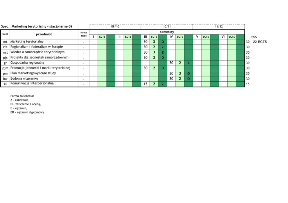 I II III IV V 255 mt Marketing terytorialny O 30 22 ECTS rfe