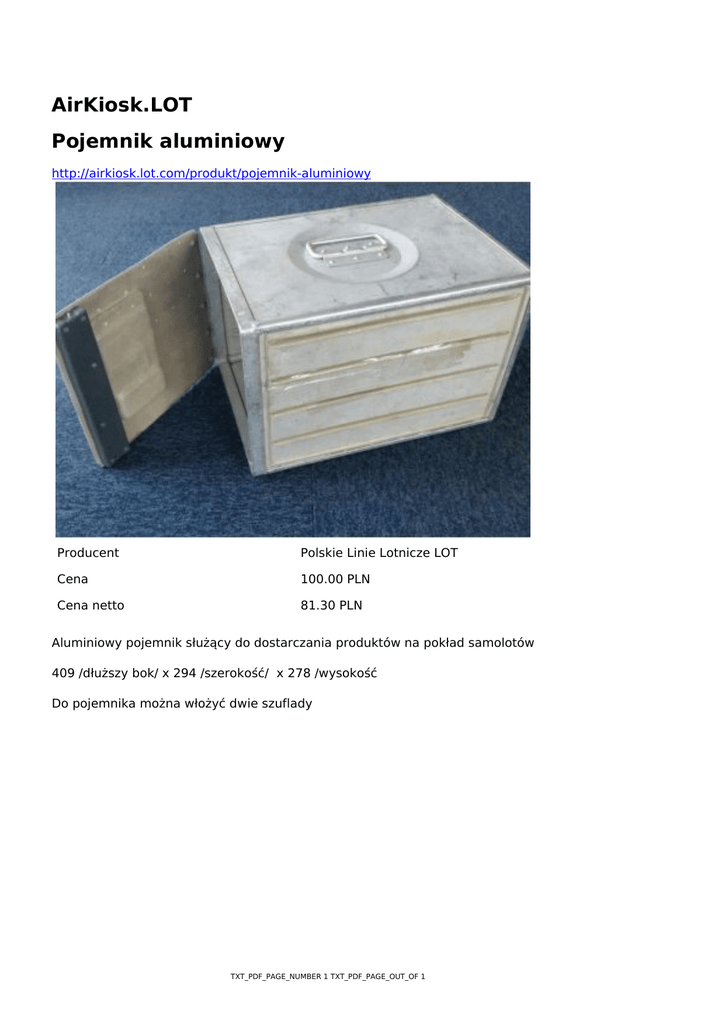 AirKiosk.LOT Pojemnik aluminiowy http://airkiosk.lot.com/produkt/pojemnik-aluminiowy Producent Polskie Linie Lotnicze LOT Cena 100.00 PLN Cena netto 81.30 PLN Aluminiowy pojemnik służący do dostarczania produktów na pokład samolotów 409 /dłuższy bok/ x 294 /szerokość/ x 278 /wysokość Do pojemnika można włożyć dwie szuflady TXT_PDF_PAGE_NUMBER 1 TXT_PDF_PAGE_OUT_OF 1