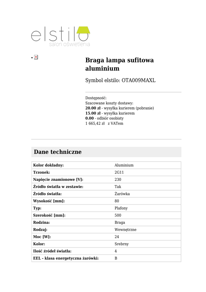 Braga lampa sufitowa aluminium ● Symbol elstilo: OTA009MAXL Dostępność: Szacowane koszty dostawy: 20.00 zł - wysyłka kurierem (pobranie) 15.00 zł - wysyłka kurierem 0.00 - odbiór osobisty 1 665,42 zł z VATem Dane techniczne Kolor dokładny: Aluminium Trzonek: 2G11 Napięcie znamionowe [V]: 230 Źródło światła w zestawie: Tak Źródło światła: Żarówka Wysokość [mm]: 80 Typ: Plafony Szerokość [mm]: 500 Rodzina: Braga Rodzaj: Wewnętrzne Moc [W]: 24 Kolor: Srebrny Ilość źródeł światła: 4 EEL - klasa energetyczna żarówki: B