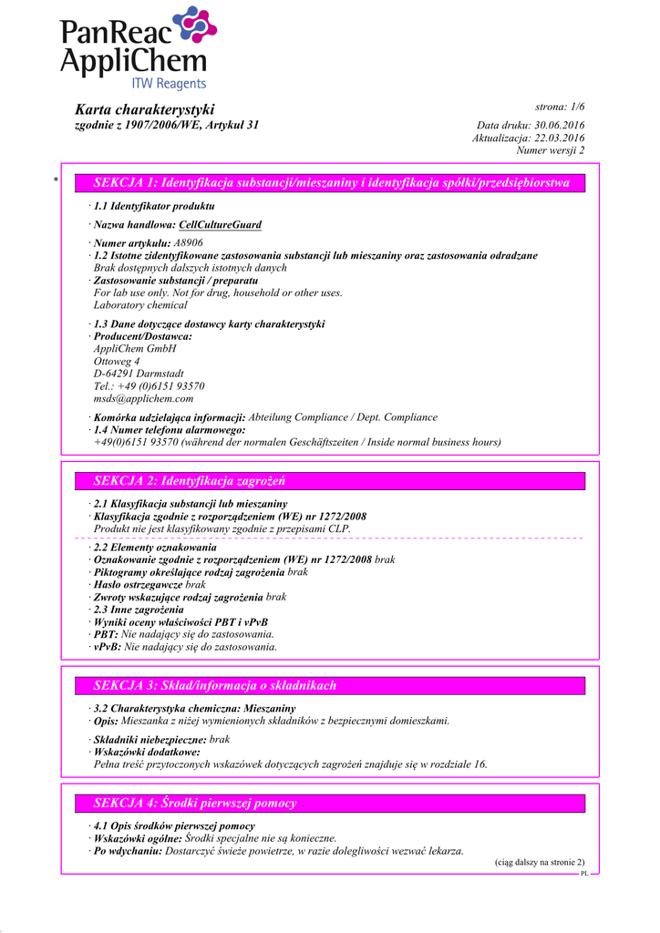 43.0 strona: 1/6 Karta charakterystyki zgodnie z 1907/2006/WE, Artykuł 31 * Data druku: 30.06.2016 Aktualizacja: 22.03.2016 Numer wersji 2 SEKCJA 1: Identyfikacja substancji/mieszaniny i identyfikacja spółki/przedsiębiorstwa · 1.1 Identyfikator produktu · Nazwa handlowa: CellCultureGuard · Numer artykułu: A8906 · 1.2 Istotne zidentyfikowane zastosowania substancji lub mieszaniny oraz zastosowania odradzane Brak dostępnych dalszych istotnych danych · Zastosowanie substancji / preparatu For lab use only. Not for drug, household or other uses. Laboratory chemical · 1.3 Dane dotyczące dostawcy karty charakterystyki · Producent/Dostawca: AppliChem GmbH Ottoweg 4 D-64291 Darmstadt Tel.: +49 (0)6151 93570 [email protected] · Komórka udzielająca informacji: Abteilung Compliance / Dept. Compliance · 1.4 Numer telefonu alarmowego: +49(0)6151 93570 (während der normalen Geschäftszeiten / Inside normal business hours) SEKCJA 2: Identyfikacja zagrożeń · 2.1 Klasyfikacja substancji lub mieszaniny · Klasyfikacja zgodnie z rozporządzeniem (WE) nr 1272/2008 Produkt nie jest klasyfikowany zgodnie z przepisami CLP. · 2.2 Elementy oznakowania · Oznakowanie zgodnie z rozporządzeniem (WE) nr 1272/2008 brak · Piktogramy określające rodzaj zagrożenia brak · Hasło ostrzegawcze brak · Zwroty wskazujące rodzaj zagrożenia brak · 2.3 Inne zagrożenia · Wyniki oceny właściwości PBT i vPvB · PBT: Nie nadający się do zastosowania. · vPvB: Nie nadający się do zastosowania. SEKCJA 3: Skład/informacja o składnikach · 3.2 Charakterystyka chemiczna: Mieszaniny · Opis: Mieszanka z niżej wymienionych składników z bezpiecznymi domieszkami. · Składniki niebezpieczne: brak · Wskazówki dodatkowe: Pełna treść przytoczonych wskazówek dotyczących zagrożeń znajduje się w rozdziale 16. SEKCJA 4: Środki pierwszej pomocy · 4.1 Opis środków pierwszej pomocy · Wskazówki ogólne: Środki specjalne nie są konieczne. · Po wdychaniu: Dostarczyć świeże powietrze, w razie dolegliwości wezwać lekarza. (ciąg dalszy na stronie 2) PL 43.0 strona: 2/6 Karta charakterystyki zgodnie z 1907/2006/WE, Artykuł 31 Data druku: 30.06.2016 Aktualizacja: 22.03.2016 Numer wersji 2 Nazwa handlowa: CellCultureGuard (ciąg dalszy od strony 1) · Po styczności ze skórą: Zmyć dużą ilością wody. W przypadku trwałego podrażnienia skóry zgłosić się do lekarza. · Po styczności z okiem: Płukać oczy z otwartą powieką przez kilka minut pod bieżącą wodą. Odwieźć do lekarza. · Po przełknięciu: Przepłukać jamę ustną i obficie popić wodą. Przy trwałych dolegliwościach porozumieć się z lekarzem. · 4.2 Najważniejsze ostre i opóźnione objawy oraz skutki narażenia Brak dostępnych dalszych istotnych danych · 4.3 Wskazania dotyczące wszelkiej natychmiastowej pomocy lekarskiej i szczególnego postępowania z poszkodowanym Brak dostępnych dalszych istotnych danych SEKCJA 5: Postępowanie w przypadku pożaru · 5.1 Środki gaśnicze · Przydatne środki gaśnicze: Woda, Dwutlenek węgla (CO2), Piana, Suchy proszek · 5.2 Szczególne zagrożenia związane z substancją lub mieszaniną Sbstancja niepalna. W razie pożaru możliwe powstawanie niebezpiecznych palnych gazów lub par. tlenki węgla (CO, CO2) · 5.3 Informacje dla straży pożarnej · Specjalne wyposażenie ochronne: Nosić urządzenie ochrony dróg oddechowych niezależnie od powietrza otoczenia. · Inne dane Pozostałości po pożarze i skażona woda muszą być usunięte zgodnie z przepisami. SEKCJA 6: Postępowanie w przypadku niezamierzonego uwolnienia do środowiska · 6.1 Indywidualne środki ostrożności, sprzęt ochronny i procedury w sytuacjach awaryjnych Unikać zanieczyszczenia substancją. · 6.2 Środki ostrożności w zakresie ochrony środowiska: Nie dopuścić do przeniknięcia do kanalizacji /wód powierzchniowych /wód gruntowych. · 6.3 Metody i materiały zapobiegające rozprzestrzenianiu się skażenia i służące do usuwania skażenia: Zebrać za pomocą materiału wiążącego ciecze (piasek, ziemia okrzemkowa, materiał wiążący kwasy, materiał wiążący uniwersalny, trociny). Materiał zebrany usunąć w sposób zgodny z przepisami. · 6.4 Odniesienia do innych sekcji Informacje na temat bezpiecznej obsługi patrz rozdział 7. Informacje na temat osobistego wyposażenia ochronnego patrz rozdział 8. Informacje na temat utylizacji patrz rozdział 13. SEKCJA 7: Postępowanie z substancjami i mieszaninami oraz ich magazynowanie · 7.1 Środki ostrożności dotyczące bezpiecznego postępowania Środki specjalne nie są konieczne. · Wskazówki dla ochrony przeciwpożarowej i przeciwwybuchowej: Nie są potrzebne szczególne zabiegi. · 7.2 Warunki bezpiecznego magazynowania, w tym informacje dotyczące wszelkich wzajemnych niezgodności · Składowanie: · Wymagania w stosunku do pomieszczeń składowych i zbiorników: Brak szczególnych wymagań. · Wskazówki odnośnie wspólnego składowania: Nie konieczne. · Dalsze wskazówki odnośnie warunków składowania: Zbiornik trzymać zamknięty. · Zalecana temperatura składowania: -20 °C · Klasa składowania: 10-13 (ciąg dalszy na stronie 3) PL 43.0 strona: 3/6 Karta charakterystyki zgodnie z 1907/2006/WE, Artykuł 31 Data druku: 30.06.2016 Aktualizacja: 22.03.2016 Numer wersji 2 Nazwa handlowa: CellCultureGuard (ciąg dalszy od strony 2) · 7.3 Szczególne zastosowanie(-a) końcowe Brak dostępnych dalszych istotnych danych SEKCJA 8: Kontrola narażenia/środki ochrony indywidualnej · Dodatkowe wskazówki dla wykonania urządzeń technicznych: Brak dalszych danych, patrz punkt 7. · 8.1 Parametry dotyczące kontroli · Składniki wraz z kontrolowanymi wartościami granicznymi zależnymi od miejsca pracy: Produkt nie zawiera znaczących ilości materiałów, których wartości graniczne musiałyby być kontrolowane pod kątem warunków miejsca pracy. · Wskazówki dodatkowe: Podstawą były aktualnie obowiązujące w