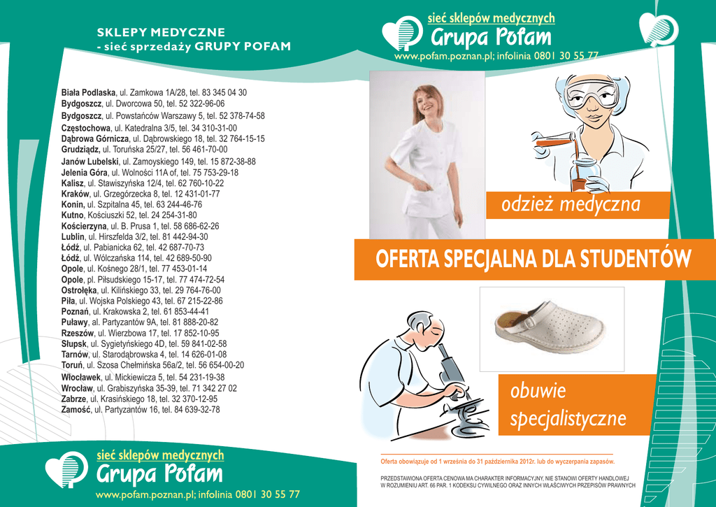SKLEPY MEDYCZNE - sieć sprzedaży GRUPY POFAM Biała Podlaska, ul. Zamkowa 1A/28, tel. 83 345 04 30 Bydgoszcz, ul. Dworcowa 50, tel. 52 322-96-06 Bydgoszcz, ul. Powstańców Warszawy 5, tel. 52 378-74-58 Częstochowa, ul. Katedralna 3/5, tel. 34 310-31-00 Dąbrowa Górnicza, ul. Dąbrowskiego 18, tel. 32 764-15-15 Grudziądz, ul. Toruńska 25/27, tel. 56 461-70-00 Janów Lubelski, ul. Zamoyskiego 149, tel. 15 872-38-88 Jelenia Góra, ul. Wolności 11A of, tel. 75 753-29-18 Kalisz, ul. Stawiszyńska 12/4, tel. 62 760-10-22 Kraków, ul. Grzegórzecka 8, tel. 12 431-01-77 Konin, ul. Szpitalna 45, tel. 63 244-46-76 Kutno, Kościuszki 52, tel. 24 254-31-80 Kościerzyna, ul. B. Prusa 1, tel. 58 686-62-26 Lublin, ul. Hirszfelda 3/2, tel. 81 442-94-30 Łódź, ul. Pabianicka 62, tel. 42 687-70-73 Łódź, ul. Wólczańska 114, tel. 42 689-50-90 Opole, ul. Kośnego 28/1, tel. 77 453-01-14 Opole, pl. Piłsudskiego 15-17, tel. 77 474-72-54 Ostrołęka, ul. Kilińskiego 33, tel. 29 764-76-00 Piła, ul. Wojska Polskiego 43, tel. 67 215-22-86 Poznań, ul. Krakowska 2, tel. 61 853-44-41 Puławy, al. Partyzantów 9A, tel. 81 888-20-82 Rzeszów, ul. Wierzbowa 17, tel. 17 852-10-95 Słupsk, ul. Sygietyńskiego 4D, tel. 59 841-02-58 Tarnów, ul. Starodąbrowska 4, tel. 14 626-01-08 Toruń, ul. Szosa Chełmińska 56a/2, tel. 56 654-00-20 Włocławek, ul. Mickiewicza 5, tel. 54 231-19-38 Wrocław, ul. Grabiszyńska 35-39, tel. 71 342 27 02 Zabrze, ul. Krasińskiego 18, tel. 32 370-12-95 Zamość, ul. Partyzantów 16, tel. 84 639-32-78 odzież medyczna OFERTA SPECJALNA DLA STUDENTÓW obuwie specjalistyczne Oferta obowiązuje od 1 września do 31 października 2012r. lub do wyczerpania zapasów. PRZEDSTAWIONA OFERTA CENOWA MA CHARAKTER INFORMACYJNY, NIE STANOWI OFERTY HANDLOWEJ W ROZUMIENIU ART. 66 PAR. 1 KODEKSU CYWILNEGO ORAZ INNYCH WŁAŚCIWYCH PRZEPISÓW PRAWNYCH infolinia 801 30 55 77; www.pofam.poznan.pl Fartuch VE 40 rozmiary: 36-48 ODZIEŻ MEDYCZNA /fartuchy, żakiety/ tkanina: 50% bawełna, 50% poliester zł 2 8 o d 1 6 d cena o Żakiet VE 02 rozmiary: 36-48 tkanina: 50% bawełna, 50% poliester OBUWIE SPECJALISTYCZNE * % 0 1 T A RAB Fartuch damski Fa 41.1 rozmiary: 36-48 model 339Dz tkanina: 50% bawełna, 50% poliester Fartuch męski Fa 47.1 rozmiary: 48-58 tkanina: 50% bawełna, 50% poliester model 020A Żakiet ZA 16.1 rozmiary: 36-48 tkanina: 50% bawełna, 50% poliester www. pofam.poznan.pl * rabat na obuwie udzielany jest w przypadku jednoczesnego zakupu odzieży OFERTA uzupełniająca: stetoskopy (lekarskie, pielęgniarskie), rękawice diagnostyczne, czepki, latarki diagnostyczne, młotki neurologiczne, stazy automatyczne, płyny dezynfekcyjne www. pofam.poznan.pl