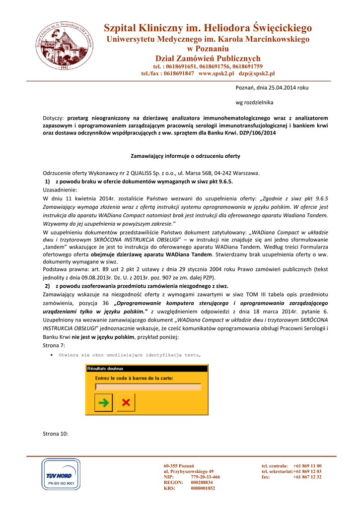 Szpital Kliniczny im. Heliodora Święcickiego Uniwersytetu Medycznego im. Karola Marcinkowskiego w Poznaniu Dział Zamówień Publicznych tel. : 0618691651, 0618691756, 0618691759 tel./fax : 0618691847 www.spsk2.pl [email protected] Poznań, dnia 25.04.2014 roku wg rozdzielnika Dotyczy: przetarg nieograniczony na dzierżawę analizatora immunohematologicznego wraz z analizatorem zapasowym i oprogramowaniem zarządzającym pracownią serologii immunotransfuzjologicznej i bankiem krwi oraz dostawa odczynników współpracujących z ww. sprzętem dla Banku Krwi. DZP/106/2014 Zamawiający informuje o odrzuceniu oferty Odrzucenie oferty Wykonawcy nr 2 QUALISS Sp. z o.o., ul. Marsa 56B, 04-242 Warszawa. 1) z powodu braku w ofercie dokumentów wymaganych w siwz pkt 9.6.5. Uzasadnienie: W dniu 11 kwietnia 2014r. zostaliście Państwo wezwani do uzupełnienia oferty: „Zgodnie z siwz pkt 9.6.5 Zamawiający wymaga złożenia wraz z ofertą instrukcji systemu oprogramowania w języku polskim. W ofercie jest instrukcja dla aparatu WADiana Compact natomiast brak jest instrukcji dla oferowanego aparatu Wadiana Tandem. Wzywamy do jej uzupełnienia w powyższym zakresie.” W uzupełnieniu dokumentów przedstawiliście Państwo dokument zatytułowany: „WADiana Compact w układzie dwu i trzytorowym SKRÓCONA INSTRUKCJA OBSŁUGI” – w instrukcji nie znajduje się ani jedno sformułowanie „tandem” wskazujące że jest to instrukcja do oferowanego aparatu WADiana Tandem. Według treści Formularza ofertowego oferta obejmuje dzierżawę aparatu WADiana Tandem. Stwierdzamy brak uzupełnienia oferty o ww. dokumenty wymagane w siwz. Podstawa prawna: art. 89 ust 2 pkt 2 ustawy z dnia 29 stycznia 2004 roku Prawo zamówień publicznych (tekst jednolity z dnia 09.08.2013r. Dz. U. z 2013r. poz. 907 ze zm. dalej PZP). 2) z powodu zaoferowania przedmiotu zamówienia niezgodnego z siwz. Zamawiający wskazuje na niezgodność oferty z wymogami zawartymi w siwz TOM III tabela opis przedmiotu zamówienia, pozycja 36 „Oprogramowanie komputera sterującego i oprogramowania zarządzającego urządzeniami tylko w języku polskim.” z uwzględnieniem odpowiedzi z dnia 18 marca 2014r. pytanie 6. Uzupełniony na wezwanie zamawiającego dokument „WADiana Compact w układzie dwu i trzytorowym SKRÓCONA INSTRUKCJA OBSŁUGI” jednoznacznie wskazuje, że cześć komunikatów oprogramowania obsługi Pracowni Serologii i Banku Krwi nie jest w języku polskim, przykład poniżej: Strona 7: Strona 10: 60-355 Poznań ul. Przybyszewskiego 49 NIP: 779-20-33-466 REGON: 000288834 KRS: 0000001852 tel. centrala: +61 869 11 00 tel. sekretariat:+61 869 12 03 fax: +61 867 12 32 Podstawa prawna: art. 89 ust 2 pkt 2 ustawy z dnia 29 stycznia 2004 roku Prawo zamówień publicznych (tekst jednolity z dnia 09.08.2013r. Dz. U. z 2013r. poz. 907 ze zm. dalej PZP). 3) z powodu braku wyrażenia zgody na poprawę formularza ofertowego w pozycjach 1.1 oraz 1.2 po wezwaniu przez Zamawiającego w dniu 11 kwietnia 2014r do wyrażenia zgody na poprawe omyłek w ofercie na podstawie art. 87 ust 2 pkt 3 ustawy z dnia 29 stycznia 2004 roku Prawo zamówień publicznych (tekst jednolity z dnia 09.08.2013r. Dz. U. z 2013r. poz. 907 ze zm. dalej PZP). Państwa wyjaśnienia nie wpływają na nasze stanowisko w tej sprawie – tym bardziej że nie skorzystaliście Państwo ze środków ochrony prawnej zawartych w PZP na czynność wezwania do wyrażenia zgody na poprawę oferty. Podstawa prawna: art. 89 ust 2 pkt 7 ustawy z dnia 29 stycznia 2004 roku Prawo zamówień publicznych (tekst jednolity z dnia 09.08.2013r. Dz. U. z 2013r. poz. 907 ze zm. dalej PZP). Zamawiający informuje o wyborze oferty najkorzystniejszej Oferta najkorzystniejsza: Wykonawca nr 1 DiaHem AG Diagnostics Products, Schlossertrasse 4, 8180 Bulbach, Szwajcaria Cena: 587 220,73 zł brutto, 540 370,40 zł netto Uzasadnienie wyboru : NAJKORZYSTNIEJSZA OFERTA Umowa zostanie podpisana w trybie art. 94 ust 1 ustawy z dnia 29 stycznia 2004 r. - Prawo zamówień publicznych (tekst jednolity z dnia 09.08.2013r. Dz. U. z 2013, poz. 907 ze zm.). Zestawienie złożonych ofert L.p 1 nazwa, adres DiaHem AG Diagnostics Products Schlossertrasse 4, 8180 Bulbach, Szwajcaria 2 QUALISS SP. Z O.O. uL. Marsa 56B, 04-242 Warszawa Kwota szacunkowa: 588 390,80 zł brutto cena zł brutto 587 220,73 zł brutto 540 370,40 zł netto odczytana: 558 079,75 zł brutto poprawiona do 622 245,56 zł brutto