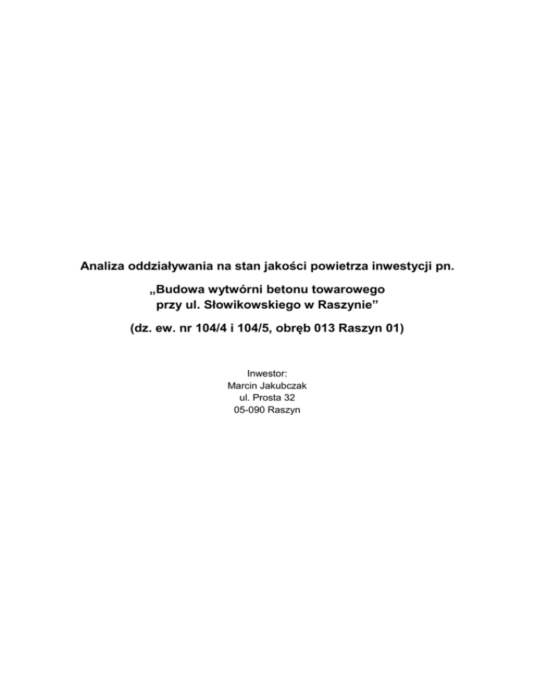 Analiza oddziaływania na stan jakości powietrza inwestycji pn. „Budowa wytwórni betonu towarowego przy ul. Słowikowskiego w Raszynie” (dz. ew. nr 104/4 i 104/5, obręb 013 Raszyn 01) Inwestor: Marcin Jakubczak ul. Prosta 32 05-090 Raszyn 2 SPIS TREŚCI: 1. Metodyka i podstawy prawne oceny 2. Warunki meteorologiczne 3. Aerodynamiczna szorstkość terenu z0 4. Aktualny stan jakości powietrza 5. Analiza oddziaływania przedsięwzięcia na stan powietrza w fazie budowy 6. Analiza oddziaływania przedsięwzięcia na stan powietrza w fazie eksploatacji 6.1. Charakterystyka źródeł emisji 6.2. Omówienie wyników obliczeń rozkładu stężeń substancji w powietrzu 7. Analiza oddziaływania przedsięwzięcia na stan powietrza w fazie likwidacji 3 1. Metodyka i podstawy prawne oceny Raport oddziaływania na środowisko projektowanej inwestycji w zakresie oddziaływania na stan jakości powietrza został opracowany na podstawie: ustawy z dnia 3 października 2008 r. o udostępnianiu informacji o środowisku i jego ochronie, udziale społeczeństwa w ochronie środowiska oraz o ocenach oddziaływania na środowisko (Dz. U. z 2013 r. poz. 1235, z późn. zm.); ustawy z dnia 27 kwietnia 2001 r. Prawo ochrony środowiska (Dz. U. z 2016 r. poz.672, z późn. zm.); rozporządzenia Ministra Środowiska z dnia 26 stycznia 2010 r. w sprawie wartości odniesienia dla niektórych substancji w powietrzu (Dz. U. Nr 16, poz. 87); rozporządzenia Ministra Środowiska z dnia 24 sierpnia 2012 r. w sprawie poziomów niektórych substancji w powietrzu (Dz. U. z 2012 r. poz. 1031); aktualnego stanu jakości powietrza w rejonie inwestycji; planu sytuacyjnego terenu i otoczenia inwestycji w skali 1:500; założeń projektowych i eksploatacyjnych inwestora. Zasięg oddziaływania substancji emitowanych z projektowanego przedsięwzięcia określono zgodnie z załącznikiem nr 3 do rozporządzenia Ministra Środowiska z dnia 26 stycznia 2010 r. w sprawie wartości odniesienia dla niektórych substancji w powietrzu (określającym referencyjne metodyki modelowania poziomów substancji w powietrzu. Jako kryterium uciążliwości przyjęto zgodnie z rozporządzeniem Ministra Środowiska z dnia 26 stycznia 2010 r. w sprawie wartości odniesienia dla niektórych substancji w powietrzu, że nie będą przekraczane wartości odniesienia określone w załączniku nr 1. Uznaje się, że wartość odniesienia substancji w powietrzu uśredniona dla 1 godziny jest dotrzymana, jeżeli wartość ta nie jest przekraczana więcej niż przez 0,274 % czasu w roku dla dwutlenku siarki oraz więcej niż 0,2 % czasu w roku dla pozostałych substancji. Przy obliczeniach stężeń powodowanych przez emisję substancji posługiwano się licencjonowanym programem Ryszarda Samoć – „Operat FB” dla Windows. W odległości 30 x Xmm od emitorów nie znajdują się obszary parków narodowych i obszary ochrony uzdrowiskowej. Wartości odniesienia dla substancji emitowanych do powietrza z terenu projektowanej inwestycji dla terenu kraju oraz poziom dopuszczalny pyłu zawieszonego PM2,5, oznaczenie numeryczne tych substancji oraz okresy, dla których uśrednione są wartości odniesienia, 4 z wyłączeniem obszarów parków narodowych i obszarów ochrony uzdrowiskowej przedstawia następująca tabela 1: Tabela 1. Wartości odniesienia w µg/m3 i uśrednione dla okresu roku 1 godziny kalendarzowego 200 40 Numer CAS Nazwa substancji Dwutlenek azotu 10102-44-0 Dwutlenek siarki 7446-09-5 350 20 Tlenek węgla 630-08-0 30 000 - Pył zawieszony PM10 - 280 40 Pył zawieszony PM2,5 - - 25 Węglowodory alifatyczne - 3000 1000 2. Warunki meteorologiczne Dane meteorologiczne dla omawianego terenu przyjęto z „Katalogu danych meteorologicznych" dla stacji Warszawa - Okęcie. Najwięcej wiatrów występuje z kierunku zachodniego 17%. Średnia prędkość wiatrów na omawianym terenie wynosi 3 – 4 m/s. Cisze atmosferyczne i wiatry do 1 m/s stanowią zaledwie 10%. Na rozprzestrzenianie się zanieczyszczeń wpływa również temperatura otoczenia. Lipiec jest miesiącem, w którym odnotowywane są najwyższe temperatury - średnia temperatura miesiąca 18,2 °C. Najniższe temperatury odnotowywane są natomiast w styczniu - średnia temperatura miesiąca 5,6 °C. Średnia roczna temperatura powietrza wynosi 7,6 °C. 3. Aerodynamiczna szorstkość terenu Współczynnik aerodynamicznej szorstkości terenu wyznaczono na podstawie mapy topograficznej według wzoru: z0 1 F F C z 0C C gdzie: z0 - średnia wartość współczynnika aerodynamicznej szorstkości terenu na obszarze objętym obliczeniami (m) z0C - średnia wartość współczynnika aerodynamicznej szorstkości terenu na obszarze o danym typie pokrycia terenu (m) 5 F - powierzchnia obszaru objętego obliczeniami (m2) Fc - powierzchnia obszaru o danym typie pokrycia terenu (m2) Współczynnik aerodynamicznej szorstkości terenu przyjęto na poziomie z0 = 0,02 m. 4. Aktualny stan jakości powietrza Aktualny stan jakości powietrza określony został w piśmie Mazowieckiego Wojewódzkiego Inspektora Ochrony Środowiska i wynosi: dwutlenek azotu – 25,0 µg/m3 dwutlenek siarki – 6,0 µg/m3 pył zawieszony PM10 – 24 µg/m3 pył zawieszony PM2,5 – 19 µg/m3 tlenek węgla – 300,0 µg/m3 benzen – 1,0 µg/m3 ołów – 0,05 µg/m3 Ww. pismo stanowi Załącznik 1 do niniejszego opracowania. 5. Analiza oddziaływania przedsięwzięcia na stan powietrza w fazie budowy W fazie budowy na terenie projektowanej inwestycji nie będzie źródeł zorganizowanej emisji substancji do powietrza. Budowa przedmiotowego przedsięwzięcia będzie polegała na pracach porządkowych i pracach montażowo-instalacyjnych potrzebnych elementów. W trakcie prowadzonych prac w wyniku porywania przez wiatr może wystąpić emisja pyłów cementu, kruszywa i innych materiałów pylistych związanych z powadzeniem prac przy adaptacji terenu inwestycji. Prace prowadzone będą bez użycia ciężkiego sprzętu budowlanego