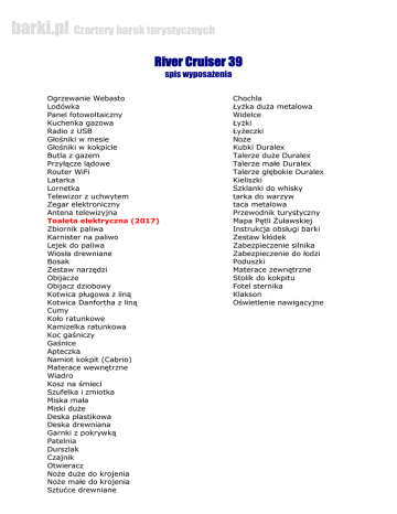 barki.pl Czartery barek turystycznych River Cruiser 39 spis wyposażenia Ogrzewanie Webasto Lodówka Panel fotowoltaiczny Kuchenka gazowa Radio z USB Głośniki w mesie Głośniki w kokpicie Butla z gazem Przyłącze lądowe Router WiFi Latarka Lornetka Telewizor z uchwytem Zegar elektroniczny Antena telewizyjna Toaleta elektryczna (2017) Zbiornik paliwa Karnister na paliwo Lejek do paliwa Wiosła drewniane Bosak Zestaw narzędzi Obijacze Obijacz dziobowy Kotwica pługowa z liną Kotwica Danfortha z liną Cumy Koło ratunkowe Kamizelka ratunkowa Koc gaśniczy Gaśnice Apteczka Namiot kokpit (Cabrio) Materace wewnętrzne Wiadro Kosz na śmieci Szufelka i zmiotka Miska mała Miski duże Deska plastikowa Deska drewniana Garnki z pokrywką Patelnia Durszlak Czajnik Otwieracz Noże duże do krojenia Noże małe do krojenia Sztućce drewniane Chochla Łyżka duża metalowa Widelce Łyżki Łyżeczki Noże Kubki Duralex Talerze duże Duralex Talerze małe Duralex Talerze głębokie Duralex Kieliszki Szklanki do whisky tarka do warzyw taca metalowa Przewodnik turystyczny Mapa Pętli Żuławskiej Instrukcja obsługi barki Zestaw kłódek Zabezpieczenie silnika Zabezpieczenie do łodzi Poduszki Materace zewnętrzne Stolik do kokpitu Fotel sternika Klakson Oświetlenie nawigacyjne
