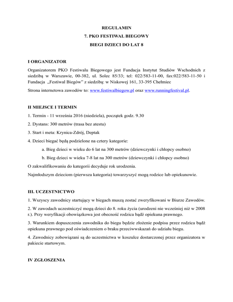 REGULAMIN 7. PKO FESTIWAL BIEGOWY BIEGI DZIECI DO LAT 8
