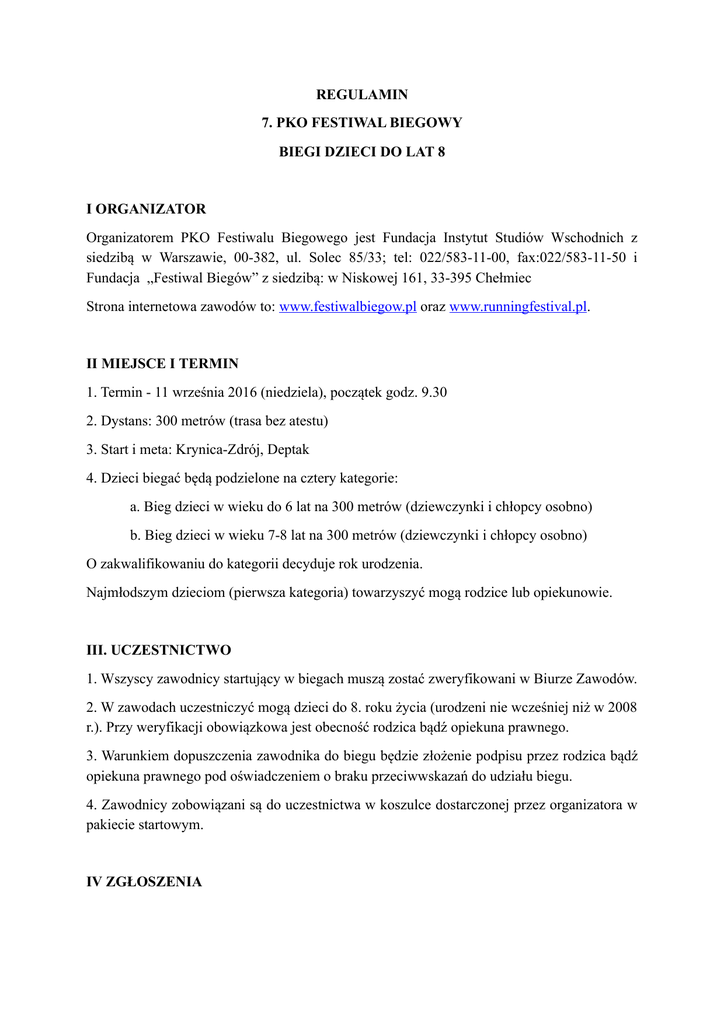 REGULAMIN 7. PKO FESTIWAL BIEGOWY BIEGI DZIECI DO LAT 8 I ORGANIZATOR Organizatorem PKO Festiwalu Biegowego jest Fundacja Instytut Studiów Wschodnich z siedzibą w Warszawie, 00-382, ul. Solec 85/33; tel: 022/583-11-00, fax:022/583-11-50 i Fundacja „Festiwal Biegów” z siedzibą: w Niskowej 161, 33-395 Chełmiec Strona internetowa zawodów to: www.festiwalbiegow.pl oraz www.runningfestival.pl. II MIEJSCE I TERMIN 1. Termin - 11 września 2016 (niedziela), początek godz. 9.30 2. Dystans: 300 metrów (trasa bez atestu) 3. Start i meta: Krynica-Zdrój, Deptak 4. Dzieci biegać będą podzielone na cztery kategorie: a. Bieg dzieci w wieku do 6 lat na 300 metrów (dziewczynki i chłopcy osobno) b. Bieg dzieci w wieku 7-8 lat na 300 metrów (dziewczynki i chłopcy osobno) O zakwalifikowaniu do kategorii decyduje rok urodzenia. Najmłodszym dzieciom (pierwsza kategoria) towarzyszyć mogą rodzice lub opiekunowie. III. UCZESTNICTWO 1. Wszyscy zawodnicy startujący w biegach muszą zostać zweryfikowani w Biurze Zawodów. 2. W zawodach uczestniczyć mogą dzieci do 8. roku życia (urodzeni nie wcześniej niż w 2008 r.). Przy weryfikacji obowiązkowa jest obecność rodzica bądź opiekuna prawnego. 3. Warunkiem dopuszczenia zawodnika do biegu będzie złożenie podpisu przez rodzica bądź opiekuna prawnego pod oświadczeniem o braku przeciwwskazań do udziału biegu. 4. Zawodnicy zobowiązani są do uczestnictwa w koszulce dostarczonej przez organizatora w pakiecie startowym. IV ZGŁOSZENIA Zgłoszenia przyjmowane są na stronie www.festiwalbiegow.pl. Istnieje możliwość zgłoszenia się do biegów Festiwalu bezpośrednio w biurze zawodów w dniu 9 - 11 września. V OPŁATY Udział w Biegach Dzieci 7. PKO Festiwalu Biegowego dla dzieci jest bezpłatny. VI KLASYFIKACJE Klasyfikacja wiekowa dziewczynek i chłopców do lat 6 oraz 7-8 lat. O zakwalifikowaniu do kategorii decyduje rok urodzenia. VII NAGRODY Zwycięzcy w klasyfikacjach wiekowych otrzymują nagrody według tabeli nagród 7. PKO Festiwalu Biegowego. VIII POSTANOWIENIA KOŃCOWE 1. Regulamin jest spójny z postanowieniami regulaminu Festiwalu Biegowego. 2. Ostateczna interpretacja regulaminu należy do Organizatorów.