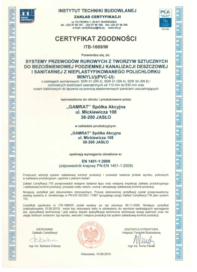 III" INSTYTUT TECHNIKI BUDOWLANEJ i ZAKŁAD CERTYFIKACJI ul. FILTROWA 1, 00-&11 WARSZAWA tel. (22) 57 96 167, (22)5796168, fax: (22) 57 96 295 Hnall: [email protected]ł, _.Itb.pl CERTYFIKAT AC"" ZGODNOŚCI ITB-1669/W Potwierdza się, że: SYSTEMY PRZEWODÓW RUROWYCH Z TWORZYW SZTUCZNYCH DO BEZCIŚNIENIOWEJ PODZIEMNEJ KANALIZACJI DESZCZOWEJ I SANITARNEJ Z NIEPLASTYFIKOWANEGO POLl(CHLORKU WINYLU)(PVC-U): rurach o szeregach wymiarowych: SDR 51 (SN 2), SDR 41 (SN 4), SDR 34 (SN 8) i nominalnych średnicach zewnętrznych od 110 mm do 630 mm oraz kielichowych do łączenia za pomocą elastomerowych pierścieni uszczelniających wprowadzone do obrołu i produkowane przez: "GAM RAT" Spółka Akcyjna ul. Mickiewicza 108 38-200 JASŁO w zakładzie produkcyjnym: "GAM RAT" Spólka Akcyjna ul. Mickiewicza 108 38-200 JASŁO spełniają wymagania określone w: EN 1401-1:2009 (odpowiednik krajowy PN-EN 1401-1:2009) Producent wdrożył system zakładowej kontroli produkcji w zakładzie produkcyjnym, zgodnie z planem badań. j prowadzi badania próbek wyrobu, pobranych Zakład Certyfikacji IT8 przeprowadził wstępne badania typu oraz wstępną inspekcję zakładu produkcyjnego i zakładowej kontroli produkcji, prowadzi stały nadzór, ocenę i akceptację zakładowej kontroli produkcji. Niniejszy certyfikat jest dokumentem dobrowolnym. Proces dObrowolnej certyfikacji został przeprowadzony według systemu 4, określonego w PN-EN ISO/lEC 17067 (przyjętego przęz Zakład Certyfikacji IT8 jako system 10). Certyfikat zgodności nr IT8-1669JW został wydany po raz pierwszy 09.11.2009. Niniejszy certyfikat (zaktualizowany 10.08.2015) może być stosowany tylko w odniesieniu do wyrobów spełniających wymagania ww. specyfikacji technicznej i jest ważny dopóki specyfikacja techniczna zachowuje swoją ważność oraz nie uległy istotnym zmianom: typ wyrobu, warunki i miejsce produkcji lub system zakładowej kontroli produkcji. KIEROWNIK Zakładu Certyfikacji c-bb.obo~ mgr inż. Barbara Dobosz Warszawa, 10.08.2015