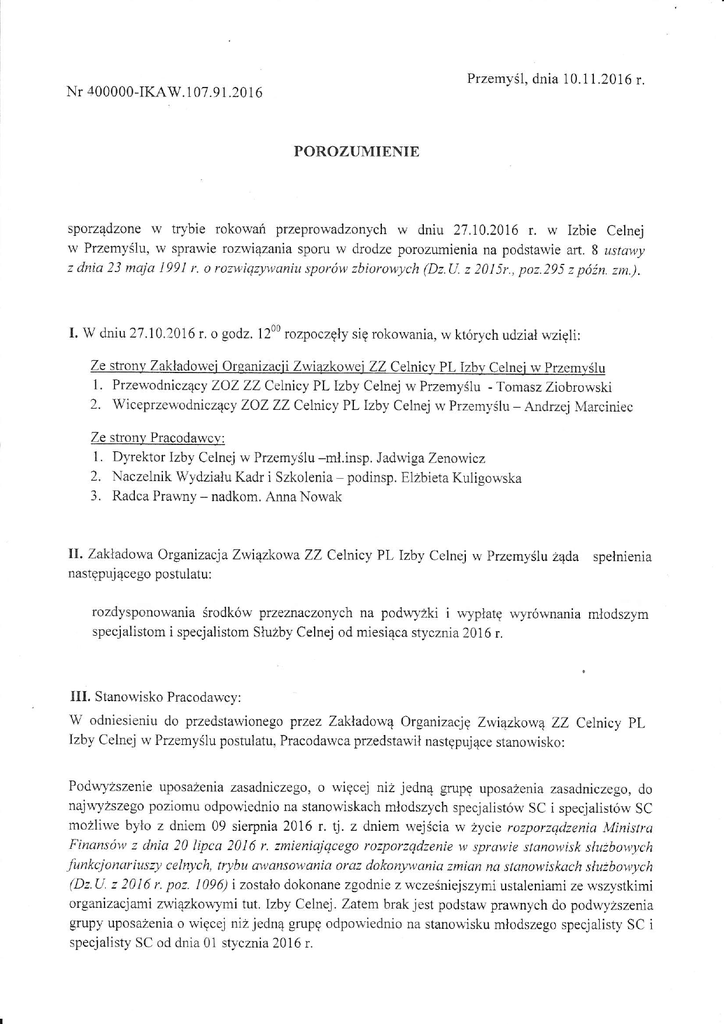 Nr 400000-IKAW. 1 07.91'20 Przemyśl, dnia 1ó 10. 1 1 .2016 r. POROZUMIENIE sporządzone w trybie rokowań przeprowadzonych w dniu 27.10.2016 r' w Izbie Celnej w Przemyślu' w sprawie rozwiązania sporu w drodze porozumienia na podstawie afi. 8 ustawy z dnia 23 maja 1991 r' o rozwiqzywaniu sporów zbiorowych (Dz.U. z 20}5r', poz.295 z późn. zn')' I. W dniu 27.10.2016 r. o godz' 12aa rozpoczęły się rokowania, w których udział wzięli: 1. Przewodniczący ZoZ ZZ CeLnicy PL Izby Celnej w Przemyślu - Tomasz Ziobrowski 2. Wiceprzewodniczący ZoZ ZZ Celnicy PL Izby Celnej w Przemyślu _ Andrzej Marciniec Ze strony Pracodawcv: 1 ' Dyrektor Izby Celnej w Przemyślu _mł.insp' Jadwiga Zęnowicz 2. Naczelnik Wydziału Kadr i Szko1enia _ podinsp. Elżbieta Kuligowska 3. Radca Prawny - nadkom. Anna Nowak II. Zakładowa otganizacja Związkowa ZZ Cellicy PL lzby Celnej w Przemyślu żąda spełnienia następującego postulatu: rozdysponowania środków przeznaczonych na podwyżki i wypłatę wyrównania młodszym specjalistom i specjalistom SłuŹby Celnej od miesiąca styc znia 2016 t. III. Stanowisko Pracodawcy: W odniesieniu do przedstawionego pvez ZaĘadową organizację Związkową ZZ Celnicy PL Izby Celnej w Przemyślupostulatu' Pracodawca przedstawił następujące stanowisko: Podwyższenie uposźenia zasadniczego, o więcej niż jedną grupę uposażenia zasadniczego, do najwyższego poziomu odpowiednio na stanowiskach młodszych specjalistów SC i specjalistów SC moŻliwe było z dniem 09 sierpnia 2016 r' tj. z dniem wejścia w Życie rozporzqdzenia Ministrą Finąnsów z dnia 20 lipca 20l6 r. zmieniajqcego rozporzqdzenie w sprawie stąnowisk służbowych funkcjonariuszy celnych, trybu awansowąnią oraz dokon7łłania zmian na stanowiskach służbowych (Dz U' z 2016 r. poz. I 096) i zostało dokonane zgodnie z wcześniej szymi ustalęniami ze wszystkimi organizacjami związkowymi tut. Izby Celnej. Zatem brak jest podstaw prawnych do podwyŻszenia grupy uposażenia o więcej niż jedną grupę odpowiednio na stanowisku młodszego specjalisty SC i specjalisty SC od dnia 01 stycznia 2016 r. Nierozdysponowane środki finansowe zostały wykazane oszczędności. do Ministerstwa Finansów jako IV. Stanowisko Związków Zawodowych: Przedstawiciele Zakładowej organizacji Zwtązkowej ZZ Ce|ntcy PL Izby Celnej w Przemyślu wystąpili z propozycją rozdysponowania środków przeznaczonych na podwyżki w formie nagród dla funkcjonariuszy będących beneficjentami podwyżek od dnia 09.08.2016 r. V. W efekcie pzeprowadzonych rokowń za.wartę zostńo porozumienie jak niŻej: Rozdysponowanię środków stanowiących oszczędnościza okres od stycznia do lipca br w związku Z wypłatą podwyżek od dnia 09.08.2016 r., możliwę bedzie po dokonaniu przez Ministerstwo Finansów stosownych zmian w planie f,rnansowym Izby Celnej w Przemyślu. W zależnościod wysokościśrodków przyznanych tut. Izbie, dopuszcza się możliwośó zmniejszenia wysokości uprzednio wyliczonych oszczędności. Przedmiotowe środki zasilą fundusz nagród za wzorowe wypełnianie obowiązków słuŻbowych i dedykowane będą młodsz1m specjalistom, specjalistom Służby Celnej będącym beneficjentami podwyŹek uposażenia zasadniczego od dnia 09.08'2016r., z zasttzęŻeniem ich odrębnego rozliczenia. Podział środków nastąpi bezpośrednio na komórki organizacyjne w wysokości stanowiącej iloczyn średniej kwoty nagrody ptzypadającej na jednego beneficjenta podwyżki oraz ilościbeneficjentów podwyżki pełniących służbęw danej komórce organizacyjnej. Rozdysponowanie przedmiotowych nagród nastąpi zgodnie z Porozumieniem zawarl'',:m w d.niu 13']].2014r. w Przemyślu oraz Decyzjq Nr 83/2014 Ąrektora lzby Celnej w Przemyślu z dnia 13'11.2014 w sprawie przyznania wyróżnień w formie nagrocly pieniężnej funkcj onariuszom i pracownikom lzby Celnej w Przemyślu z późn.zm., z zasIrzeżenięm akceptacji rozdysponowania przedmiotowych nagród ptzez ptzedstawiciela ZZ Celnicy PL. Na tym protokół zakończono. Protokół podpisali: za zoz celnicy PL lc PzemyŚl ,-Tri* , ftnrLr' ql:["JĘ/] Ł}"ll:'.:, I Protokół sporządził: Ze strony Pracodawcy