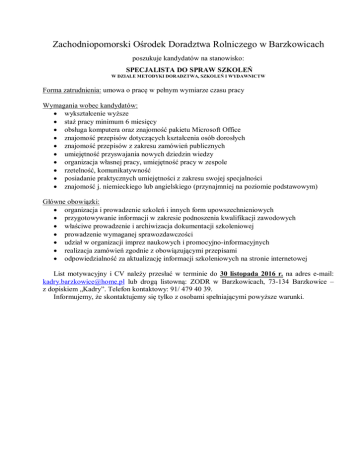 Zachodniopomorski O rodek Doradztwa Rolniczego w Barzkowicach poszukuje kandydatów na stanowisko: SPECJALISTA DO SPRAW SZKOLE W DZIALE METODYKI DORADZTWA, SZKOLE I WYDAWNICTW Forma zatrudnienia: umowa o prac w pe nym wymiarze czasu pracy Wymagania wobec kandydatów: wykszta cenie wy sze sta pracy minimum 6 miesi cy obs uga komputera oraz znajomo pakietu Microsoft Office znajomo przepisów dotycz cych kszta cenia osób doros ych znajomo przepisów z zakresu zamówie publicznych umiej tno przyswajania nowych dziedzin wiedzy organizacja w asnej pracy, umiej tno pracy w zespole rzetelno , komunikatywno posiadanie praktycznych umiej tno ci z zakresu swojej specjalno ci znajomo j. niemieckiego lub angielskiego (przynajmniej na poziomie podstawowym) ówne obowi zki: organizacja i prowadzenie szkole i innych form upowszechnieniowych przygotowywanie informacji w zakresie podnoszenia kwalifikacji zawodowych ciwe prowadzenie i archiwizacja dokumentacji szkoleniowej prowadzenie wymaganej sprawozdawczo ci udzia w organizacji imprez naukowych i promocyjno-informacyjnych realizacja zamówie zgodnie z obowi zuj cymi przepisami odpowiedzialno za aktualizacj informacji szkoleniowych na stronie internetowej List motywacyjny i CV nale y przes w terminie do 30 listopada 2016 r. na adres e-mail: [email protected] lub drog listown : ZODR w Barzkowicach, 73-134 Barzkowice – z dopiskiem „Kadry”. Telefon kontaktowy: 91/ 479 40 39. Informujemy, e skontaktujemy si tylko z osobami spe niaj cymi powy sze warunki.