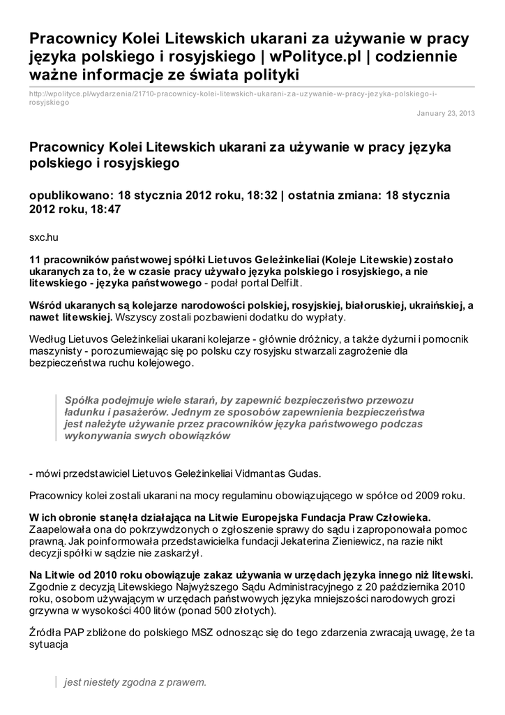 Pracownicy Kolei Litewskich ukarani za używanie w pracy języka polskiego i rosyjskiego | wPolityce.pl | codziennie ważne informacje ze świata polityki http://wpolityce.pl/wydarz enia/21710- pracownicy- kolei- litewskich- ukarani- z a- uz ywanie- w- pracy- jez yka- polskiego- irosyjskiego January 23, 2013 Pracownicy Kolei Litewskich ukarani za używanie w pracy języka polskiego i rosyjskiego opublikowano: 18 stycznia 2012 roku, 18:32 | ostatnia zmiana: 18 stycznia 2012 roku, 18:47 sxc.hu 11 pracowników państ wowej spółki Liet uvos Geleżinkeliai (Koleje Lit ewskie) zost ało ukaranych za t o, że w czasie pracy używało języka polskiego i rosyjskiego, a nie lit ewskiego - języka państ wowego - podał portal Delfi.lt. Wśród ukaranych są kolejarze narodowości polskiej, rosyjskiej, białoruskiej, ukraińskiej, a nawet lit ewskiej. Wszyscy zostali pozbawieni dodatku do wypłaty. Według Lietuvos Geleżinkeliai ukarani kolejarze - głównie dróżnicy, a także dyżurni i pomocnik maszynisty - porozumiewając się po polsku czy rosyjsku stwarzali zagrożenie dla bezpieczeństwa ruchu kolejowego. Spółka podejmuje wiele starań, by zapewnić bezpieczeństwo przewozu ładunku i pasażerów. Jednym ze sposobów zapewnienia bezpieczeństwa jest należyte używanie przez pracowników języka państwowego podczas wykonywania swych obowiązków - mówi przedstawiciel Lietuvos Geleżinkeliai Vidmantas Gudas. Pracownicy kolei zostali ukarani na mocy regulaminu obowiązującego w spółce od 2009 roku. W ich obronie st anęła działająca na Lit wie Europejska Fundacja Praw Człowieka. Zaapelowała ona do pokrzywdzonych o zgłoszenie sprawy do sądu i zaproponowała pomoc prawną. Jak poinformowała przedstawicielka fundacji Jekaterina Zieniewicz, na razie nikt decyzji spółki w sądzie nie zaskarżył. Na Lit wie od 2010 roku obowiązuje zakaz używania w urzędach języka innego niż lit ewski. Zgodnie z decyzją Litewskiego Najwyższego Sądu Administracyjnego z 20 października 2010 roku, osobom używającym w urzędach państwowych języka mniejszości narodowych grozi grzywna w wysokości 400 litów (ponad 500 złotych). Źródła PAP zbliżone do polskiego MSZ odnosząc się do tego zdarzenia zwracają uwagę, że ta sytuacja jest niestety zgodna z prawem. Według tych źródeł, podejście strony litewskiej, które jest pełne nieuzasadnionych obaw wobec używania języka ojczystego mniejszości narodowych mieszkających na Litwie sprawia, że wbrew zaleceniom Konwencji ramowej Rady Europy o Ochronie Mniejszości Narodowych oraz Europejskiej karty języków regionalnych lub mniejszościowych - której Litwa w ogóle nie podpisała - coraz częściej słyszymy o karaniu władz lokalnych za podwójne litewskie i polskie nazwy ulic, przewoźników za podwójne nazwy miejscowości. Czy jak ostatnio pracowników kolei litewskich za posługiwanie się w pracy językiem polskim, rosyjskim czy białoruskim - podkreśla rozmówca. Ta dziwna sytuacja zgodna jest niestety z litewskim prawem. Przed trzema laty zniesiono ustawę o mniejszościach, zaś Ustawą o języku państwowym zalegalizowano monopol języka litewskiego w oficjalnym życiu państwa i społeczeństwa - zaznacza źródło. Jest to stan niezgodny z rozwiązaniami przyjętymi w wielu krajach europejskich, w tym w Polsce i zarówno polska mniejszość narodowa na Litwie, jak i władze polskie wielokrotnie przeciw temu protestowały - podkreśla. PAP, mall Zainteresował Cię artykuł? zespół wPolityce.pl kategorie: tagi: język Litwa