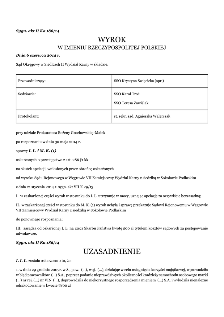 Sygn. akt II Ka 186/14 WYROK W IMIENIU RZECZYPOSPOLITEJ POLSKIEJ Dnia 6 czerwca 2014 r. Sąd Okręgowy w Siedlcach II Wydział Karny w składzie: Przewodniczący: SSO Krystyna Święcicka (spr.) Sędziowie: SSO Karol Troć SSO Teresa Zawiślak Protokolant: st. sekr. sąd. Agnieszka Walerczak przy udziale Prokuratora Bożeny Grochowskiej-Małek po rozpoznaniu w dniu 30 maja 2014 r. sprawy I. L. i M. K. (1) oskarżonych o przestępstwo z art. 286 §1 kk na skutek apelacji, wniesionych przez obrońcę oskarżonych od wyroku Sądu Rejonowego w Węgrowie VII Zamiejscowy Wydział Karny z siedzibą w Sokołowie Podlaskim z dnia 21 stycznia 2014 r. sygn. akt VII K 29/13 I. w zaskarżonej części wyrok w stosunku do I. L. utrzymuje w mocy, uznając apelację za oczywiście bezzasadną; II. w zaskarżonej części w stosunku do M. K. (1) wyrok uchyla i sprawę przekazuje Sądowi Rejonowemu w Węgrowie VII Zamiejscowy Wydział Karny z siedzibą w Sokołowie Podlaskim do ponownego rozpoznania; III. zasądza od oskarżonej I. L. na rzecz Skarbu Państwa kwotę 500 zł tytułem kosztów sądowych za postępowanie odwoławcze. Sygn. akt II Ka 186/14 UZASADNIENIE I. I. L. została oskarżona o to, że: 1. w dniu 29 grudnia 2007r. w S., pow. (...), woj. (...), działając w celu osiągnięcia korzyści majątkowej, wprowadziła w błąd pracowników (...) S.A., poprzez podanie nieprawdziwych okoliczności kradzieży samochodu osobowego marki (...) nr rej. (...) nr VIN (...), doprowadziła do niekorzystnego rozporządzenia mieniem (...) S.A. i wyłudziła nienależne odszkodowanie w kwocie 7800 zł tj. o czyn z art. 286 § l kk 2. M. K. (1) została oskarżona o to, że: II. w dniu 30 sierpnia 2006 r. w S., pow. (...), woj. (...), działając w celu osiągnięcia korzyści majątkowej, wprowadziła w błąd pracowników (...) S.A., poprzez podanie nieprawdziwych okoliczności powstania uszkodzeń w samochodzie osobowym marki (...) nr rej. (...) nr VIN (...), które miały powstać w wyniku zdarzenia drogowego, wiedząc, że takie zdarzenie nie zaistniało, doprowadziła do niekorzystnego rozporządzenia mieniem (...) S.A. i wyłudziła nienależne odszkodowanie w kwocie 5900 zł tj. o czyn z art. 286 § l kk. Wyrokiem Sądu Rejonowego w Węgrowie VII Zamiejscowy Wydział Karny z siedzibą w S.: I. oskarżoną I. L. w ramach zarzucanego jej czynu uznał za winną tego, że w okresie od dnia 07 stycznia 2008 r. do dnia 28 stycznia 2008 r. w S., pow. (...), woj. (...), działając w celu osiągnięcia korzyści majątkowej, wprowadziła w błąd pracowników (...) S.A., poprzez podanie nieprawdziwych okoliczności kradzieży samochodu osobowego marki V. (...) nr rej. (...) nr VIN (...) wskazując, iż w/w pojazd został skradziony bez kluczyka, doprowadziła do niekorzystnego rozporządzenia mieniem (...) S.A. i wyłudziła nienależne odszkodowanie w kwocie 7.800,00 zł, tj. czynu wyczerpującego dyspozycję art. 286 § l kk i za ten czyn na podstawie art. 286 § l kk skazał ją na karę 10 (dziesięć) miesięcy pozbawienia wolności oraz na podstawie art. 33 § 2 kk orzekł wobec oskarżonej grzywnę w wysokości 100 (sto) stawek dziennych, ustalając na podstawie art. 33 § 3 kk wysokość jednej stawki dziennej na kwotę 15,00 zł (piętnaście złotych); II. na podstawie art. 69 § l i 2 kk w zw. z art. 70 § l pkt l kk wykonanie orzeczonej wobec oskarżonej kary pozbawienia wolności warunkowo zawiesił na okres próby lat 2 (dwa); III. na podstawie art. 72 § 2 kk orzekł wobec oskarżonej obowiązek naprawienia wyrządzonej przestępstwem szkody poprzez zapłatę na rzecz pokrzywdzonego (...) S.A. kwoty 7.800,00 zł (siedem tysięcy osiemset złotych) w terminie 6 (sześć) miesięcy od daty uprawomocnienia się wyroku; IV. oskarżoną M. K. (1) w ramach zarzucanego jej czynu uznał za winną tego, że w okresie od dnia 04 września 2006 r. do dnia 09 października 2006 r. w S., pow. (...), woj. (...), działając w celu osiągnięcia korzyści majątkowej, wprowadziła w błąd pracowników (...) S.A., poprzez podanie nieprawdziwych okoliczności powstania uszkodzeń w samochodzie osobowym marki O. (...) o nr rej. (...) nr VIN (...), które miały powstać w wyniku zdarzenia drogowego, wiedząc, że takie zdarzenie nie zaistniało, doprowadziła do niekorzystnego rozporządzenia mieniem (...) S.A. i wyłudziła nienależne odszkodowanie w kwocie 5.900,00 zł, tj. czynu wyczerpującego dyspozycję art. 286 § l kk i za ten czyn na podstawie art. 286 § l kk skazał ją na karę 10 (dziesięć) miesięcy pozbawienia wolności oraz na podstawie art. 33 § 2 kk orzekł wobec oskarżonej grzywnę w wysokości 100 (sto) stawek dziennych, ustalając na podstawie art. 33 § 3 kk wysokość jednej stawki dziennej na kwotę 25,00 zł (dwadzieścia pięć złotych); V. na podstawie art. 69 § l i 2 kk w zw. z art. 70 § l pkt l kk wykonanie orzeczonej wobec oskarżonej kary pozbawienia wolności warunkowo zawiesił na okres próby lat 2 (dwa); VI. na podstawie art. 72 § 2 kk orzekł wobec oskarżonej obowiązek naprawienia wyrządzonej przestępstwem szkody poprzez zapłatę na rzecz pokrzywdzonego (...) S.A. kwoty 5.900,00 zł (pięć tysięcy dziewięćset złotych) w terminie 6 (sześć) miesięcy od daty uprawomocnienia się wyroku; VII. zasądził od oskarżonej I. L. kwotę 180,00 zł (sto osiemdziesiąt złotych) tytułem części opłaty, obciążył ją wydatkami postępowania w wysokości 2.000,00 zł (dwa tysiące złotych), w pozostałym zakresie koszty postępowania przejął na rachunek Skarbu Państwa; VIII. zasądził od oskarżonej M. K. (1) kwotę 180,00 zł (sto osiemdziesiąt złotych) tytułem części opłaty, obciążył ją wydatkami postępowania w wysokości 2.000,00 zł (dwa tysiące złotych), w pozostałym zakresie koszty postępowania przejął na rachunek Skarbu Państwa. Apelacje od powyższego wyroku wniósł obrońca oskarżonych. W zakresie skazania I. L. zaskarżył w ca