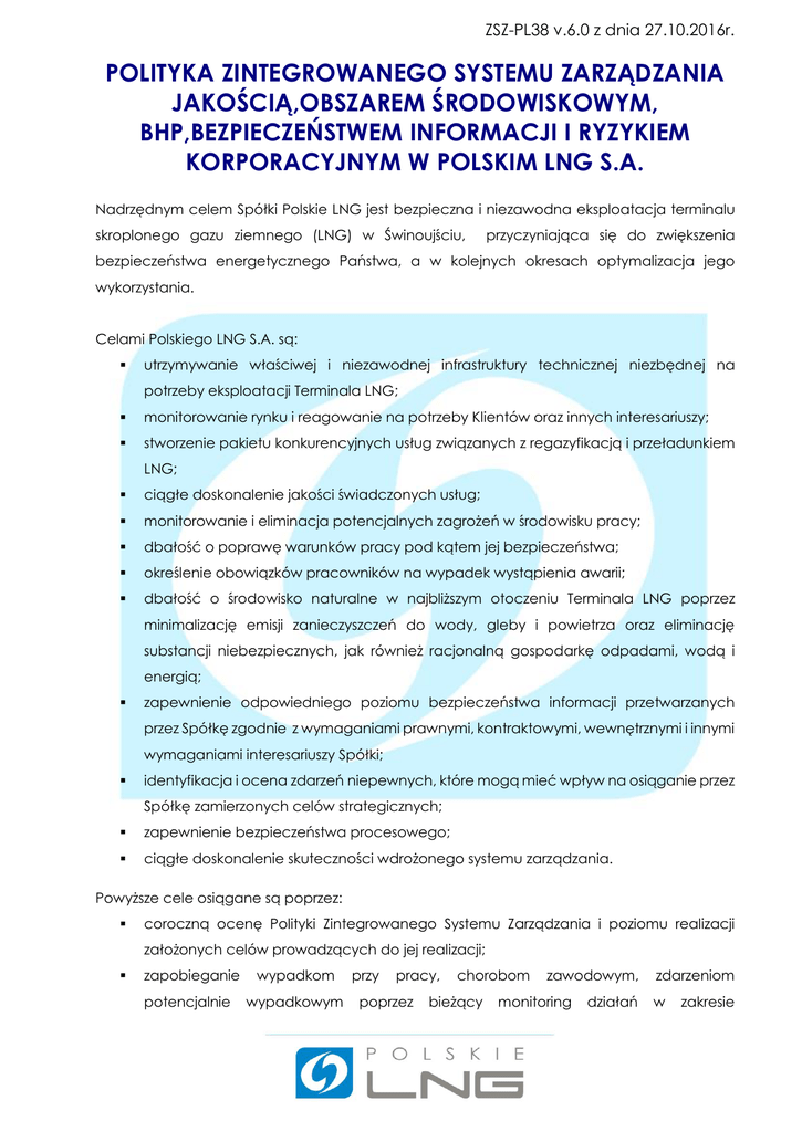 ZSZ-PL38 v.6.0 z dnia 27.10.2016r. POLITYKA ZINTEGROWANEGO SYSTEMU ZARZĄDZANIA JAKOŚCIĄ,OBSZAREM ŚRODOWISKOWYM, BHP,BEZPIECZEŃSTWEM INFORMACJI I RYZYKIEM KORPORACYJNYM W POLSKIM LNG S.A. Nadrzędnym celem Spółki Polskie LNG jest bezpieczna i niezawodna eksploatacja terminalu skroplonego gazu ziemnego (LNG) w Świnoujściu, przyczyniająca się do zwiększenia bezpieczeństwa energetycznego Państwa, a w kolejnych okresach optymalizacja jego wykorzystania. Celami Polskiego LNG S.A. są: utrzymywanie właściwej i niezawodnej infrastruktury technicznej niezbędnej na potrzeby eksploatacji Terminala LNG; monitorowanie rynku i reagowanie na potrzeby Klientów oraz innych interesariuszy; stworzenie pakietu konkurencyjnych usług związanych z regazyfikacją i przeładunkiem LNG; ciągłe doskonalenie jakości świadczonych usług; monitorowanie i eliminacja potencjalnych zagrożeń w środowisku pracy; dbałość o poprawę warunków pracy pod kątem jej bezpieczeństwa; określenie obowiązków pracowników na wypadek wystąpienia awarii; dbałość o środowisko naturalne w najbliższym otoczeniu Terminala LNG poprzez minimalizację emisji zanieczyszczeń do wody, gleby i powietrza oraz eliminację substancji niebezpiecznych, jak również racjonalną gospodarkę odpadami, wodą i energią; zapewnienie odpowiedniego poziomu bezpieczeństwa informacji przetwarzanych przez Spółkę zgodnie z wymaganiami prawnymi, kontraktowymi, wewnętrznymi i innymi wymaganiami interesariuszy Spółki; identyfikacja i ocena zdarzeń niepewnych, które mogą mieć wpływ na osiąganie przez Spółkę zamierzonych celów strategicznych; zapewnienie bezpieczeństwa procesowego; ciągłe doskonalenie skuteczności wdrożonego systemu zarządzania. Powyższe cele osiągane są poprzez: coroczną ocenę Polityki Zintegrowanego Systemu Zarządzania i poziomu realizacji założonych celów prowadzących do jej realizacji; zapobieganie potencjalnie wypadkom wypadkowym przy pracy, poprzez chorobom bieżący zawodowym, monitoring działań zdarzeniom w zakresie ZSZ-PL38 v.6.0 z dnia 27.10.2016r. bezpieczeństwa i higieny pracy oraz skuteczne wprowadzanie działań korygujących i/lub zapobiegawczych; podnoszenie kompetencji pracowników oraz uwzględnianie ich roli i zaangażowania w zakresie ochrony środowiska, działalności na rzecz BHP oraz zapewnienia bezpieczeństwa informacji w Spółce; rozwój kompetencji technicznych oraz zarządczych związanych z obsługą Terminala LNG; optymalizację kosztową i procesową Spółki; przestrzeganie obowiązujących przepisów prawa i innych wymagań pozaprawnych dotyczących Spółki; stosowanie przejrzystych zasad postępowania opisanych w regulaminach, procedurach i instrukcjach wspomaganych narzędziami teleinformatycznymi; zachowanie poufności, integralności i dostępności informacji przetwarzanych przez Spółkę zgodnie z wymaganiami prawnymi, umownymi i innymi wymaganiami interesariuszy Spółki; zarządzanie ryzykiem bezpieczeństwa bezpieczeństwa informacji informacji oraz poprzez podejmowanie szacowanie adekwatnych ryzyka działań minimalizujących zidentyfikowane ryzyka; wsparcie Zarządu i Pracowników Spółki w uzyskaniu kompleksowej informacji odnośnie ryzyk występujących w działalności operacyjnej i dostarczanie narzędzi umożliwiających ocenę i priorytetyzację ryzyk; ustanawianie procesu, który zapewnia kompleksowe podejście do monitorowania szans oraz zagrożeń dla Spółki, jak również pomaga w ustalaniu optymalnego sposobu reakcji na zidentyfikowane szanse i zagrożenia; wsparcie w podejmowaniu decyzji biznesowych, które przyczyniają się do maksymalizacji wartości Polskiego LNG S.A.; prowadzenie ciągłej identyfikacji i analizy ryzyka procesowego oraz przyjmowanie i obsługa strategii dla zidentyfikowanych ryzyk procesowych; ciągłe doskonalenie Zintegrowanego Systemu Zarządzania w celu poprawy jego skuteczności i osiąganych efektów. Zarząd Spółki deklaruje pełne zaangażowanie w prace nad utrzymaniem i ciągłym doskonaleniem skuteczności funkcjonującego ZSZ oraz potwierdza, że przyjęta w tym zakresie Polityka została uzgodniona, zakomunikowana i udostępniona wszystkim Pracownikom Spółki, jest również dostępna publicznie. Jednocześnie Zarząd deklaruje zapewnienie niezbędnych środków realizacji przyjętej Polityki. Treść podlega okresowej analizie i aktualizacjom.