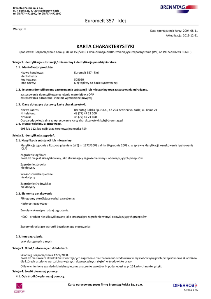 Brenntag Polska Sp. z o.o. ul. J. Bema 21, 47-224 Kędzierzyn-Koźle tel (48/77) 4721500, fax (48/77) 4721600 Euromelt 357 - klej Wersja: III Data sporządzenia karty: 2004-08-11 Aktualizacja: 2015-12-21 KARTA CHARAKTERYSTYKI (podstawa: Rozporządzenie Komisji UE nr 453/2010 z dnia 20 maja 2010r. zmieniające rozporządzenie (WE) nr 1907/2006 ws REACH) Sekcja 1. Identyfikacja substancji / mieszaniny i identyfikacja przedsiębiorstwa. 1.1. Identyfikator produktu. Nazwa handlowa: Identyfikator: Kod towaru: Inne nazwy: Euromelt 357 - klej 505050 Klej topliwy na bazie syntetycznej 1.2. Istotne zidentyfikowane zastosowania substancji lub mieszaniny oraz zastosowania odradzane. zastosowania zidentyfikowane: lejenie materiałów z OPP zastosowania odradzane: inne niż wymienione powyżej 1.3. Dane dotyczące dostawcy karty charakterystyki. Nazwa i adres: Brenntag Polska Sp. z o.o., 47-224 Kedzierzyn-Koźle, ul. Bema 21 Nr telefonu: 48 (77) 47 21 500 Nr faxu: 48 (77) 47 21 600 Osoba odpowiedzialna za opracowanie karty charakterystyki: [email protected] 1.4. Numer telefonu alarmowego. 998 lub 112, lub najbliższa terenowa jednostka PSP. Sekcja 2. Identyfikacja zagrożeń. 2.1. Klasyfikacja substancji lub mieszaniny. Klasyfikacja zgodnie z Rozporządzeniem (WE) nr 1272/2008 z dnia 16 grudnia 2008 r. w sprawie klasyfikacji, oznakowania i pakowania (CLP) Zagrożenie ogólnie: Produkt nie jest sklasyfikowany jako stwarzający zagrożenie w myśl obowiązujących przepisów. Zagrożenie zdrowia: nie dotyczy Własności niebezpieczne: nie dotyczy Zagrożenie środowiska: nie dotyczy 2.2. Elementy oznakowania Piktogramy określające rodzaj zagrożenia: Hasło ostrzegawcze: Zwroty wskazujące rodzaj zagrożenia: H000 - produkt nie sklasyfikowany jako stwarzający zagrożenie w myśl obowiązujących przepisów Zwroty określające warunki bezpiecznego stosowania: 2.3. Inne zagrożenia. brak dostępnych danych Sekcja 3. Skład / informacja o składnikach. Skład wg Rozporządzenia 1272/2008. Produkt nie zawiera składników stwarzających zagrożenie dla zdrowia lub środowiska w myśl obowiązujących przepisów oraz składników dla których ustalono wartości najwyższych dopuszczalnych stężeń w środowisku pracy. O ile wymienione są składniki niebezpieczne, znaczenie zwrotów H podane jest w p. 16 karty charakterystyki. Sekcja 4. Środki pierwszej pomocy. 4.1. Opis środków pierwszej pomocy. Karta opracowana przez firmę Brenntag Polska Sp. z o.o. Strona 1 z 6 Brenntag Polska Sp. z o.o. ul. J. Bema 21, 47-224 Kędzierzyn-Koźle tel (48/77) 4721500, fax (48/77) 4721600 Euromelt 357 - klej Wdychanie: W razie narażenia inhalacyjnego wyprowadzić poszkodowanego na świeże powietrze, zapewnić ciepło oraz warunki do odpoczynku. W przypadku złego samopoczucia skontaktować się z lekarzem. Kontakt ze skórą: W razie kontaktu skóry z roztopionym produktem, natychmiast schłodzić zimną wodą. Nie odrywać stężałego produktu od od skóry. Skontaktować się z lekarzem. Kontakt z oczami: W razie potrzeby usunąć szkła kontaktowe. W razie kontaktu z oczami natychmiast zimną wodą. Unikać silnego strumienia wody ze względu na ryzyko uszkodzenia rogówki. W przypadku zanieczyszczenia jednego oka, chronić w trakcie przemywania drugie oko przed zanieczyszczeniem. Skontaktować się z lekarzem okulistą. Spożycie: W razie połknięcia wypłukać usta i gardło wodą. Podać do wypcia 1-2 szklani wody. Nie wywoływać wymiotów. Zapewnić pomoc lekarską. 4.2. Najważniejsze ostre i opóźnione objawy oraz skutki narażenia. brak dostępnych danych 4.3. Wskazania dotyczące wszelkiej natychmiastowej pomocy lekarskiej i szczególnego postępowania z poszkodowanym. brak dostępnych danych Sekcja 5. Postępowanie w przypadku pożaru. 5.1. Środki gaśnicze. Pożary w obecności produktu gasić środkami odpowiednimi dla palących sie materiałów. Nie stosować wody w zwartym strumieniu. 5.2. Szczególne zagrożenia związane z substancją lub mieszaniną. Podczas pożaru mogą uwalniać się tlenki węgla. Powstaje również kwas octowy. 5.3. Informacje dla straży pożarnej. Pojemniki narażone na działanie ognia lub wysokiej temperatury chłodzić rozpylając wodę. Nie dopuszczać do przedostawania sie żużytych środków gaśniczych do kanalizacji i wód powierzchniowych. Stosować niezależny aparat oddechowy i pełną odzież ochronną. Sekcja 6. Postępowanie w przypadku niezamierzonego uwolnienia do środowiska. 6.1. Indywidualne środki ostrożności, wyposażenie ochronne i procedury w sytuacjach awaryjnych. Zawiadomić otoczenie o awarii. Nie dopuszczać osób postronnych i nieupoważnionych. Unikać zanieczyszczenia skóry i oczu. Stosować środki ochrony osobistej. 6.2. Środki ostrożności w zakresie ochrony środowiska. Unikać zrzutów do środowiska. Nie dopuszczać do zanieczyszczenia wód powierzchniowqych i gruntowych oraz gleby. Nie wprowadzać produktu do kanalizacji. W przypadku uwolnienia do środowiska dużych ilości produktu powiadomić odpowiednie władze. 6.3. Metody i materiały zapobiegające rozprzestrzenianiu się skażenia i służące do usuwania skażenia. Uwolniony produkt pozostawić do utwardzenia, a następnie zebrać mechanicznie do zamykanego pojemnika i przekazać do zniszczenia. 6.4. Odniesienia do innych sekcji. Informacje dotyczące odpowiedniego sprzętu ochrony osobistej podano w sekcji 8. Informacje dotyczące dodatkowej obróbki odpadów podano w sekcji 13. Sekcja 7. Postępowanie z substancjami i mieszaninami oraz ich magazynowanie. 7.1. Środki ostrożności dotyczące bezpiecznego postępowania. Zapewnić odpowiednią wentylację mechaniczną nawiewno-wyciagową. Unikać zanieczyszczenia oczu i skóy. Podczas stosowania nie jeść, nie pić i nie palić tytoniu. Myć ręce po użyciu oraz zdjąć zanieczyszczoną odzież. 7.2. Warunki bezpiecznego magazynowania, łącznie z informacjami dotyczącymi wszelkich wzajemnych niezgodności. Prze