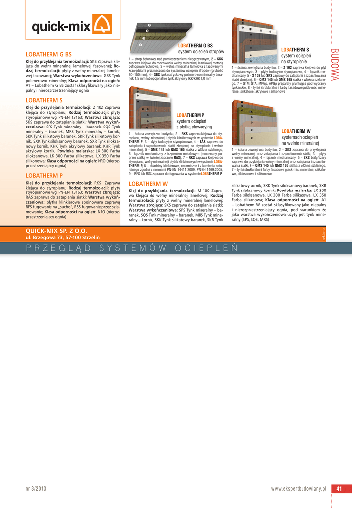 LOBATHERM G BS Klej do przyklejania termoizolacji: SKS Zaprawa klejąca do wełny mineralnej lamelowej fazowanej; Rodzaj termoizolacji: płyty z wełny mineralnej lamelowej fazowanej; Warstwa wykończeniowa: GBS Tynk polimerowo-mineralny; Klasa odporności na ogień: A1 – Lobatherm G BS został sklasyfikowany jako niepalny i nierozprzestrzeniający ognia 1 – strop betonowy nad pomieszczeniem nieogrzewanym, 2 – SKS zaprawa klejowa do mocowania wełny mineralnej lamelowej metodą pełnopowierzchniową, 3 – wełna mineralna lamelowa z fazowanymi krawędziami przeznaczona do systemów ociepleń stropów (grubość 60–150 mm), 4 – GBS tynk natryskowy polimerowo-mineralny baranek 1,5 mm lub opcjonalnie tynk akrylowy IKK/KHK 1,0 mm LOBATHERM S system ociepleń na styropianie 1 – ściana zewnętrzna budynku, 2 – Z 102 zaprawa klejowa do płyt styropianowych, 3 – płyty izolacyjne styropianowe, 4 – łącznik mechaniczny, 5 – S 102 lub SKS zaprawy do zatapiania i szpachlowania siatki zbrojonej, 6 – QMS 145 lub QMS 165 siatka z włókna szklanego, 7 – GTM, GTA, MPGp, APGp preparaty gruntujące pod wyprawy tynkarskie, 8 – tynki strukturalne i farby fasadowe quick-mix: mineralne, silikatowe, akrylowe i silikonowe BUDOWA LOBATHERM G BS system ociepleń stropów LOBATHERM S LOBATHERM P Klej do przyklejania termoizolacji: RKS Zaprawa klejąca do styropianu; Rodzaj termoizolacji: płyty styropianowe wg PN-EN 13163; Warstwa zbrojąca: RAS zaprawa do zatapiania siatki; Warstwa wykończeniowa: płytka klinkierowa spoinowana zaprawą RFS fugowanie na „sucho”, RSS fugowanie przez szlamowanie; Klasa odporności na ogień: NRO (nierozprzestrzeniający ognia) LOBATHERM P system ociepleń z płytką elewacyjną 1 – ściana zewnętrzna budynku, 2 – RKS zaprawa klejowa do styropianu, wełny mineralnej i płytek klinkierowych w systemie LOBATHERM P, 3 – płyty izolacyjne styropianowe, 4 – RAS zaprawa do zatapiania i szpachlowania siatki zbrojonej na styropianie i wełnie mineralnej, 5 – QMS 145 lub QMS 165 siatka z włókna szklanego, 6 – łącznik mechaniczny z trzpieniem metalowym (mocowany poprzez siatkę w świeżej zaprawie RAS), 7 – RKS zaprawa klejowa do styropianu, wełny mineralnej i płytek klinkierowych w systemie LOBATHERM P, 8 – okładziny klinkierowe, ceramiczne i z kamienia naturalnego zgodna z normami PN-EN 14411:2009, PN-EN 1469:2005, 9 – RFS lub RSS zaprawa do fugowania w systemie LOBATHERM P LOBATHERM W Klej do przyklejania termoizolacji: M 100 Zaprawa klejąca do wełny mineralnej lamelowej; Rodzaj termoizolacji: płyty z wełny mineralnej lamelowej; Warstwa zbrojąca: SKS zaprawa do zatapiania siatki; Warstwa wykończeniowa: SPS Tynk mineralny – baranek, SQS Tynk mineralny – baranek, MRS Tynk mineralny – kornik, SKK Tynk silikatowy baranek, SKR Tynk LOBATHERM W systemach ociepleń na wełnie mineralnej 1 – ściana zewnętrzna budynku, 2 – SKS zaprawa do przyklejania wełny mineralnej oraz zatapiania i szpachlowania siatki, 3 – płyty z wełny mineralnej, 4 – łącznik mechaniczny, 5 – SKS biały/szary zaprawa do przyklejania wełny mineralnej oraz zatapiania i szpachlowania siatki, 6 – QMS 145 lub QMS 165 siatka z włókna szklanego, 7 – tynki strukturalne i farby fasadowe guick-mix: mineralne, silikatowe, siloksanowe i silikonowe silikatowy kornik, SXK Tynk siloksanowy baranek, SXR Tynk siloksanowy kornik; Powłoka malarska: LX 300 Farba siloksanowa, LK 300 Farba silikatowa, LX 350 Farba silikonowa; Klasa odporności na ogień: A1 – Lobatherm W został sklasyfikowany jako niepalny i nierozprzestrzeniający ognia, pod warunkiem że jako warstwa wykończeniowa użyty jest tynk mineralny (SPS, SQS, MRS) reklama Klej do przyklejania termoizolacji: Z 102 Zaprawa klejąca do styropianu; Rodzaj termoizolacji: płyty styropianowe wg PN-EN 13163; Warstwa zbrojąca: SKS zaprawa do zatapiania siatki; Warstwa wykończeniowa: SPS Tynk mineralny – baranek, SQS Tynk mineralny – baranek, MRS Tynk mineralny – kornik, SKK Tynk silikatowy baranek, SKR Tynk silikatowy kornik, SXK Tynk siloksanowy baranek, SXR Tynk siloksanowy kornik, KHK Tynk akrylowy baranek, KHR Tynk akrylowy kornik, Powłoka malarska: LX 300 Farba siloksanowa, LK 300 Farba silikatowa, LX 350 Farba silikonowa; Klasa odporności na ogień: NRO (nierozprzestrzeniający ognia) QUICK-MIX SP. Z O.O. ul. Brzegowa 73, 57-100 Strzelin P R Z E G LĄ D nr 3/2013 S YS T E M Ó W O C I E P L E Ń www.eksper tbudowlany.pl 41