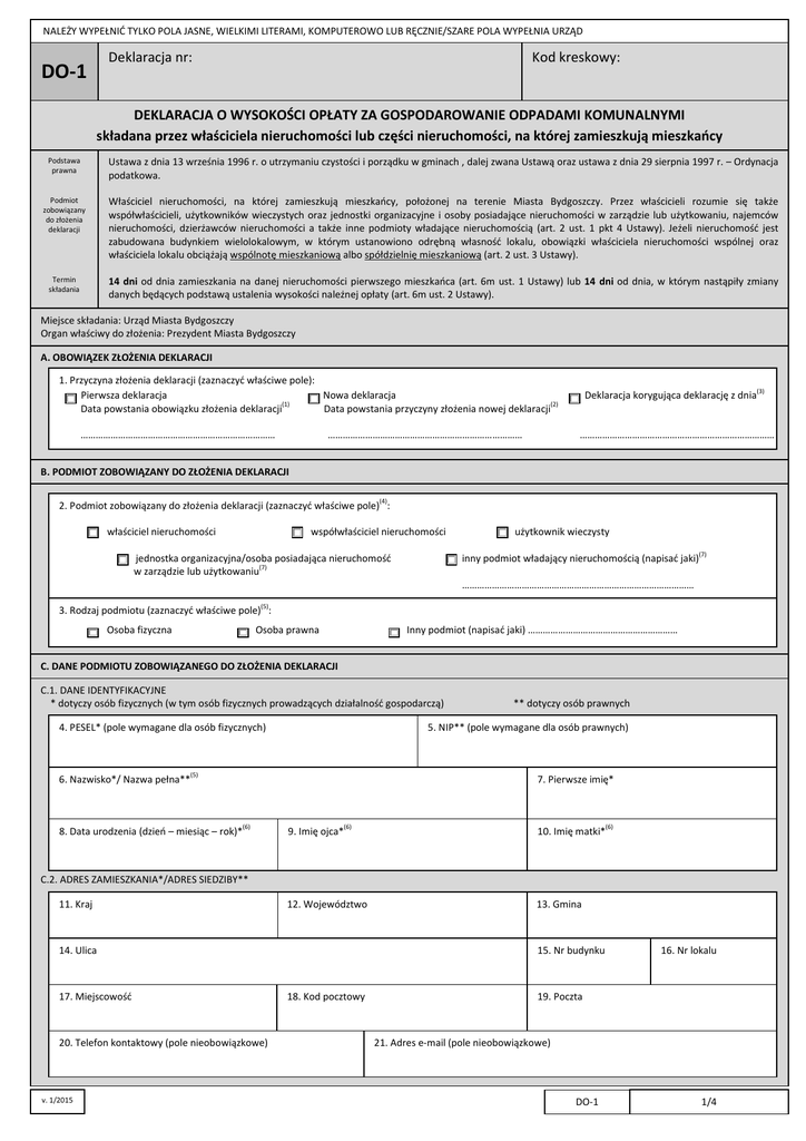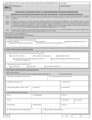 NALEŻY WYPEŁNIĆ TYLKO POLA JASNE, WIELKIMI LITERAMI, KOMPUTEROWO LUB RĘCZNIE/SZARE POLA WYPEŁNIA URZĄD Deklaracja nr: DO-1 Kod kreskowy: DEKLARACJA O WYSOKOŚCI OPŁATY ZA GOSPODAROWANIE ODPADAMI KOMUNALNYMI składana przez właściciela nieruchomości lub części nieruchomości, na której zamieszkują mieszkańcy Podstawa prawna Ustawa z dnia 13 września 1996 r. o utrzymaniu czystości i porządku w gminach , dalej zwana Ustawą oraz ustawa z dnia 29 sierpnia 1997 r. – Ordynacja podatkowa. Podmiot zobowiązany do złożenia deklaracji Właściciel nieruchomości, na której zamieszkują mieszkańcy, położonej na terenie Miasta Bydgoszczy. Przez właścicieli rozumie się także współwłaścicieli, użytkowników wieczystych oraz jednostki organizacyjne i osoby posiadające nieruchomości w zarządzie lub użytkowaniu, najemców nieruchomości, dzierżawców nieruchomości a także inne podmioty władające nieruchomością (art. 2 ust. 1 pkt 4 Ustawy). Jeżeli nieruchomość jest zabudowana budynkiem wielolokalowym, w którym ustanowiono odrębną własność lokalu, obowiązki właściciela nieruchomości wspólnej oraz właściciela lokalu obciążają wspólnotę mieszkaniową albo spółdzielnię mieszkaniową (art. 2 ust. 3 Ustawy). Termin składania 14 dni od dnia zamieszkania na danej nieruchomości pierwszego mieszkańca (art. 6m ust. 1 Ustawy) lub 14 dni od dnia, w którym nastąpiły zmiany danych będących podstawą ustalenia wysokości należnej opłaty (art. 6m ust. 2 Ustawy). Miejsce składania: Urząd Miasta Bydgoszczy Organ właściwy do złożenia: Prezydent Miasta Bydgoszczy A. OBOWIĄZEK ZŁOŻENIA DEKLARACJI 1. Przyczyna złożenia deklaracji (zaznaczyć właściwe pole): Pierwsza deklaracja Nowa deklaracja Data powstania obowiązku złożenia deklaracji(1) Data powstania przyczyny złożenia nowej deklaracji(2) …………………………………………………………………… ……………………………………………… …………………………………………………………………… Deklaracja korygująca deklarację z dnia(3) …………………………………………………………………… B. PODMIOT ZOBOWIĄZANY DO ZŁOŻENIA DEKLARACJI 2. Podmiot zobowiązany do złożenia deklaracji (zaznaczyć właściwe pole)(4): właściciel nieruchomości współwłaściciel nieruchomości użytkownik wieczysty inny podmiot władający nieruchomością (napisać jaki)(7) jednostka organizacyjna/osoba posiadająca nieruchomość w zarządzie lub użytkowaniu(7) ………………………………………………………………………………… 3. Rodzaj podmiotu (zaznaczyć właściwe pole)(5): Osoba fizyczna Osoba prawna Inny podmiot (napisać jaki) …………………………………………………… C. DANE PODMIOTU ZOBOWIĄZANEGO DO ZŁOŻENIA DEKLARACJI C.1. DANE IDENTYFIKACYJNE * dotyczy osób fizycznych (w tym osób fizycznych prowadzących działalność gospodarczą) 4. PESEL* (pole wymagane dla osób fizycznych) 5. NIP** (pole wymagane dla osób prawnych) 6. Nazwisko*/ Nazwa pełna**(5) 8. Data urodzenia (dzień – miesiąc – rok)*(6) ** dotyczy osób prawnych 7. Pierwsze imię* 9. Imię ojca*(6) 10. Imię matki*(6) 12. Województwo 13. Gmina C.2. ADRES ZAMIESZKANIA*/ADRES SIEDZIBY** 11. Kraj 14. Ulica 17. Miejscowość 20. Telefon kontaktowy (pole nieobowiązkowe) v. 1/2015 15. Nr budynku 18. Kod pocztowy 16. Nr lokalu 19. Poczta 21. Adres e-mail (pole nieobowiązkowe) DO-1 1/4 C.3. ADRES DO KORESPONDENCJI (wypełnić jeśli jest inny niż wpisany w części C.2.) 22. Nazwisko*/ Nazwa pełna** 23. Pierwsze imię* 24. Kraj 25. Województwo 26. Gmina 27. Ulica 28. Nr budynku 30. Miejscowość 31. Kod pocztowy 29. Nr lokalu 32. Poczta D. DANE IDENTYFIKACYJNE NIERUCHOMOŚCI, NA KTÓREJ POWSTAJĄ ODPADY 33. Typ nieruchomości (zaznaczyć właściwe pole) Zabudowa jednorodzinna Zabudowa wielorodzinna 34. Czy deklaracja składana jest za wszystkie lokale zamieszkane? (zaznaczyć właściwe pole) Jeśli NIE, proszę w poz. 37 napisać numery lokali, za jakie jest składana deklaracja. TAK NIE 35. Ulica: 36. Nr budynku: 37. Nr lokalu/i: 38. Opis położenia nieruchomości (pole nieobowiązkowe) 39. Nr nieruchomości w ewidencji gruntów (w przypadku braku nr. budynku) 40. Obręb (w przypadku braku nr. budynku) E. OŚWIADCZENIE PODMIOTU SKŁADAJĄCEGO DEKLARACJĘ Oświadczam, że na terenie nieruchomości, wskazanej w części D niniejszej deklaracji: 41. będzie prowadzona selektywna zbiórka odpadów, stawka 42. nie będzie prowadzona selektywna zbiórka odpadów, stawka 13 zł / osobę 39 zł / osobę Deklaruję, że na terenie nieruchomości, wskazanej w części D niniejszej deklaracji, zamieszkuje: 43. os. (należy podać liczbę mieszkańców) Zobowiązuję się do wnoszenia, za każdy miesiąc, opłaty za gospodarowanie odpadami komunalnymi, z nieruchomości wskazanej w części D niniejszej deklaracji, w wysokości: zł. 44. 0.00 (należy wyliczyć należną opłatę w zł mnożąc odpowiednią stawkę z poz. 41 lub 42 razy liczbę mieszkańców z poz. 43) F. UWAGI PODMIOTU SKŁADAJĄCEGO DEKLARACJĘ 45. v. 1/2015 DO-1 2/4 G. ZAŁĄCZNIKI (zaznaczyć właściwy kwadrat) 46. pełnomocnictwo w przypadku reprezentowania właściciela nieruchomości przez pełnomocnika 47. dokumenty wskazujące upoważnienie do złożenia deklaracji ………………………………………. 48. wykaz osób tworzących spółkę cywilną 49. potwierdzenie wniesienia opłaty skarbowej 50. inne ………………………………………………………………………………………………………………………………………… H. POUCZENIE NINIEJSZA DEKLARACJA STANOWI PODSTAWĘ DO WYSTAWIENIA TYTUŁU WYKONAWCZEGO, zgodnie z przepisami ustawy z dnia 17 czerwca 1966 r. o postępowaniu egzekucyjnym w administracji. W przypadku niezłożenia deklaracji Prezydent Miasta Bydgoszczy