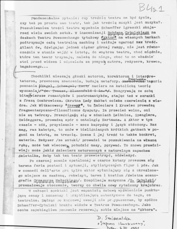 Fundamentalne pytanie: czy treścią teatru na być życie, czy też po prostu sam teatr, tak jak treścią muzyki muzyka?« Poszukiwaniem treści teatru wypełnia Schaeffer igraszki skoja rzeń wielu swoich sztuk. W inscenizacji Bohdana. Cybulskieg o na deskach Teatru Powszechnego tytułowy A ktor na własnych barkach podtrzymuje całą teatralną machinę i usiłuje ogarnąć ±*x treść* Atlant ów, dźwigając jednak ciężar górnej rampy, nie jest równo cześnie w stanie wejść w istotę, do wnętrza teatru, choć mięśnie, które ten teatr trzymają, należą do niego, choć to on właśnie' stoi przed widzem i odpowiada za pomysły autora, reżysera, krawca, bagażowego... Chochliki mieszają głoski autorom, korektorom i interpre tatorom, przenoszą znaczenia, budują metafory. poznania H e g e l , wyznania teoria Schmegul , Kant/ naciera na katolicką teorię św. Tomasz, Blumenfeld i in»-“^. Rozgrywają ze sobą bitwy wiersze romantyków i postromantyków, stając też w szranki z frazą Gombrowicza. Okrutna Lady Makbet ocieka czerwienią z wia dra. Jak Witkacowscy *Szewcy *, tu Śmieciarz i Krawiec prowadzą fragmentaryczno-filozoficzne dysputy. Im przecież wolno, oni nie są twórczy. Prześcigają się w zdaniach Leibniza, Spenglera, Heideggera, prowadzą spór o ontologię Hartmana* A Aktor w tym czasie - cóż, przyziemnie - mocz kapryśny i język obłożony. Raz mag, raz kabotyn, to znów w bieliźnianych krótkich gatkach "w po goni za istotą, za treścią. Scena i jej treść to także konkret, materia. Reżyser /ze sztuki/ prowadzi te poszukiwania na własną rękę, może tak wiecowo^ pobudzić masy, porywać. To znowu prawdzi wie j : może jakiś śmieciarz naturszczyk z naturalnym zapachem śmietnika, żeby tak ten teatr przewietrzyć, odświeżyć. Po czarnej scenie opatulonej w czarne kotary przesuwa się barwna feria postaci i sytuacji, stylistycznych figur i póz. Jak w commedi dell’arte gra tylko aktor wyłaniający się z określone go miejsce za zasłoną, rekwizyt, barwa i kostium /świetna sceno grafia Grzegorza Małeckiego/. Kompilacja muzyczna /B. Cybulski/ przemalowuje otoczenie, tworzy co chwila nowy rytmiczny krajobraz. W całości spektakl jest wspaniałą zabawą wyśmienicie punktu jącą sensy i nonsensy i przybliżającą autentyczne do tego, co teatralne. Sądząc po końcowej owacji nie przypuszczam, by spółce Schaeffer-Cybulski brakło widzów w Teatrze Powsz e chnym. Jako osoba zapobiegliwa ponownie rezerwuję sobie miejsce na "Aktora”.