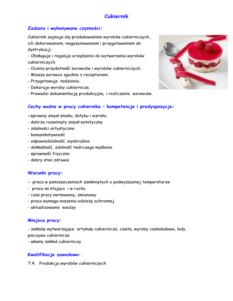 Cukiernik Zadania i wykonywane czynności: Cukiernik zajmuje się produkowaniem wyrobów cukierniczych, ich dekorowaniem, magazynowaniem i przygotowaniem do dystrybucji. - Obsługuje i reguluje urządzenia do wytwarzania wyrobów cukierniczych. - Ocenia przydatność surowców i wyrobów cukierniczych. - Miesza surowce zgodnie z recepturami. - Przygotowuje nadzienia. - Dekoruje wyroby cukiernicze. - Prowadzi dokumentację produkcyjną i rozliczenia surowców. Cechy ważne w pracy cukiernika – kompetencje i predyspozycje: -sprawny zmysł smaku, dotyku i wzroku - dobrze rozwinięty zmysł estetyczny - zdolności artystyczne - komunikatywność - odpowiedzialność, wyobraźnia - dokładność, zdolność twórczego myślenia - sprawność fizyczna - dobry stan zdrowia Warunki pracy: - praca w pomieszczeniach zamkniętych o podwyższonej temperaturze - praca na stojąco i w ruchu - czas pracy normowany, zmianowy - praca wymaga noszenia odzieży ochronnej - aktualizowanie wiedzy Miejsca pracy: - zakłady wytwarzające artykuły cukiernicze, ciasta, wyroby czekoladowe, lody, pieczywo cukiernicze - własny zakład cukierniczy Kwalifikacje zawodowe: T.4. Produkcja wyrobów cukierniczych