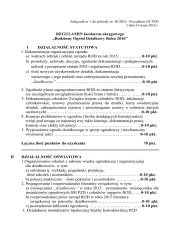 Załącznik nr 1 do uchwały nr 46/2016 Prezydium OZ PZD z dnia 16 maja 2016 r. REGULAMIN konkursu okręgowego „Rodzinny Ogród Działkowy Roku 2016” I DZIAŁALNOŚĆ STATUTOWA l. Dokumentacja organizacyjna ogrodu: a) walnych zebrań i zebrań zarządu ROD za rok 2015, …………….0-10 pkt. b) protokoły, uchwały, decyzje, zgodność dokumentacji i podejmowanych uchwał z przepisami statutu PZD i regulaminu ROD…………….0-10 pkt. c) ilość nowych użytkowników działek, dokumentacja wpisowego i jego podział oraz zabezpieczenie rocznej prenumeraty „działkowiec”……………………………………………………………0-10 pkt. 2. Zgodność planu zagospodarowania ROD ze stanem faktycznym (ze szczególnym uwzględnieniem ilości bram i furtek)……… …….0-10 pkt. 3. Dokumentacja członków Związku (rejestr członków ROD, deklaracje członkowskie, umowy przeniesienia prawa do działki, karty ewidencyjne działek, zabezpieczenie rejestru i przestrzeganie ustawy o ochronie danych osobowych)……………………………………………………… ...0-10 pkt. 4. Komisje problemowe w ogrodzie (liczba działających komisji-należy wziąć pod uwagę co najmniej trzy takie komisje, dokumentacje pracy komisji oraz efekty ich pracy) ………………………………… ..0-10 pkt. 5. Wyposażenie ogrodu działkowego w sprzęt ogrodniczy i mechaniczny (wymienić jaki) ………………………………………………… 0-10 pkt. Łączna ilość punktów do uzyskania II 70 pkt. DZIAŁALNOŚĆ OŚWIATOWA 1.Organizowanie szkoleń z zakresu wiedzy ogrodniczej i organizacyjnej dla działkowców, w tym: a) szkolenia tj. wykłady, pogadanki, prelekcje, ilość szkoleń i uczestników……………………………………… ..0-10 pkt. b) pokazy praktyczne – ilość pokazów i uczestników…………… ...0-10 pkt. 2. Propagowanie i rozprowadzanie literatury związkowej, w tym: a) miesięcznika „działkowiec” w roku 2015 – prenumerata miesięcznika dla instruktorów ogrodowych SSI PZD i członków organów ROD…… 0-10 pkt. b) rozprowadzanie przez zarząd ROD w roku 2015 literatury związkowej na potrzeby działkowców…………………………..0-10 pkt. c) prowadzenie biblioteki ogrodowej………………………… ……0-10 pkt. 3. Działalność instruktorów Społecznej Służby Instruktorskiej PZD – liczba instruktorów ogrodowych przypadających średnio na 100 działek w ROD……………………………………… ….0-10 pkt. 4. Prowadzenie kroniki ogrodowej……………………………… ……0-10 pkt. Łączna ilość punktów do uzyskania 70 pkt. ________________________________________________________________ III INWESTYCJE I REMONTY INFRASTRUKTURY ROD 1. Przygotowanie, prowadzenie i rozliczenie inwestycji i remontów prowadzonych przez zarząd ROD zgodnie ze statutem PZD i uchwałą nr 14/III/2015 Krajowej Rady PZD z dnia 1.10.20015r. i w oparciu o uchwałę walnego zebrania……………………………………………………..0-10 pkt. 2. Bieżąca konserwacja urządzeń i infrastruktury ogrody………….......0-10 pkt. 3. Prowadzenie modernizacji ROD oraz jej realizacja w oparciu o posiadaną dokumentację i planem zagospodarowania - realizacja Programu ROD XXI wieku………………………………………………………………...0-10 pkt. 4.Pozyskiwanie środków na inwestycje i remonty, podnoszenie standardów infrastruktury ROD………………………………………………........0-10 pkt. Łączna ilość punktów do uzyskania 40 pkt. ________________________________________________________________ IV ZAGOSPODAROWANIE ROD l. Zagospodarowanie przestrzenne ogrodu (zgodność zagospodarowania ogrodu z planem zagospodarowania)……………………………...0-10 pkt. 2. Infrastruktura ROD (stan techniczny),w tym: a) ogrodzenie zewnętrzne…………………………………………..0-10 pkt. b) bramy i furtki…………………………………………………… 0-10 pkt. c) tablica z nazwą ogrodu i jej estetyka…………………………… 0-10 pkt. d) drogi i alejki ogrodowe ich stan i funkcjonalność……………… 0-10 pkt. e) parkingi i miejsca postojowe i ich oddzielenie zielenią izolacyjną od działek…………………………………………… 0-10 pkt. f) obiekty kubaturowe występujące na terenie ROD, tj. dom działkowca, świetlica, budynki gospodarcze……………………..0-10 pkt. g) nawadnianie ogrodu (sposób nawadniania)……………………….0-10 pkt. h) sieć energetyczna i jej rozprowadzenie po ogrodzie (wyprowadzenie poza altany podliczników)…………………… .0-10 pkt. i) sanitariaty, ich stan i odizolowanie od działek sąsiednich…………0-10 pkt. 3. Zagospodarowanie i wyposażenie terenów ogólnych (należy podać rodzaj placów ogólnych i placów rekreacyjnych oraz ich wyposażenie)…...0-10 pkt. 4. Stan i wykorzystanie tablic informacyjnych w ogrodzie – aktualność zamieszczanych w nich materiałów i ogłoszeń……………… ……..0-10 pkt. Łączna ilość punktów do uzyskania 120 pkt. ________________________________________________________________ V ZAGOSPODAROWANIE DZIAŁEK l. Wyposażenie działek (stan techniczny, zgodność z regulaminem ROD): a) altany (ich prawidłowe usytuowanie jeżeli nie zaistnieją inne przesłanki, powierzchnia i wysokość oraz estetyka)……………………………..0-10 pkt. b) zachowanie odległości nasadzeń trwałych od granic działek……...0-10 pkt. c) szklarnie i tunele foliowe…………………………………………..0-10 pkt. d) elementy małej architektury na działkach (murki, pergole, trejaże, itp.)……………………………………….0-10 pkt. e)powszechność stosowania kompostowników, ich usytuowanie oraz wykorzystanie na działkach zgodnie z regulaminem ROD.......... .0-10 pkt. 2. Estetyka i funkcjon