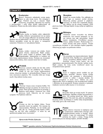 styczeń 2011, numer 2 horoskop Koziorożec Brawo! Nareszcie odnalazłeś swoją pasję. Śpiew to całe twoje życie. Nie rezygnuj z tego. Podziel się tym z innymi. Bądź kreatywny, oryginalny. Spotykaj się częściej z przyjaciółmi i zrób sobie krótki odpoczynek od komputera. Pluton ma dla ciebie dalsze wskazówki. Strzelec Chyba trochę za bardzo sobie odpuściłeś naukę. Zabawa i przyjemności też są ważne lecz nie mogą odbywać się kosztem szkoły. Rodzice nie są zadowoleni z twoich ocen. I nic dziwnego. Musisz porządnie wziąć się do pracy w następnym semestrze. Pomoże ci w tym planeta Saturn. Lew Sztuka, sztuka i jeszcze raz sztuka. Jesteś typem artysty, marzyciela. Bądź czujny. Życie może zrobić ci psikusa, bądź miłą niespodziankę. Matematyka to ostatnio nie była twoja najmocniejsza strona. Postaraj się zrozumieć nauczyciela matmy, choć czasami może być to trudne. Wodnik Pierwszy semestr chyba nie był dla ciebie najlepszy, lecz nie poddawaj się. Historia sztuki to nie jest twoja najmocniejsza strona, obserwuj zmiany w gwiazdozbiorze Pegaza a od razu zauważysz poprawę. Nie wszystko idzie po twojej myśli. Daj miłości trochę czasu. Ryby Poświęć więcej czasu swojemu hobby. Nie odkładaj niczego na potem, bo może być za późno. Patrz przed zaśnięciem na gwiazdy, a będziesz miał piękne i prorocze sny. Zrób pierwszy krok. Odezwij się do swojej sympatii. Nie będziesz żałował. Byk Uważaj na lód, bo będzie ślisko. Twoje marzenie może się spełnić. Nie narażaj się nauczycielom. Pamiętaj, że nie każdy jest taki jak Ty. Twoją gwiazdą będzie LH95. Staraj się nie być zbyt uciążliwy. A może by tak spróbować podjąć nowe wyzwanie? Opracowała Wróżka Zębuszka Skorpion Zajmij się swoim hobby. Nie odkładaj na jutro tego co możesz zrobić dzisiaj. Obserwuj zmiany gwiazd w piątkowe wieczory. To może być wspaniała okazja, aby zbliżyć się do swojej sympatii. Zrób pierwszy krok. Odwaga będzie twoją cechą na najbliższy miesiąc. Bliźnięta 'Ostatnim razem wszystko się dobrze skończyło, lecz musisz pamiętać, że los nie zawsze jest taki przychylny. Jesteś typem romantyka. Uwielbiasz poezję, świece, płatki kwiatów. Wykorzystaj to i może zacznij sam pisać wiersze. Twoim szczęśliwym kwiatem w tym miesiącu będzie paprotka. Obserwuj jej wpływ na położenie słońca. Baran Nie przejmuj się niepowodzeniami. Spędź aktywnie ferie. Spotkaj się z przyjaciółmi. Twoją szczęśliwą planetą będzie Jowisz. Poświęć więcej czasu nauce, ale nie zapominaj o przyjemnościach. Żyj chwilą i pełnią życia. Bądź czujny, bo twój cichy wielbiciel może się niespodziewanie ujawnić. Rak Życie w ciągłym stresie zrobiło się już nudne, prawda? Musisz chyba trochę zwolnić, ale pamiętaj o obowiązkach. Uwierz w siebie i zacznij działać, bo miłość przejdzie ci koło nosa. Zbliża się czas odpoczynku, ferie to najlepszy czas na połączenie relaksu i zbliżenia się do przyjaciół. Księżyc pomoże ci pokonać trudności życiowe tylko musisz w to uwierzyć. Waga Wszystko idzie po twojej myśli. To sprawa Merkurego. Spróbuj czerpać przyjemność z zimy. Nie uciekaj przed nią. Może sporty zimowe? Nie mów nic, póki nie spróbujesz. Postaraj zrobić się bliskiej ci osobie miłą niespodziankę. Taki mały gest a tak wiele może. Panna Długie zimowe wieczory to najlepszy czas na rozpoczęcie zdobywania nowego celu. Poeksperymentuj trochę w kuchni. Może wyjdzie z tego coś smacznego? W szkole postaraj się wyjść z cienia. Twoją myślą przewodnią na ten miesiąc będzie „DAMY RADĘ” “TAKT” gazetka szkolna Państwowej Ogólnokształcącej Szkoły Artystycznej 8