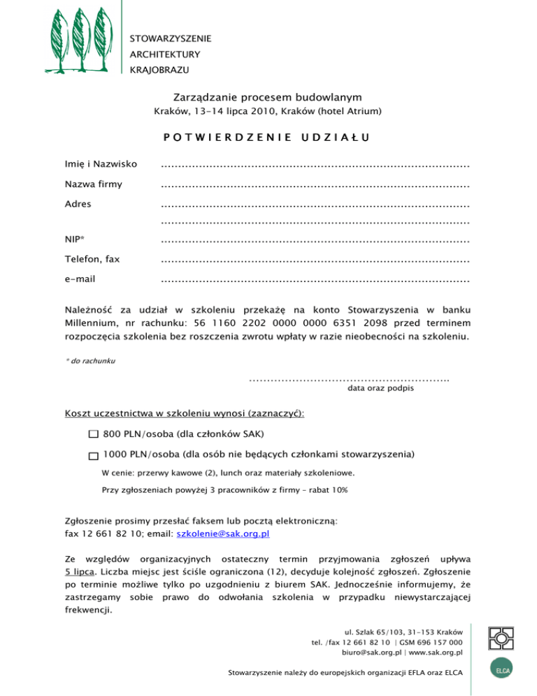 STOWARZYSZENIE ARCHITEKTURY KRAJOBRAZU Zarządzanie procesem budowlanym Kraków, 13-14 lipca 2010, Kraków (hotel Atrium) POTWIERDZENIE UDZIAŁU Imię i Nazwisko ......................................................................................... Nazwa firmy ......................................................................................... Adres ......................................................................................... ......................................................................................... NIP* ......................................................................................... Telefon, fax ......................................................................................... e-mail ......................................................................................... NaleŜność za udział w szkoleniu przekaŜę na konto Stowarzyszenia w banku Millennium, nr rachunku: 56 1160 2202 0000 0000 6351 2098 przed terminem rozpoczęcia szkolenia bez roszczenia zwrotu wpłaty w razie nieobecności na szkoleniu. * do rachunku .. data oraz podpis Koszt uczestnictwa w szkoleniu wynosi (zaznaczyć): 800 PLN/osoba (dla członków SAK) 1000 PLN/osoba (dla osób nie będących członkami stowarzyszenia) W cenie: przerwy kawowe (2), lunch oraz materiały szkoleniowe. Przy zgłoszeniach powyŜej 3 pracowników z firmy – rabat 10% Zgłoszenie prosimy przesłać faksem lub pocztą elektroniczną: fax 12 661 82 10; email: [email protected] Ze względów organizacyjnych ostateczny termin przyjmowania zgłoszeń upływa 5 lipca. Liczba miejsc jest ściśle ograniczona (12), decyduje kolejność zgłoszeń. Zgłoszenie po terminie moŜliwe tylko po uzgodnieniu z biurem SAK. Jednocześnie informujemy, Ŝe zastrzegamy sobie prawo do odwołania szkolenia w przypadku niewystarczającej frekwencji. ul. Szlak 65/103, 31-153 Kraków tel. /fax 12 661 82 10 | GSM 696 157 000 [email protected] | www.sak.org.pl Stowarzyszenie naleŜy do europejskich organizacji EFLA oraz ELCA