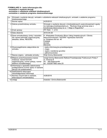 FORMULARZ A - karta informacyjna dla: -wniosków o wydanie decyzjj -wniosków o udzielenie wskazań lokalizacyjnych - wniosków o ustalenie programu dostosowawczego Lp. Wniosek o wydanie decyzji, wniosek o udzielenie wskazań lokalizacyjnych, wniosek o ustalenie programu dostosowawczego 1 Numer wpisu A/25/2010 2 Zakres przedmiotowy wniosku 3 Znak sprawy Wniosek o wydanie decyzji o środowiskowych uwarunkowaniach zgody na realizaję przedsięwzięcia pn.: "Budowa drogi gminnej wraz z kanalizacją deszczową na ul. 1 Maja w Rogoźniku" PP.7624 - 1- 2/10 4 Data złożenia 2010-04-20 5 Dane wnioskodawcy (imię i nazwisko lub nazwa jednostki organizacyjnej, siedziba, adres, REGON) P. Władysław Oczkowicz Biuro Usług Inwestycyjnych i Obrotu Nieruchomościami "AGORA" Agnieszka Sanocka ul. Dziekana 9d lok. 40 Czeladź 42-523 REGON: - karta informacyjna przedsięwzięcia - mapa - wypis z ewidencji gruntów - pełnomocnictwo Wójt Gminy Bobrowniki 6 Wyszczególnienie załączników do wniosku 7 Nazwa organu - adresata wniosku 8 Miejsce przechowywania (nazwa instytucji, nazwa komórki organizacyjnej, numer pokoju, numer telefonu kontaktowego) 9 Informacja o sposobie zakończenia postępowania (numer wpisu w wykazie decyzji lub postanowień) 10 Zastrzeżenia dotyczące nieudostępniania informacji 11 Numery innych kart w wykazie, dotyczących wnioskodawcy 12 Uwagi A/25/2010 Urząd Gminy Bobrowniki Referat Przedsięwzięć Publicznych Pokój 7 ul. Gminna 8 42 - 583 Bobrowniki tel.: 0322877883 wew.25 A/26/2010 Inwestor: Gmina Bobrowniki 1z1
