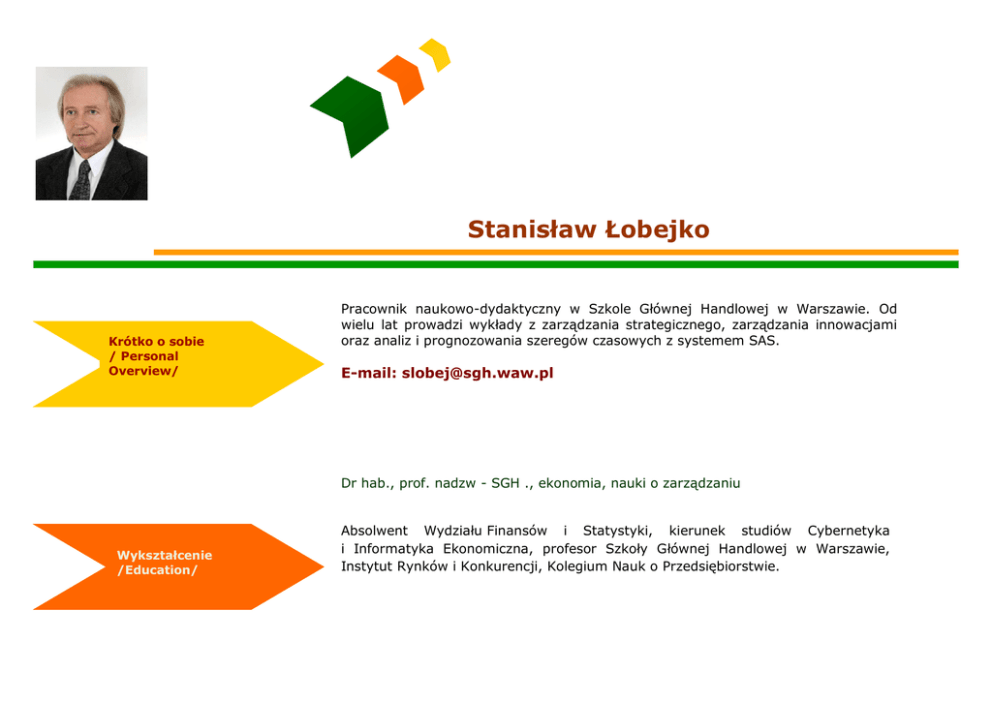 Stanisław Łobejko Krótko o sobie / Personal Overview/ Pracownik naukowo-dydaktyczny w Szkole Głównej Handlowej w Warszawie. Od wielu lat prowadzi wykłady z zarządzania strategicznego, zarządzania innowacjami oraz analiz i prognozowania szeregów czasowych z systemem SAS. E-mail: [email protected] Dr hab., prof. nadzw - SGH ., ekonomia, nauki o zarządzaniu Wykształcenie /Education/ Absolwent Wydziału Finansów i Statystyki, kierunek studiów Cybernetyka i Informatyka Ekonomiczna, profesor Szkoły Głównej Handlowej w Warszawie, Instytut Rynków i Konkurencji, Kolegium Nauk o Przedsiębiorstwie. Umiejętności i certyfikaty /Skills & Certificates/ Doświadczenie Zawodowe /Professional Experience/ Doświadczenia analityki biznesowej /Expirience in Business Analytics/ Bardzo dobra znajomość programów specjalistycznych z zakresu zaawansowanych analiz statystycznych i prognozowania: IBM SPSS, Statistica, SAS oraz modelowanie równań strukturalnych z programem AMOS. Od 25 lat prowadzi zajęcia dydaktyczne (wykłady, warsztaty, laboratoria komputerowe) oraz uczestniczy w projektach badawczych, krajowych i międzynarodowych Kilkanaście projektów zrealizowanych na rzecz firm i instytucji obejmujących takie zagadnienia jak: modelowanie równań strukturalnych, statystyczne analizy wielowymiarowe, segmentacja rynku, analiza skupień, prognozy rynku. Zainteresowania naukowe /Research interest/ Inne osiągnięcia /Other Achievements/ Hobby Zainteresowania naukowe obejmują takie dziedziny jak: zarządzanie strategiczne, innowacyjność przedsiębiorstw, sfera B+R, parki naukowotechnologiczne, badania rynku, zaawansowane analizy statystyczne, metody i modele prognostyczne, modelowanie równań strukturalnych, ewaluacja projektów. Odbyte szkolenia w zakresie badań rynku we Francji (IPSOS) oraz staż naukowy w USA (Northeastern Illinois University). Poznawanie świata, teorie New Age.
