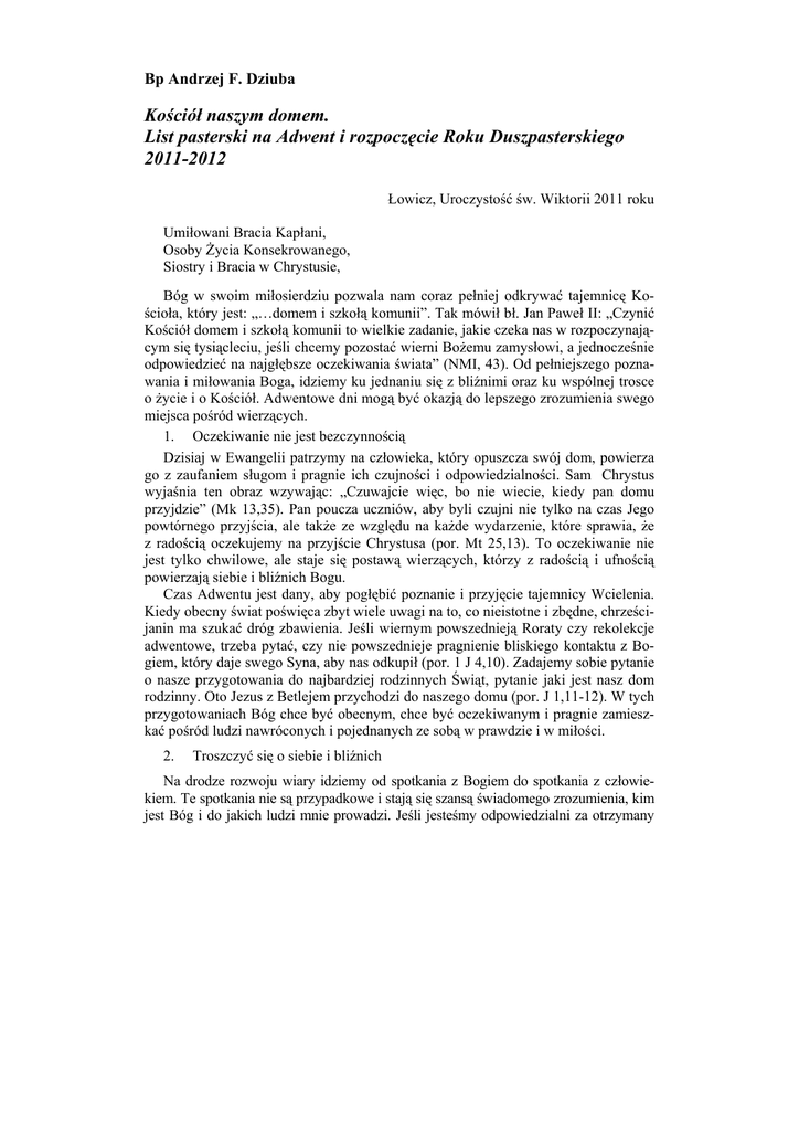 Bp Andrzej F. Dziuba Kościół naszym domem. List pasterski na Adwent i rozpoczęcie Roku Duszpasterskiego 2011-2012 Łowicz, Uroczystość św. Wiktorii 2011 roku Umiłowani Bracia Kapłani, Osoby Życia Konsekrowanego, Siostry i Bracia w Chrystusie, Bóg w swoim miłosierdziu pozwala nam coraz pełniej odkrywać tajemnicę Kościoła, który jest: „…domem i szkołą komunii”. Tak mówił bł. Jan Paweł II: „Czynić Kościół domem i szkołą komunii to wielkie zadanie, jakie czeka nas w rozpoczynającym się tysiącleciu, jeśli chcemy pozostać wierni Bożemu zamysłowi, a jednocześnie odpowiedzieć na najgłębsze oczekiwania świata” (NMI, 43). Od pełniejszego poznawania i miłowania Boga, idziemy ku jednaniu się z bliźnimi oraz ku wspólnej trosce o życie i o Kościół. Adwentowe dni mogą być okazją do lepszego zrozumienia swego miejsca pośród wierzących. 1. Oczekiwanie nie jest bezczynnością Dzisiaj w Ewangelii patrzymy na człowieka, który opuszcza swój dom, powierza go z zaufaniem sługom i pragnie ich czujności i odpowiedzialności. Sam Chrystus wyjaśnia ten obraz wzywając: „Czuwajcie więc, bo nie wiecie, kiedy pan domu przyjdzie” (Mk 13,35). Pan poucza uczniów, aby byli czujni nie tylko na czas Jego powtórnego przyjścia, ale także ze względu na każde wydarzenie, które sprawia, że z radością oczekujemy na przyjście Chrystusa (por. Mt 25,13). To oczekiwanie nie jest tylko chwilowe, ale staje się postawą wierzących, którzy z radością i ufnością powierzają siebie i bliźnich Bogu. Czas Adwentu jest dany, aby pogłębić poznanie i przyjęcie tajemnicy Wcielenia. Kiedy obecny świat poświęca zbyt wiele uwagi na to, co nieistotne i zbędne, chrześcijanin ma szukać dróg zbawienia. Jeśli wiernym powszednieją Roraty czy rekolekcje adwentowe, trzeba pytać, czy nie powszednieje pragnienie bliskiego kontaktu z Bogiem, który daje swego Syna, aby nas odkupił (por. 1 J 4,10). Zadajemy sobie pytanie o nasze przygotowania do najbardziej rodzinnych Świąt, pytanie jaki jest nasz dom rodzinny. Oto Jezus z Betlejem przychodzi do naszego domu (por. J 1,11-12). W tych przygotowaniach Bóg chce być obecnym, chce być oczekiwanym i pragnie zamieszkać pośród ludzi nawróconych i pojednanych ze sobą w prawdzie i w miłości. 2. Troszczyć się o siebie i bliźnich Na drodze rozwoju wiary idziemy od spotkania z Bogiem do spotkania z człowiekiem. Te spotkania nie są przypadkowe i stają się szansą świadomego zrozumienia, kim jest Bóg i do jakich ludzi mnie prowadzi. Jeśli jesteśmy odpowiedzialni za otrzymany Kościół naszym domem. List pasterski na Adwent 2011 55 dar wiary, inni ludzie nie mogą być nam obojętni. W Kościele możemy czuć się jak w domu, gdzie ludzie wzajemnie się wspierają i są pełni życzliwości. Dni, które są przed nami to szansa lepszego rozeznania Kościoła jako domu dla wszystkich, a jednocześnie także większego otwarcia na wszystkich ochrzczonych. Pragniemy bardziej praktycznie żyć ewangelicznym braterstwem między ludźmi, bo zwłaszcza we wspólnotach kościelnych winna być szczególna duchowa jedność wiary. Faktycznie – Kościół jest naszym domem! W ten sposób, naturalnie w jakimś stopniu pogłębia się wśród katolików poznanie i przyjęcie tajemnicy Kościoła, który tworzą wszyscy ochrzczeni, a nie tylko „papież, biskupi i księża”. To wspólnota, która jest owocem tego, co się wydarzyło w Dniu Pięćdziesiątnicy (por. Dz 2,1-36). Trzeba, aby świeccy jeszcze pełniej odkryli własne miejsce w Kościele, w którym nie tylko czują się dobrze, ale odpowiadają za jego ustawiczny rozwój i świętość. Aby byli zdolni, wobec kultury współczesnej, która niesie ze sobą nie tylko wartości, ale także i antywartości, wybierać między tym, co służy budowaniu życia duchowego, a tym, co powoduje jego rozchwianie czy nawet zanik. 3. Działać w jedności i wspólnocie Chcemy tworzyć i ożywiać w naszych wspólnotach grupy i zespoły, które w Kościele staną się narzędziami umacniania i kształtowania wiary. Każdy wierzący, jest przecież odpowiedzialny za jej niesienie i przekazywanie innym. Odpowiedzialność tę można ponosić tylko wtedy, kiedy uznajemy, szanujemy i kochamy Kościół (por. 2 Kor 8,24). Stwarza on bowiem możliwość pełniejszego realizowania przez wiernych ich powołań, darów, talentów i charyzmatów (por. 1 Kor 12,28). Całe to bogactwo ma służyć budowaniu tu i teraz Królestwa Bożego. W rozpoczynającym się okresie położymy szczególny akcent na znalezienie właściwego miejsca dla posługi rad i zespołów parafialnych. Mogą one lepiej służyć podniesieniu naszej odpowiedzialności za posługę duszpasterską oraz dobra materialne, jakimi dysponuje wspólnota. Patrząc na realia życia naszych parafii, dostrzegamy, że jest wiele do zrobienia w tym względzie. Prawdziwa troska o Kościół w jego wymiarze duchowym i materialnym jest świadectwem miłości do Boga, który daje nam żyć także dla innych. Żadne grupy we wspólnocie Kościoła nie mogą spełnić swojej roli, jeśli nie widzą parafii, jako domu, w którym dzielimy radości i smutki oraz wspieramy się w niesieniu odpowiedzialności. Wspólnocie Kościoła nie są potrzebne pozorne gesty, które nie budują i pomnażają dobra; nie wyprzedzimy świata w grze pozorów i obietnic. Istnieje pilna potrzeba głębszego zaangażowania się – tak kapłanów, jak i wiernych świeckich – w pracę nad tym, aby struktury wspólnoty wierzących rzeczywiście spełniały taką rolę, jaką wyznacza im nauczanie Kościoła. Potrzebna jest stała formacja członków grup kościelnych w diecezjach i parafiach, aby mogły one w pełni służyć ewangelizacji. 4. Miłować Kościół i w nim żyć Kościół naszym domem. Co to znaczy? Dom to pojęcie znane i zrozumiałe. Kojarzy się z ciepłem, bezpieczeństwem, rodziną. To miejsce, gdzie budujemy wsp