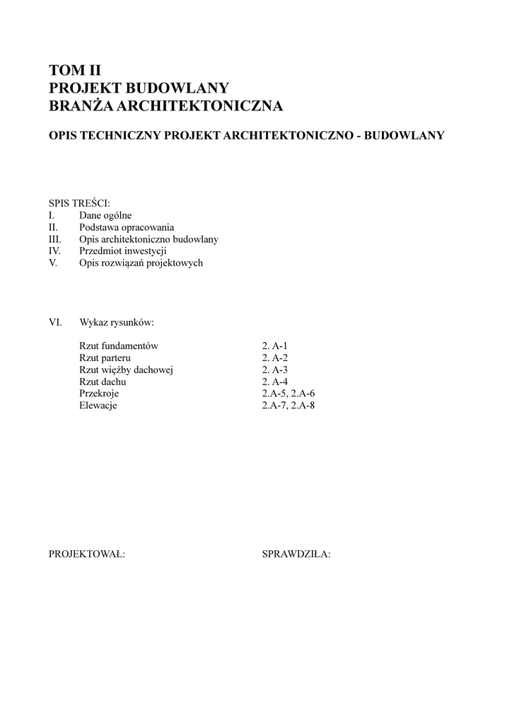 TOM II PROJEKT BUDOWLANY BRANŻA ARCHITEKTONICZNA OPIS TECHNICZNY PROJEKT ARCHITEKTONICZNO - BUDOWLANY SPIS TREŚCI: I. Dane ogólne II. Podstawa opracowania III. Opis architektoniczno budowlany IV. Przedmiot inwestycji V. Opis rozwiązań projektowych VI. Wykaz rysunków: Rzut fundamentów Rzut parteru Rzut więźby dachowej Rzut dachu Przekroje Elewacje PROJEKTOWAŁ: 2. A-1 2. A-2 2. A-3 2. A-4 2.A-5, 2.A-6 2.A-7, 2.A-8 SPRAWDZIŁA: OPIS TECHNICZNY 1. 1.1. DANE OGÓLNE Opis techniczny został sporządzony w oparciu o Rozporządzenie Ministra Infrastruktury z dnia 3 lipca 2003 r. w sprawie szczegółowego zakresu i formy projektu budowlanego i zawiera opis projektu wg kolejności określonej w rozporządzeniu. PRZEZNACZENIE I PROGRAM UŻYTKOWY BUDYNKU Przedmiotem inwestycji jest budowa hali produkcyjnej, wiaty-zadaszenia wanny do impregnacji drewna oraz dróg wewnętrznych wraz z placem do składowania drewna. Hala produkcyjna - hala jednonawowa przykryta dachem dwuspadowym symetrycznym o kącie nachylenia 20º. Konstrukcja hali ze słupów żelbetowych, okrągłych o 30, poszycie ścian z płyt warstwowych 10 cm, konstrukcja dachu – wiązary drewniane, pokrycie dachowe z blachy trapezowej lub z płyt warstwowych w kolorze szarym. Wiata-zadaszenie o konstrukcji drewnianej – dach jednospadowy, przylegająca do projektowanej hali konstrukcja drewniana. Pokrycie z blachy trapezowej w kolorze identycznym jak pokrycie hali 1.2. ZESTAWIENIE POWIERZCHNI • Powierzchnia zabudowy : …...................…............................ 1075,00 m2 • Powierzchnia użytkowa hala : …............................................ 880,00 m2 • Powierzchnia użytkowa wiata : …............................................ 115,00 m2 • Kubatura : 7240,00 m3 • Spadek dachu:…........................................................................... 20 stopni • Kategoria zagrożenia ludzi:........................................................... ZLII, 1.3. ….......................................................................... FORMA ARCHITEKTONICZNA I FUNKCJA BUDYNKU Hala produkcyjna - jednonawowa, parterowa, bez podpiwniczenia zaprojektowana w technologii żelbetowej ryglowej. Kryta dachem dwuspadowym o kącie nachylenia 20°. Układ konstrukcyjny - ryglowy. Posadowienie budynku bezpośrednie na ławie fundamentowej. Konstrukcja stalowa mocowana bezpośrednio do ław żelbetowych za pomocą kotew stalowych. Rygle WYKAZ POMIESZCZEŃ: 01 Kotłownia 02 Pom. Socjalne 03 WC 04 Hala produkcyjna 04/1 Część magazynowa 04/2 Komunikacja 04/3 Obszar linii montażu 13,30 17,50 5,20 844,0 (246,0 (129,0 (469,0 m2 m2 m2 m2 m2 ) m2 ) m2 ) POWIERZCHNIA RAZEM 880,00 m2 2. WYTYCZNE MATERIAŁOWO-KONSTRUKCYJNE : 2.1.ROZWIĄZANIA ARCHITEKTONICZNO-BUDOWLANE • Posadowienie: Przyjęto system tradycyjny system stóp fundamentowych (zgodnie z opracowaniem konstrukcyjnym). • Podwalina: – betonowa, wylewana na mokro; • Ściany zewnętrzne: Ściany zewnętrzne – układ konstrukcyjny stalowy z obiciem zewnętrznym płytą warstwową gr.60mm wypełnioną pianką PU • Ściany wewnętrzne: Wewnętrzne ściany kotłowni z elementów betonu komórkowego gr. 24 cm Pomieszczenia socjalne konstrukcja szkieletowa system Ri-Gips • Układ konstrukcyjny: Hala produkcyjna – układ konstrukcyjny stanowią słupy stalowe HEA 240. Wiata – zadaszenie – konstrukcja stanowi w całości drewno lite klasy C24 suszone, strugane i impregnowane. Wykaz elementów wg branży konstrukcyjnej. • Belki, podciągi, słupy: Wszystkie konstrukcyjne elementy projektuje się jako stalowe (zgodnie z opracowaniem konstrukcyjnym). Wszystkie zewnętrzne i wewnętrzne elementy, pozycje konstrukcyjne narażone na wpływ temperatury (możliwość powstania ewentualnych mostków termicznych) należy odpowiednio zabezpieczyć termicznie - zgodnie ze sztuką budowlaną. • Dach: Konstrukcja nośna więźby dachowej-drewniana prefabrykowana, wiązary drewniane (zgodnie z opracowaniem konstrukcyjnym). Pokrycie dachu płytą warstwową gr. 60mm wypełnioną pianką PU. Wiata pokryta blachą trapezową. Wszystkie niezbędne elementy podstawowe i uzupełniające związane z dachem, jego pokryciem - typowe (w ilości i zakresie zgodnym z przyjętym systemem i sztuką budowlaną). Konstrukcja dachu, wykonana będzie z drewna iglastego o klasie wytrzymałości C24 , impregnowanego przeciwko grzybom i pleśniom, do stopnia trudnozapalności środkami typu Firestop. Kominy: Budynek wyposażony w wentylację mechaniczną wg odrębnego opracowania branżowego. Komin spalinowy systemowy SCHEDEL lub podobne • Przegrody pionowe: Tynki wewnętrzne w obrębie pomieszczeń socjalnych – płyta kartonowo gipsowa • malowana farbami lateksowymi, pomieszczenie kotłowni gładź gipsowa + malowanie (farba emulsyjna biała Izolacje termiczne. Izolację termiczną przewidziano w postaci płyty warstwowej na całej powierzchni ścian i dachu hali produkcyjnej. Płyta warstwowa gr. 60 mm wypełniona pianką PU. • • Okna i drzwi: Okna systemowe; Stolarka wewnętrzna drzwiowa płycinowa Drzwi wejściowe do kotłowni pełne przeciw pożarowe Brama wjazdowa segmentowa wraz z modułem drzwiowym np. Wiśniowski. • Parapety: Parapety zewnętrzne - blacha stalowa powlekana (kolor białe), • Rynny i rury spustowe: Rynny i rury spustowe z blachy stalowej powlekanej, alternatywnie PCV (kolor stalowy) • Obróbki blacharskie: Wszelkie na dachu (kominy, okapy, szczyty) - systemowe (blacha stalowa powlekana - kolor szary), • Kolorystyka: Ściany zewnętrzne – płyta warstwowa od zewnątrz i wewnątrz kolory jasne. Cokół betonowy malowany lub z okładziną kamienną • Instalacje: Docelowo budynek planuje się wyposażyć w instalacje: − wodną; − kanalizacyjną; − deszczową; − elektryczną; − c.o..; − odgromową; − instalacja zabezpieczeń przeciwpożarowych; − wentylacja mechaniczna; Zaopatrzenie w niezbędne media zgodnie z warunkam