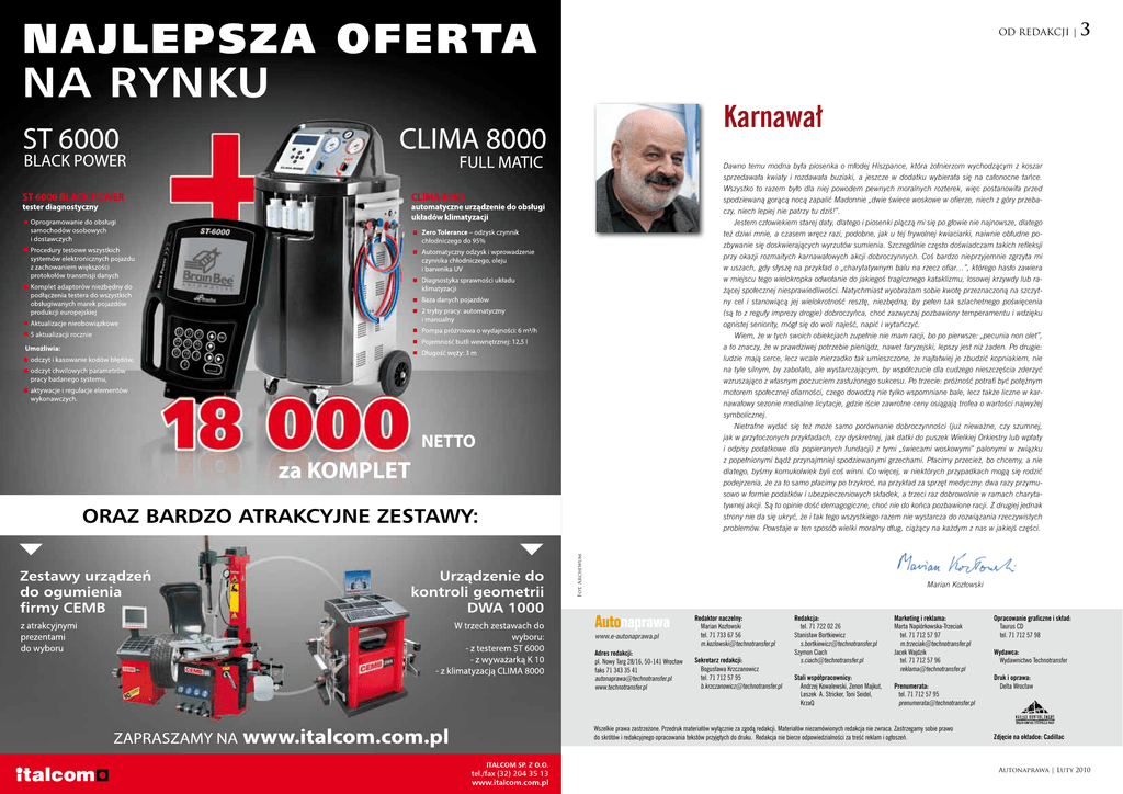 OD REDAKCJI | 3 Karnawał Fot. Archiwum Dawno temu modna była piosenka o młodej Hiszpance, która żołnierzom wychodzącym z koszar sprzedawała kwiaty i rozdawała buziaki, a jeszcze w dodatku wybierała się na całonocne tańce. Wszystko to razem było dla niej powodem pewnych moralnych rozterek, więc postanowiła przed spodziewaną gorącą nocą zapalić Madonnie „dwie świece woskowe w ofierze, niech z góry przebaczy, niech lepiej nie patrzy tu dziś!”. Jestem człowiekiem starej daty, dlatego i piosenki plączą mi się po głowie nie najnowsze, dlatego też dziwi mnie, a czasem wręcz razi, podobne, jak u tej frywolnej kwiaciarki, naiwnie obłudne pozbywanie się doskwierających wyrzutów sumienia. Szczególnie często doświadczam takich refleksji przy okazji rozmaitych karnawałowych akcji dobroczynnych. Coś bardzo nieprzyjemnie zgrzyta mi w uszach, gdy słyszę na przykład o „charytatywnym balu na rzecz ofiar…”, którego hasło zawiera w miejscu tego wielokropka odwołanie do jakiegoś tragicznego kataklizmu, losowej krzywdy lub rażącej społecznej niesprawiedliwości. Natychmiast wyobrażam sobie kwotę przeznaczoną na szczytny cel i stanowiącą jej wielokrotność resztę, niezbędną, by pełen tak szlachetnego poświęcenia (są to z reguły imprezy drogie) dobroczyńca, choć zazwyczaj pozbawiony temperamentu i wdzięku ognistej seniority, mógł się do woli najeść, napić i wytańczyć. Wiem, że w tych swoich obiekcjach zupełnie nie mam racji, bo po pierwsze: „pecunia non olet”, a to znaczy, że w prawdziwej potrzebie pieniądz, nawet faryzejski, lepszy jest niż żaden. Po drugie: ludzie mają serce, lecz wcale nierzadko tak umieszczone, że najłatwiej je zbudzić kopniakiem, nie na tyle silnym, by zabolało, ale wystarczającym, by współczucie dla cudzego nieszczęścia zderzyć wzruszająco z własnym poczuciem zasłużonego sukcesu. Po trzecie: próżność potrafi być potężnym motorem społecznej ofiarności, czego dowodzą nie tylko wspomniane bale, lecz także liczne w karnawałowy sezonie medialne licytacje, gdzie iście zawrotne ceny osiągają trofea o wartości najwyżej symbolicznej. Nietrafne wydać się też może samo porównanie dobroczynności (już nieważne, czy szumnej, jak w przytoczonych przykładach, czy dyskretnej, jak datki do puszek Wielkiej Orkiestry lub wpłaty i odpisy podatkowe dla popieranych fundacji) z tymi „świecami woskowymi” palonymi w związku z popełnionymi bądź przynajmniej spodziewanymi grzechami. Płacimy przecież, bo chcemy, a nie dlatego, byśmy komukolwiek byli coś winni. Co więcej, w niektórych przypadkach mogą się rodzić podejrzenia, że za to samo płacimy po trzykroć, na przykład za sprzęt medyczny: dwa razy przymusowo w formie podatków i ubezpieczeniowych składek, a trzeci raz dobrowolnie w ramach charytatywnej akcji. Są to opinie dość demagogiczne, choć nie do końca pozbawione racji. Z drugiej jednak strony nie da się ukryć, że i tak tego wszystkiego razem nie wystarcza do rozwiązania rzeczywistych problemów. Powstaje w ten sposób wielki moralny dług, ciążący na każdym z nas w jakiejś części. Autonaprawa www.e-autonaprawa.pl Adres redakcji: pl. Nowy Targ 28/16, 50-141 Wrocław faks 71 343 35 41 [email protected] www.technotransfer.pl Redaktor naczelny: Marian Kozłowski tel. 71 733 67 56 [email protected] Sekretarz redakcji: Bogusława Krzczanowicz tel. 71 712 57 95 [email protected] Redakcja: tel. 71 722 02 26 Stanisław Bortkiewicz [email protected] Szymon Ciach [email protected] Stali współpracownicy: Andrzej Kowalewski, Zenon Majkut, Leszek A. Stricker, Toni Seidel, KrzaQ Marian Kozłowski Marketing i reklama: Marta Napiórkowska-Trzeciak tel. 71 712 57 97 [email protected] Jacek Wajdzik tel. 71 712 57 96 [email protected] Prenumerata: tel. 71 712 57 95 [email protected] Wszelkie prawa zastrzeżone. Przedruk materiałów wyłącznie za zgodą redakcji. Materiałów niezamówionych redakcja nie zwraca. Zastrzegamy sobie prawo do skrótów i redakcyjnego opracowania tekstów przyjętych do druku. Redakcja nie bierze odpowiedzialności za treść reklam i ogłoszeń. Opracowanie graficzne i skład: Taurus CD tel. 71 712 57 98 Wydawca: Wydawnictwo Technotransfer Druk i oprawa: Delta Wrocław Zdjęcie na okładce: Cadillac Autonaprawa | Luty 2010