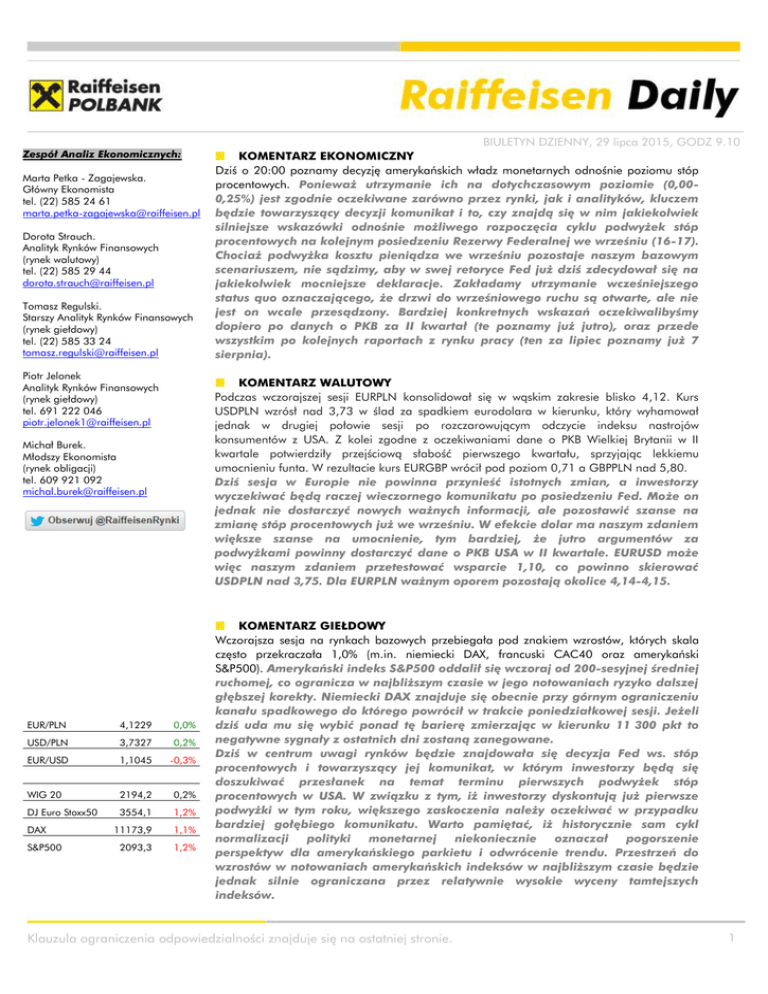Zespół Analiz Ekonomicznych: Marta Petka - Zagajewska. Główny Ekonomista tel. (22) 585 24 61 [email protected] Dorota Strauch. Analityk Rynków Finansowych (rynek walutowy) tel. (22) 585 29 44 [email protected] Tomasz Regulski. Starszy Analityk Rynków Finansowych (rynek giełdowy) tel. (22) 585 33 24 [email protected] Piotr Jelonek Analityk Rynków Finansowych (rynek giełdowy) tel. 691 222 046 [email protected] KOMENTARZ WALUTOWY Podczas wczorajszej sesji EURPLN konsolidował się w wąskim zakresie blisko 4,12. Kurs USDPLN wzrósł nad 3,73 w ślad za spadkiem eurodolara w kierunku, który wyhamował jednak w drugiej połowie sesji po rozczarowującym odczycie indeksu nastrojów konsumentów z USA. Z kolei zgodne z oczekiwaniami dane o PKB Wielkiej Brytanii w II kwartale potwierdziły przejściową słabość pierwszego kwartału, sprzyjając lekkiemu umocnieniu funta. W rezultacie kurs EURGBP wrócił pod poziom 0,71 a GBPPLN nad 5,80. Dziś sesja w Europie nie powinna przynieść istotnych zmian, a inwestorzy wyczekiwać będą raczej wieczornego komunikatu po posiedzeniu Fed. Może on jednak nie dostarczyć nowych ważnych informacji, ale pozostawić szanse na zmianę stóp procentowych już we wrześniu. W efekcie dolar ma naszym zdaniem większe szanse na umocnienie, tym bardziej, że jutro argumentów za podwyżkami powinny dostarczyć dane o PKB USA w II kwartale. EURUSD może więc naszym zdaniem przetestować wsparcie 1,10, co powinno skierować USDPLN nad 3,75. Dla EURPLN ważnym oporem pozostają okolice 4,14-4,15. Michał Burek. Młodszy Ekonomista (rynek obligacji) tel. 609 921 092 [email protected] EUR/PLN 4,1229 0,0% USD/PLN 3,7327 0,2% EUR/USD 1,1045 -0,3% WIG 20 2194,2 0,2% DJ Euro Stoxx50 3554,1 1,2% 11173,9 1,1% 2093,3 1,2% DAX S&P500 BIULETYN DZIENNY, 29 lipca 2015, GODZ 9.10 KOMENTARZ EKONOMICZNY Dziś o 20:00 poznamy decyzję amerykańskich władz monetarnych odnośnie poziomu stóp procentowych. Ponieważ utrzymanie ich na dotychczasowym poziomie (0,000,25%) jest zgodnie oczekiwane zarówno przez rynki, jak i analityków, kluczem będzie towarzyszący decyzji komunikat i to, czy znajdą się w nim jakiekolwiek silniejsze wskazówki odnośnie możliwego rozpoczęcia cyklu podwyżek stóp procentowych na kolejnym posiedzeniu Rezerwy Federalnej we wrześniu (16-17). Chociaż podwyżka kosztu pieniądza we wrześniu pozostaje naszym bazowym scenariuszem, nie sądzimy, aby w swej retoryce Fed już dziś zdecydował się na jakiekolwiek mocniejsze deklaracje. Zakładamy utrzymanie wcześniejszego status quo oznaczającego, że drzwi do wrześniowego ruchu są otwarte, ale nie jest on wcale przesądzony. Bardziej konkretnych wskazań oczekiwalibyśmy dopiero po danych o PKB za II kwartał (te poznamy już jutro), oraz przede wszystkim po kolejnych raportach z rynku pracy (ten za lipiec poznamy już 7 sierpnia). KOMENTARZ GIEŁDOWY Wczorajsza sesja na rynkach bazowych przebiegała pod znakiem wzrostów, których skala często przekraczała 1,0% (m.in. niemiecki DAX, francuski CAC40 oraz amerykański S&P500). Amerykański indeks S&P500 oddalił się wczoraj od 200-sesyjnej średniej ruchomej, co ogranicza w najbliższym czasie w jego notowaniach ryzyko dalszej głębszej korekty. Niemiecki DAX znajduje się obecnie przy górnym ograniczeniu kanału spadkowego do którego powrócił w trakcie poniedziałkowej sesji. Jeżeli dziś uda mu się wybić ponad tę barierę zmierzając w kierunku 11 300 pkt to negatywne sygnały z ostatnich dni zostaną zanegowane. Dziś w centrum uwagi rynków będzie znajdowała się decyzja Fed ws. stóp procentowych i towarzyszący jej komunikat, w którym inwestorzy będą się doszukiwać przesłanek na temat terminu pierwszych podwyżek stóp procentowych w USA. W związku z tym, iż inwestorzy dyskontują już pierwsze podwyżki w tym roku, większego zaskoczenia należy oczekiwać w przypadku bardziej gołębiego komunikatu. Warto pamiętać, iż historycznie sam cykl normalizacji polityki monetarnej niekoniecznie oznaczał pogorszenie perspektyw dla amerykańskiego parkietu i odwrócenie trendu. Przestrzeń do wzrostów w notowaniach amerykańskich indeksów w najbliższym czasie będzie jednak silnie ograniczana przez relatywnie wysokie wyceny tamtejszych indeksów. Klauzula ograniczenia odpowiedzialności znajduje się na ostatniej stronie. 1 BIULETYN DZIENNY, 29 lipca 2015, GODZ 9.10 Na warszawskim parkiecie dominował wczoraj kolor zielony, jednak skala wzrostów okazała się wyraźnie mniejsza od tej obserwowanej na zachodzie Europy. Indeks WIG20 zyskał 0,2%, podczas gdy sWIG80 oraz mWIG40 wzrosły po 0,6%. Dziś krajowe indeksy powinny rozpocząć sesję od umiarkowanych wzrostów, a indeks WIG20 będzie najprawdopodobniej podejmował kolejną próbę powrotu ponad psychologiczną barierę 2200pkt. 2 Klauzula ograniczenia odpowiedzialności znajduje się na ostatniej stronie. BIULETYN DZIENNY, 29 lipca 2015, GODZ 9.10 Stan na początek dnia Waluty Zamkn. Zmiana % Zmiana % 5 sesji Wyniki sesji: Polska Zamkn. Zmiana % Zmiana % 5 sesji obroty (w tys PLN) EUR/PLN 4,1229 4,1180 -0,05% -0,42% WIG 51906,9 0,32% -1,76% 1 039 379,63 USD/PLN 3,7327 3,7236 0,22% -1,54% WIG 20 2194,2 0,24% -2,46% 911 571,69 CHF/PLN 3,8723 3,8691 0,11% -1,91% WIG 30 2421,7 0,19% -2,18% 954 208,59 EUR/USD 1,1045 1,1060 -0,25% 1,14% mWIG40 3721,3 0,56% -0,55% 116 681,27 GBP/PLN 5,8218 5,8134 0,57% -1,17% sWIG80 13177,8 0,57% -0,28% 25 018,63 WIG Banki 6628,0 1,72% -3,12% 298 483,34 WIG Telkom 976,3 1,14% 1,07% 26 325,98 WIG Budow 2829,5 0,56% -1,30% 2 393,68 WIG Paliwa 5069,1 -1,81% -4,62% 181 023,15 Wyniki sesji: Świat Indeks *Zamkniecie z poprzedniego dnia z godziny 22:00 FIXINGI Wartość Zmiana (pb) 1M Wibor fixing 1,66 - 3M Wibor fixing 1,72 - 1,79 - 6M Wibor fixing *Fixing z dnia poprzedniego FIXING NBP Wartość EUR/PLN 4,1280 GBP/PLN 5,8145 CHF/PLN 3,8679 Zmiana % Zmiana % 5 sesji Europa Środkowa i Wschodnia Czechy Węgry PX BUX Rosja RTS Turcja