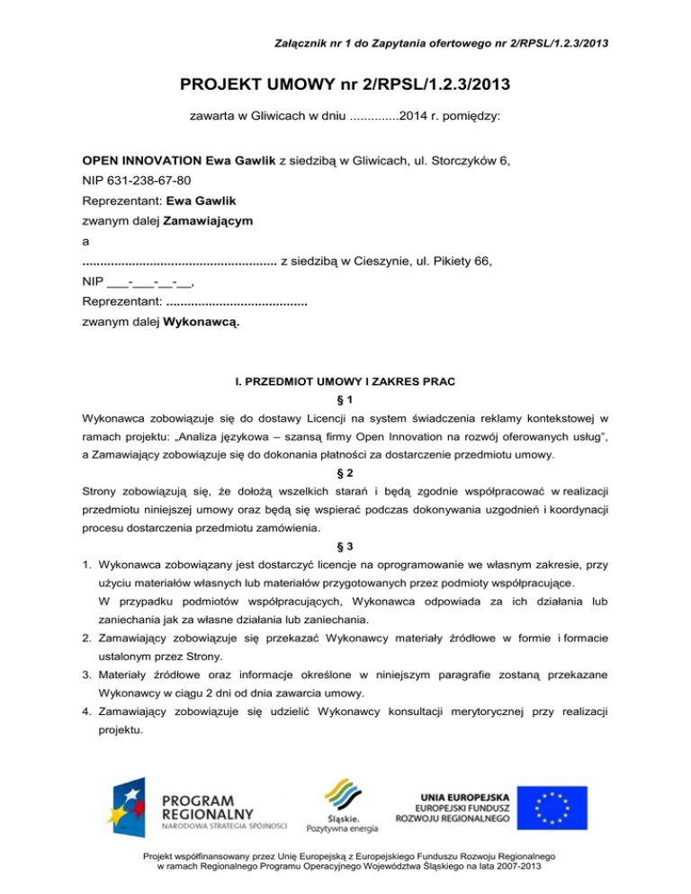Załącznik nr 1 do Zapytania ofertowego nr 2/RPSL/1.2.3/2013 PROJEKT UMOWY nr 2/RPSL/1.2.3/2013 zawarta w Gliwicach w dniu ..............2014 r. pomiędzy: OPEN INNOVATION Ewa Gawlik z siedzibą w Gliwicach, ul. Storczyków 6, NIP 631-238-67-80 Reprezentant: Ewa Gawlik zwanym dalej Zamawiającym a ....................................................... z siedzibą w Cieszynie, ul. Pikiety 66, NIP ___-___-__-__, Reprezentant: ........................................ zwanym dalej Wykonawcą. I. PRZEDMIOT UMOWY I ZAKRES PRAC §1 Wykonawca zobowiązuje się do dostawy Licencji na system świadczenia reklamy kontekstowej w ramach projektu: „Analiza językowa – szansą firmy Open Innovation na rozwój oferowanych usług”, a Zamawiający zobowiązuje się do dokonania płatności za dostarczenie przedmiotu umowy. §2 Strony zobowiązują się, że dołożą wszelkich starań i będą zgodnie współpracować w realizacji przedmiotu niniejszej umowy oraz będą się wspierać podczas dokonywania uzgodnień i koordynacji procesu dostarczenia przedmiotu zamówienia. §3 1. Wykonawca zobowiązany jest dostarczyć licencje na oprogramowanie we własnym zakresie, przy użyciu materiałów własnych lub materiałów przygotowanych przez podmioty współpracujące. W przypadku podmiotów współpracujących, Wykonawca odpowiada za ich działania lub zaniechania jak za własne działania lub zaniechania. 2. Zamawiający zobowiązuje się przekazać Wykonawcy materiały źródłowe w formie i formacie ustalonym przez Strony. 3. Materiały źródłowe oraz informacje określone w niniejszym paragrafie zostaną przekazane Wykonawcy w ciągu 2 dni od dnia zawarcia umowy. 4. Zamawiający zobowiązuje się udzielić Wykonawcy konsultacji merytorycznej przy realizacji projektu. Projekt współfinansowany przez Unię Europejską z Europejskiego Funduszu Rozwoju Regionalnego w ramach Regionalnego Programu Operacyjnego Województwa Śląskiego na lata 2007-2013 Załącznik nr 1 do Zapytania ofertowego nr 2/RPSL/1.2.3/2013 §4 Wykonawca zobowiązuje się do dostarczenia licencji na oprogramowanie zgodnie ze zaleceniem Zamawiającego i z należytą starannością. §5 Wykonawca zobowiązany jest do zachowania w tajemnicy wszelkich danych, do których będzie miał dostęp w związku z realizacją niniejszej umowy. Wykonawca zobowiąże wszystkie podmioty lub osoby włączone w realizację niniejszej umowy do przestrzegania poufności wymaganej przez Zamawiającego. II. TERMIN REALIZACJI UMOWY §6 Wykonawca zobowiązuje się do dostawy przedmiotu zamówienia, w terminie do 24.03.2014r., a Zamawiający zobowiązuje się do dokonania płatności za dostarczenie przedmiotu umowy. §7 Zamawiający zobowiązuje się zaakceptować oprogramowanie będące przedmiotem niniejszej umowy w formie elektronicznej (e-mail) lub wnieść zastrzeżenia na piśmie w terminie do 7 dni roboczych od dnia dostawy. Zastrzeżenia powinny wyraźnie wskazywać treść oczekiwanej zmiany tak, aby jej uwzględnienie mogło zostać wykonane w sposób nie budzący wątpliwości. Przez formę pisemną rozumiany jest również e-mail. III.WYNAGRODZENIE WYKONAWCY I ZASADY PŁATNOŚCI §8 1. Z tytułu dostarczenia licencji na system świadczenia reklamy kontekstowej będącej przedmiotem Umowy i przeniesienia autorskich praw majątkowych, o których mowa w § 12, Wykonawca, otrzyma wynagrodzenie w wysokości: netto ______________ zł (słownie: _______________________ zł) 2. Wynagrodzenie określone w ust. 1 obejmuje wszelkie koszty w tym konsultacji oraz koszty uzyskania innych dokumentów i czynności koniecznych do wykonania przedmiotu umowy. 3. Rozliczenie wynagrodzenia za wykonanie przedmiotu umowy nastąpi fakturami częściowymi oraz fakturą końcową. Podstawą wystawienia każdej faktury jest protokół odbioru usług potwierdzony przez obie Strony. Faktura końcowa uwzględnia uprzednio wystawione i zapłacone faktury częściowe. 4. Wykonawca doliczy do należności z faktur podatek VAT, zgodnie z obowiązującymi przepisami. Projekt współfinansowany przez Unię Europejską z Europejskiego Funduszu Rozwoju Regionalnego w ramach Regionalnego Programu Operacyjnego Województwa Śląskiego na lata 2007-2013 Załącznik nr 1 do Zapytania ofertowego nr 2/RPSL/1.2.3/2013 5. Faktury wystawione przez Wykonawcę płatne będą w formie przelewu na wskazane konto w terminie 7 dni od daty otrzymania faktury przez Zamawiającego. 6. Za dzień zapłaty uważa się dzień obciążenia rachunku bankowego Zamawiającego. IV. WYKONANIE PRAC DODATKOWYCVH §9 1. Jeżeli wykonanie dodatkowych prac okaże się konieczne, to prace takie zostaną wykonane przez Wykonawcę z zastrzeżeniem ust. 2 niniejszego paragrafu, bez dodatkowego wynagrodzenia, jeżeli konieczność ich wykonania wyniknie z błędów lub zaniedbań Wykonawcy. 2. Jeżeli wymieniona w ust. 1 niniejszego paragrafu konieczność wykonania prac dodatkowych wyniknie ze zmiany stanowiska Zamawiającego lub wskutek okoliczności, których nie można było przewidzieć w dniu podpisywania niniejszej umowy pomimo zachowania należytej staranności, prace takie zostaną wykonane przez Wykonawcę za dodatkowym wynagrodzeniem, ustalonym z Zamawiającym oraz w nowym, uzgodnionym przez Strony terminie. V. PRAWA AUTORSKIE § 10 1. Wykonawca przenosi, a Zamawiający nabywa w ramach wynagrodzenia ustalonego w §9 Umowy, wyłączne majątkowe prawa autorskie do oprogramowania z dniem zapłaty całości wynagrodzenia dla Wykonawcy przez Zamawiającego. 2. Zamawiający oświadcza, że posiada niczym nieobciążone majątkowe prawa autorskie do materiałów źródłowych przekazywanych Wykonawcy. Zamawiający zachowuje swoje prawa do wszelkich przekazywanych Wykonawcy materiałów źródłowych. 3. Przeniesienie autorskich praw majątkowych, o których mowa w ust. 2 niniejszego paragrafu nastąpi na wybranych polach eksploatacji: a. wprowadzenie do pamięci komputera; b. odtwarzanie publiczne; c. udos