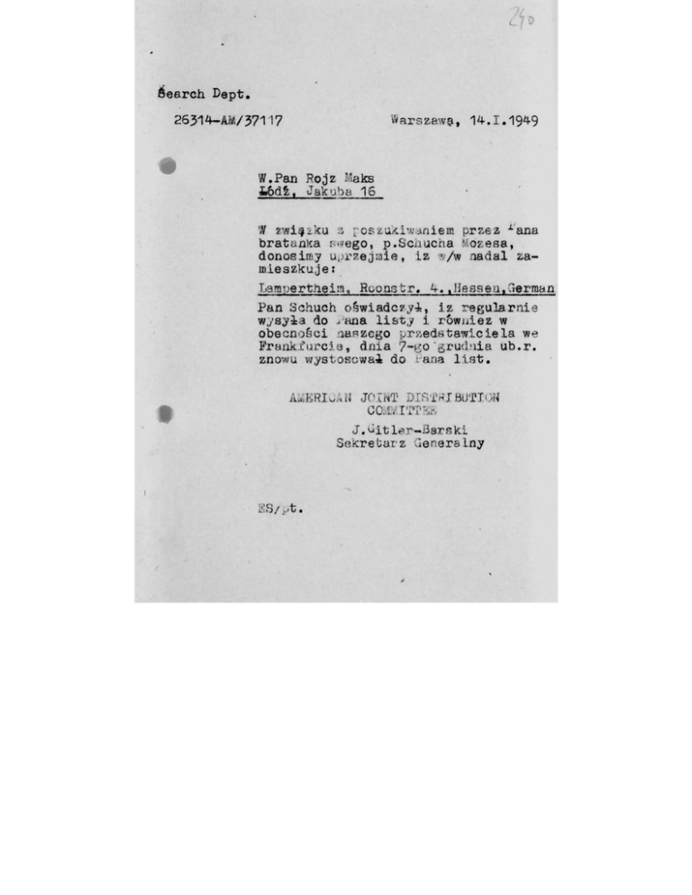 Search Dept. 26514-AM/37117 Warszawa, 14.1.19*9 W.Pan Rojz ?"aks J.6dz, Jakuba 16 /'V swlazku z poszukiwanien przez x ana bratanita swego, p.Scjiucha vozesa, donosimy uprBejmia, i z "/w oadal zamieszkuje: Lam per the i n , Ruonstr. 4.,Hesseu p German Pan Schuch 0§wiadczy4, i z r e g u l a r n i e wyayla do ] ana list;,/ i rowniez w obecnosei aaszcgo p r z e d s t a w i c i e l a we Frankfurcie, dnia ^-^o ^rudaia u b . r . znowu wystoKowaA do Pana l i s t . AS4ERI0. N JO [NT DISTRIBUTIGN COMMITTEE • J.Gitl^r-Barski Setcrebarz GeneraIny BS/pt.