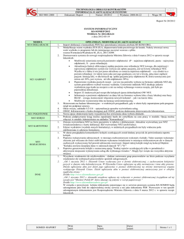 TECHNOLOGIA OBSŁUGI KONTRAKTÓW INFORMACJA O AKTUALIZACJI SYSTEMU Dokument: Raport Numer: 20/2012 Wydanie: 2008-04-22 ISO 9001:2000 Waga: 90 Raport Nr 20/2012 SYSTEM INFORMATYCZNY KS-SOMED'2012 WERSJA Nr 2012.00.0.21 z dnia 2012-03-19 MODUŁ M14 DEKLARACJE 1. 1. 2. M21 GABINET 3. M31 POGOTOWIE M43 KSIĘGI 4. 5. 1. 1. 1. M52 KARTOTEKI 2. 1. 2. M53 ROZLICZENIA 3. 1. 2. INNE SOMED -RAPORT OPIS ZMIAN, MODYFIKACJI i AKTUALIZACJI Import deklaracji z komunikatu PDX bez sprawdzania istnienia atrybutu ID-KOM-ORG. Modyfikacja wzoru wydruku ZUS-ZLA, dopasowanie kodu pocztowego do kratek. Należy stworzyć nowy wzór wydruku w programie lub do istniejącego zaczytać wzorzec z pliku wzorce\FormularzeWydrukow\R_ZLA_2011.EDW. Dostosowanie systemu do nowego rozporządzenia Ministra Zdrowia z dnia 8 marca 2012 w sprawie recept lekarskich: Możliwość ustawienia nowych poziomów odpłatności (P – najniższa odpłatność, pusta – najwyższa odpłatność, X – poza refundacja). Aktualizacja funkcji obliczającej zapłatę pacjenta oraz refundację NFZ (uwaga, dla najniższej i najwyższej odpłatności system nie wylicza ani opłaty pacjenta, ani też kwoty refundacji NFZ. Wynika to z faktu iż nie jest jasno określone co oznacza najniższa odpłatność – czy chodzi tu o poziom refundacji (w takim razie jaka jest jego gradacja), czy też o kwotę, jaką musi zapłacić pacjent. Istnieją leki, w dla których np. opłata pacjenta przy odpłatności R, która teoretycznie jest niższa niż 30%, jest wyższa, niż dla odpłatności 30%). Poprawienie wydruku pustych recept – już nie ma potrzeby wyboru na formatce oddziału NFZ aby system prawidłowo wybrał wzorzec wydruku. Ustawienie oddziału NFZ skutkuje jedynie wydrukiem jego kodu na recepcie a nie na rodzaj wybranego wzorca recepty, jak było po poprzedniej aktualizacji. Import 22 znakowych pul recept dla kolejnych (poza dolnośląskim) OW NFZ. Informacja o poziomie odpłatności za dany lek na formatce wyboru leku z bazy lokalnej oraz bazy BLOZ – uwaga, konieczność włączenia nowych kolumn! – jak i na karcie leku. Możliwość wystawienia leku na kurację sześciomiesięczną. Skierowania na badane laboratoryjne - w niektórych przypadkach, gdy w oknie były zapamiętane pola program mógł nie podpinać umowy. Okno wizyty, zakładki U2-U4 – optymalizacja sposobu wyświetlania usług. OSOZ: Informowanie o braku dostępnej puli OSOZ, podczas dodawania skierowania do laboratorium. Nowa opcja: drukowanie karty wyjazdowej bez otwierania okna wyboru drukarki. Podczas podpisywania ksiąg można zapamiętać hasło do certyfikatu na czas pracy w module. Opcję można włączyć w module Administrator na zakładce "Komunikacja". Zmiana wyświetlania NFZ na liście pacjentów w tabelce z deklaracjami. Aktualnie wyświetlany jest NFZ świadczeniodawcy z karty deklaracji. Był wyświetlany NFZ (archiwalny). Edytor wydruków (wydruk starych formularzy), w niektórych przypadkach nie były widoczne pola zdefiniowane w edytorze formularzy. W oknie przeglądania komunikatów kolejek oczekujących został dodany przycisk do potwierdzania raportu kolejek. Poprawa wykazywania odrzuconych w miesiącu rozliczeniowym wykonań z kolejki. Takie usunięte wykonane zlecenie jest wliczane do ilości osób którym wykonano świadczenie w miesiącu rozliczeniowym ale w danych osobowych wykazywany był powód odrzucenia rezerwacji. Import takiej kolejki mógł się kończył błędem: "Kolejka zawiera niespójne dane w zakresach danych "S" i "O " Poprawa generowania kolejki z zaznaczoną opcją "Szukaj wpisów oczekujących tylko w poradniach z aktywnymi miejscami wykonywania usług dla wybranego świadcz.". Mogły być wzięte nie wszystkie aktywne miejsca. Wysyłanie wiadomości do użytkowników - dodane sortowanie grup pracowników na liście podczas wysyłania wiadomości do wybranych pracowników spośród zalogowanych. „Od 1 stycznia 2012 r. Dziennik Ustaw wydawany jest w formie elektronicznej, z zachowaniem kolejności pozycji w danym roku kalendarzowym. W Dzienniku Ustaw ogłaszane są akty normatywne i inne akty prawne. Dniem ogłoszenia aktu jest dzień jego ogłoszenia w postaci elektronicznej na stronie internetowej organu wydającego Dziennik Ustaw. Dzień ogłoszenia aktu w postaci elektronicznej umieszczony jest w obrębie nagłówka strony.” Źródło http://www.dziennikustaw.gov.pl/ „Od 1 stycznia 2012 r. dzienniki urzędowe ogłasza się wyłącznie w postaci elektronicznej (wyjątkiem od tej zasady jest "Monitor Polski B", który ukazuje się jedynie w wersji papierowej).” Źródło http://www.dziennikiurzedowe.gov.pl/ W związku z powyższym kolejne dokumenty pojawiające się w serwisie prawnym systemu KS-SOMED będą udostępniane jako link do odpowiedniej strony serwisu a nie jako dokumenty PDF. Pierwszym w ten sposób udostępnianym dokumentem jest Rozporządzenie Ministra Zdrowia z dnia 8 marca 2012 r. w sprawie recept lekarskich. Wyk onał: Spra wdził: Zatwi erdził: Strona 1 z 1