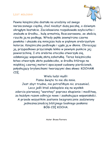 LIST MIŁOSNY Pewna księżniczka dostała na urodziny od swego narzeczonego ciężką, choć niezbyt dużą paczkę, o dziwnym okrągłym kształcie. Zaciekawiona rozpakowała szybciutko i znalazła w środku... kulę armatnią. Rozczarowana, ze złością rzuciła ją na podłogę. Wtedy pękła zewnętrzna czarna powłoka i ukazała się mniejsza kula w pięknym srebrzystym kolorze. Księżniczka podbiegła i ujęła ją w dłonie. Obracając ją, przypadkowo przycisnęła lekko w pewnym punkcie jej powierzchnię. I oto srebrna otoczka otworzyła się, odsłaniając wspaniałą złotą szkatułkę. Teraz księżniczka łatwo otworzyła złote pudełeczko, w środku którego na miękkiej czarnej materii spoczywał cudowny pierścionek, połyskujący brylancikami tworzącymi dwa słowa: KOCHAM CIĘ. Wielu ludzi myśli: Pismo święte to nie dla mnie. Jest zbyt trudne, nie potrafiłbym nic zrozumieć. Lecz jeśli ktoś zdobędzie się na wysiłek zdarcia pierwszej "warstwy" poprzez skupienie i modlitwę, za każdym razem odkryje nowe i zaskakujące wspaniałości. A przede wszystkim zostanie bezgranicznie zadziwiony jednoznacznością biblijnego boskiego posłania: BÓG CIĘ KOCHA. Autor: Bruno Ferrero