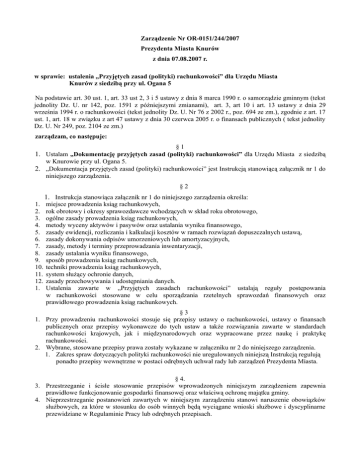 Zarządzenie Nr OR-0151/244/2007 Prezydenta Miasta Knurów z dnia 07.08.2007 r. w sprawie: ustalenia „Przyjętych zasad (polityki) rachunkowości” dla Urzędu Miasta Knurów z siedzibą przy ul. Ogana 5 Na podstawie art. 30 ust. 1, art. 33 ust 2, 3 i 5 ustawy z dnia 8 marca 1990 r. o samorządzie gminnym (tekst jednolity Dz. U. nr 142, poz. 1591 z późniejszymi zmianami), art. 3, art 10 i art. 13 ustawy z dnia 29 września 1994 r. o rachunkowości (tekst jednolity Dz. U. Nr 76 z 2002 r., poz. 694 ze zm.), zgodnie z art. 17 ust. 1, art. 18 w związku z art 47 ustawy z dnia 30 czerwca 2005 r. o finansach publicznych ( tekst jednolity Dz. U. Nr 249, poz. 2104 ze zm.) zarządzam, co następuje: §1 1. Ustalam „Dokumentację przyjętych zasad (polityki) rachunkowości” dla Urzędu Miasta z siedzibą w Knurowie przy ul. Ogana 5. 2. „Dokumentacja przyjętych zasad (polityki) rachunkowości” jest Instrukcją stanowiącą załącznik nr 1 do niniejszego zarządzenia. §2 1. Instrukcja stanowiąca załącznik nr 1 do niniejszego zarządzenia określa: 1. 2. 3. 4. 5. 6. 7. 8. 9. 10. 11. 12. 1. miejsce prowadzenia ksiąg rachunkowych, rok obrotowy i okresy sprawozdawcze wchodzących w skład roku obrotowego, ogólne zasady prowadzenia ksiąg rachunkowych, metody wyceny aktywów i pasywów oraz ustalania wyniku finansowego, zasady ewidencji, rozliczania i kalkulacji kosztów w ramach rozwiązań dopuszczalnych ustawą, zasady dokonywania odpisów umorzeniowych lub amortyzacyjnych, zasady, metody i terminy przeprowadzania inwentaryzacji, zasady ustalania wyniku finansowego, sposób prowadzenia ksiąg rachunkowych, techniki prowadzenia ksiąg rachunkowych, system służący ochronie danych, zasady przechowywania i udostępniania danych. Ustalenia zawarte w „Przyjętych zasadach rachunkowości” ustalają reguły postępowania w rachunkowości stosowane w celu sporządzania rzetelnych sprawozdań finansowych oraz prawidłowego prowadzenia ksiąg rachunkowych. §3 1. Przy prowadzeniu rachunkowości stosuje się przepisy ustawy o rachunkowości, ustawy o finansach publicznych oraz przepisy wykonawcze do tych ustaw a także rozwiązania zawarte w standardach rachunkowości krajowych, jak i międzynarodowych oraz wypracowane przez naukę i praktykę rachunkowości. 2. Wybrane, stosowane przepisy prawa zostały wykazane w załączniku nr 2 do niniejszego zarządzenia. 1. Zakres spraw dotyczących polityki rachunkowości nie uregulowanych niniejszą Instrukcją regulują ponadto przepisy wewnętrzne w postaci odrębnych uchwał rady lub zarządzeń Prezydenta Miasta. § 4. 3. Przestrzeganie i ścisłe stosowanie przepisów wprowadzonych niniejszym zarządzeniem zapewnia prawidłowe funkcjonowanie gospodarki finansowej oraz właściwą ochronę majątku gminy. 4. Nieprzestrzeganie postanowień zawartych w niniejszym zarządzeniu stanowi naruszenie obowiązków służbowych, za które w stosunku do osób winnych będą wyciągane wnioski służbowe i dyscyplinarne przewidziane w Regulaminie Pracy lub odrębnych przepisach. § 5. a) Postanowienia zawarte w instrukcji dotyczą wszystkich naczelników poszczególnych komórek organizacyjnych, kierowników referatów, pracowników na samodzielnych stanowiskach pracy oraz wszystkich pracowników wykonujących zadania urzędu określone w zakresach czynności. b) Naczelnicy poszczególnych komórek organizacyjnych zobowiązani są do zapoznania wszystkich pracowników z postanowieniami niniejszej instrukcji oraz odpowiedzialni są za jej przestrzeganie w zakresie powierzonych im obowiązków służbowych. c) Pracownicy odpowiedzialni za skuteczne sprawowanie kontroli finansowej i audytu wewnętrznego, w wyniku których zaniechają dochodzenia roszczeń od osób winnych ponoszą również odpowiedzialność w drodze regresu, w przypadku dopuszczenia do przedawnienia wszelkich należności i roszczeń. § 6. 1. Wykonanie Zarządzenia powierzam wszystkim osobom wymienionym w § 5. 2. Nadzór nad wykonywaniem Zarządzenia powierzam Zastępcom Prezydenta oraz Sekretarzowi Miasta oraz naczelnikom poszczególnych wydziałów według ich właściwości i kompetencji wynikających z dokumentów organizacyjnych. 3. Zobowiązuję Skarbnika Miasta, Naczelnika Wydziału Budżetowego i Planowania oraz Naczelnika Wydziału Finansowego do bieżącej aktualizacji przyjętych zasad (polityki) rachunkowości, stosownie do zaistniałych zmian w przepisach prawa i potrzeb gminy, w celu jasnego i rzetelnego przedstawienia sytuacji majątkowej i finansowej gminy. § 7. Tracą moc Zarządzenia, jak niżej: 3. Zarządzenie nr 0151/362/2004 Prezydenta Miasta Knurów z dnia 30 grudnia 2004 r. w sprawie: ustalenia dokumentacji przyjętych zasad (polityki) rachunkowości dla Budżetu Gminy i Urzędu Miasta. 4. Zarządzenie Nr OR-0151/259/2005 Prezydenta Miasta Knurów z dnia 7 października 2005 r. w sprawie: wprowadzenia zmian w Zarządzeniu nr 0151/362/2004 Prezydenta Miasta Knurów z dnia 30.12.2004 r. w sprawie: ustalenia dokumentacji przyjętych zasad (polityki) rachunkowości dla Budżetu Gminy i Urzędu Miasta. § 8. Zarządzenie wchodzi w życie z dniem podpisania z mocą obowiązującą od dnia 1 stycznia 2007 r PREZYDENT MIASTA ADAM RAMS. Załącznik nr 1........................... do Zarządzenia nr OR-0151/244/2007 Prezydenta Miasta z dnia 07.08.2007 Zasady (polityki) rachunkowości obowiązująca w: GMINIE KNURÓW oraz URZĘDZIE MIASTA w KNUROWIE - KNURÓW 2007 r. - SPIS TREŚCI Lp. Wyszczególnienie Str Rozdział I Przepisy ogólne 1 Rozdział II Gospodarka finansowa 5 1. Wprowadzenie 5 2. Miejsce prowadzenia ksiąg rachunkowych 5 3. Określenie roku obrotowego 4. Określenie rodzaju sprawozdań oraz okresów sprawozdawczych Rozdział III Rozdział IV Rozdział V Rachunkowość 6 6 7 1. Zasady prowadzenia rachunkowości 8 2. Szczególne zasady prowadzenia rachunkowości 8 3. Zasady ewidencji operacji i zdarzeń gospodarczych oraz stosowane uproszczenia 8 4. Zasady p