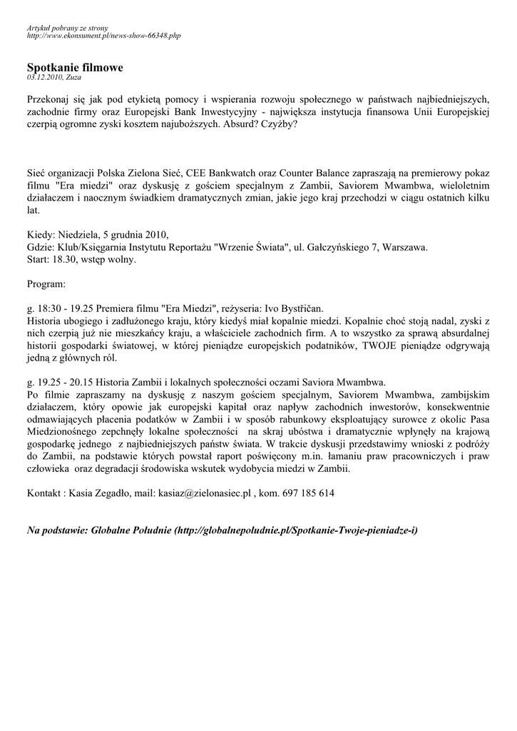 Artykuł pobrany ze strony http://www.ekonsument.pl/news-show-66348.php Spotkanie filmowe 03.12.2010, Zuza Przekonaj się jak pod etykietą pomocy i wspierania rozwoju społecznego w państwach najbiedniejszych, zachodnie firmy oraz Europejski Bank Inwestycyjny - największa instytucja finansowa Unii Europejskiej czerpią ogromne zyski kosztem najuboższych. Absurd? Czyżby? Sieć organizacji Polska Zielona Sieć, CEE Bankwatch oraz Counter Balance zapraszają na premierowy pokaz filmu "Era miedzi" oraz dyskusję z gościem specjalnym z Zambii, Saviorem Mwambwa, wieloletnim działaczem i naocznym świadkiem dramatycznych zmian, jakie jego kraj przechodzi w ciągu ostatnich kilku lat. Kiedy: Niedziela, 5 grudnia 2010, Gdzie: Klub/Księgarnia Instytutu Reportażu "Wrzenie Świata", ul. Gałczyńskiego 7, Warszawa. Start: 18.30, wstęp wolny. Program: g. 18:30 - 19.25 Premiera filmu "Era Miedzi", reżyseria: Ivo Bystřičan. Historia ubogiego i zadłużonego kraju, który kiedyś miał kopalnie miedzi. Kopalnie choć stoją nadal, zyski z nich czerpią już nie mieszkańcy kraju, a właściciele zachodnich firm. A to wszystko za sprawą absurdalnej historii gospodarki światowej, w której pieniądze europejskich podatników, TWOJE pieniądze odgrywają jedną z głównych ról. g. 19.25 - 20.15 Historia Zambii i lokalnych społeczności oczami Saviora Mwambwa. Po filmie zapraszamy na dyskusję z naszym gościem specjalnym, Saviorem Mwambwa, zambijskim działaczem, który opowie jak europejski kapitał oraz napływ zachodnich inwestorów, konsekwentnie odmawiających płacenia podatków w Zambii i w sposób rabunkowy eksploatujący surowce z okolic Pasa Miedzionośnego zepchnęły lokalne społeczności na skraj ubóstwa i dramatycznie wpłynęły na krajową gospodarkę jednego z najbiedniejszych państw świata. W trakcie dyskusji przedstawimy wnioski z podróży do Zambii, na podstawie których powstał raport poświęcony m.in. łamaniu praw pracowniczych i praw człowieka oraz degradacji środowiska wskutek wydobycia miedzi w Zambii. Kontakt : Kasia Zegadło, mail: [email protected] , kom. 697 185 614 Na podstawie: Globalne Południe (http://globalnepoludnie.pl/Spotkanie-Twoje-pieniadze-i)