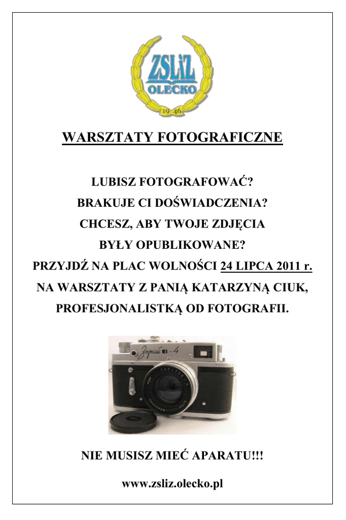 WARSZTATY FOTOGRAFICZNE LUBISZ FOTOGRAFOWAĆ? BRAKUJE CI DOŚWIADCZENIA? CHCESZ, ABY TWOJE ZDJĘCIA BYŁY OPUBLIKOWANE? PRZYJDŹ NA PLAC WOLNOŚCI 24 LIPCA 2011 r. NA WARSZTATY Z PANIĄ KATARZYNĄ CIUK, PROFESJONALISTKĄ OD FOTOGRAFII. NIE MUSISZ MIEĆ APARATU!!! www.zsliz.olecko.pl