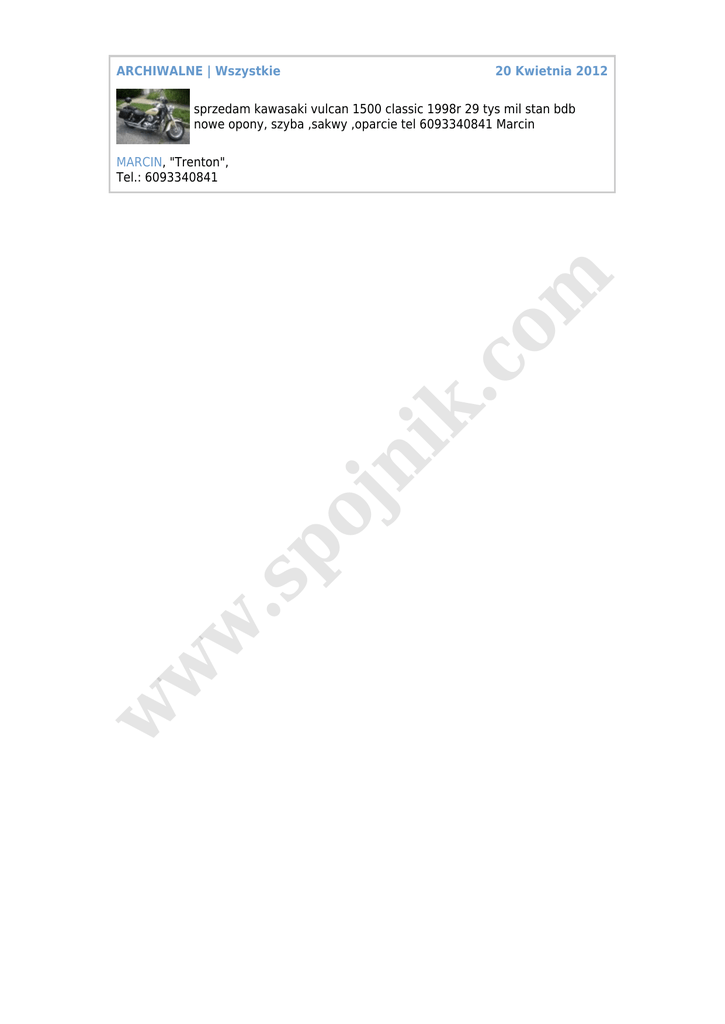 ARCHIWALNE | Wszystkie 20 Kwietnia 2012 sprzedam kawasaki vulcan 1500 classic 1998r 29 tys mil stan bdb nowe opony, szyba ,sakwy ,oparcie tel 6093340841 Marcin w w w .s po jn ik .c o m MARCIN, "Trenton", Tel.: 6093340841