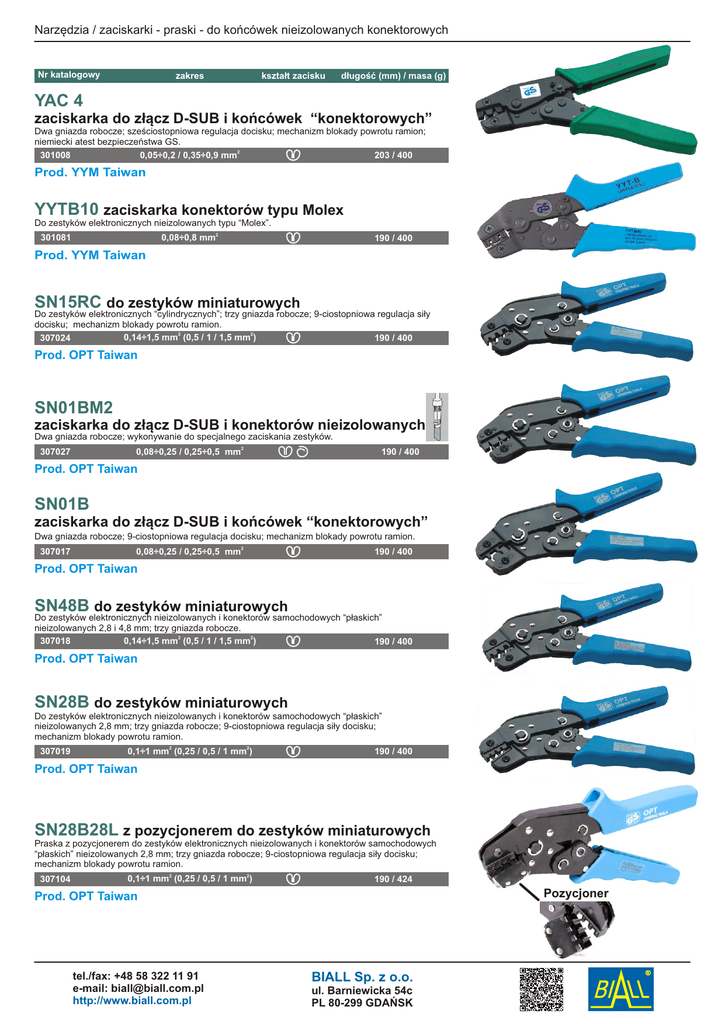 Narzędzia / zaciskarki - praski - do końcówek nieizolowanych konektorowych Nr katalogowy zakres kształt zacisku długość (mm) / masa (g) YAC 4 zaciskarka do złącz D-SUB i końcówek “konektorowych” Dwa gniazda robocze; sześciostopniowa regulacja docisku; mechanizm blokady powrotu ramion; niemiecki atest bezpieczeństwa GS. 0,05÷0,2 / 0,35÷0,9 mm2 301008 203 / 400 Prod. YYM Taiwan YYTB10 zaciskarka konektorów typu Molex Do zestyków elektronicznych nieizolowanych typu “Molex”. 0,08÷0,8 mm2 301081 190 / 400 Prod. YYM Taiwan SN15RC do zestyków miniaturowych Do zestyków elektronicznych “cylindrycznych”; trzy gniazda robocze; 9-ciostopniowa regulacja siły docisku; mechanizm blokady powrotu ramion. 0,14÷1,5 mm2 (0,5 / 1 / 1,5 mm2) 307024 190 / 400 Prod. OPT Taiwan SN01BM2 zaciskarka do złącz D-SUB i konektorów nieizolowanych Dwa gniazda robocze; wykonywanie do specjalnego zaciskania zestyków. 0,08÷0,25 / 0,25÷0,5 mm2 307027 190 / 400 Prod. OPT Taiwan SN01B zaciskarka do złącz D-SUB i końcówek “konektorowych” Dwa gniazda robocze; 9-ciostopniowa regulacja docisku; mechanizm blokady powrotu ramion. 307017 0,08÷0,25 / 0,25÷0,5 mm2 190 / 400 Prod. OPT Taiwan SN48B do zestyków miniaturowych Do zestyków elektronicznych nieizolowanych i konektorów samochodowych “płaskich” nieizolowanych 2,8 i 4,8 mm; trzy gniazda robocze. 0,14÷1,5 mm2 (0,5 / 1 / 1,5 mm2) 307018 190 / 400 Prod. OPT Taiwan SN28B do zestyków miniaturowych Do zestyków elektronicznych nieizolowanych i konektorów samochodowych “płaskich” nieizolowanych 2,8 mm; trzy gniazda robocze; 9-ciostopniowa regulacja siły docisku; mechanizm blokady powrotu ramion. 307019 0,1÷1 mm2 (0,25 / 0,5 / 1 mm2) 190 / 400 Prod. OPT Taiwan SN28B28L z pozycjonerem do zestyków miniaturowych Praska z pozycjonerem do zestyków elektronicznych nieizolowanych i konektorów samochodowych “płaskich” nieizolowanych 2,8 mm; trzy gniazda robocze; 9-ciostopniowa regulacja siły docisku; mechanizm blokady powrotu ramion. 307104 0,1÷1 mm2 (0,25 / 0,5 / 1 mm2) 190 / 424 Pozycjoner Prod. OPT Taiwan tel./fax: +48 58 322 11 91 e-mail: [email protected] http://www.biall.com.pl BIALL Sp. z o.o. ul. Barniewicka 54c PL 80-299 GDAŃSK