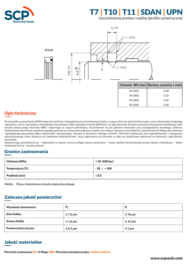 T7 | T10 | T11 | SDAN | UPN Uszczelnienia pretów i wałów (profile symetryczne) Opis techniczny W przypadku uszczelnienia SDAN mamy do czynienia z kompaktowym uszczelnieniem drążka z warga ochronna, pierścieniem wspor czym i elementem wstępnego naprężenia. Jest to typ będący rozwinięciem uszczelnienia SDA, jednakże w wersji SDAN jest on zdecydowanie bardziej wszechstronny poprzez kombinacje zalet wysoko plastycznego elementu NBR i odpornego na zużycie poliuretanu. Uszczelnienie to jest głównie stosowane przy występowaniu wysokiego ciśnienia. Zastosowanie pierścienia antyekstruzyjnego pozwala na utrzymanie większej szczeliny bez obaw o płyniecie uszczelnienia. Zastosowanie O-Ringa jako elementu naprężającego gwarantuje dobre właściwości uszczelniające również w obszarach niskiego ciśnienia. Pierścień rowkowany jest wyprodukowany z kompozytu poliuretanowego, który odznacza się świetnymi właściwościami i dużą odpornością na ścieranie co daje mu zwiększona odporność na ekstruzje i daje dłuższa żywotność. Zaletami tego uszczelnienia są: * odporność na zużycie i przez to długie okresy stosowania * łatwy montaż i konstrukcyjnie proste obszary montażowe * dobre właściwości tarcia * wysoka nośność Granice zastosowania Ciśnienie (MPa) ≤ 50 (500 bar) Temperatura (°C) - 30 / + 100 Prędkość (m/s) ≤ 0,5 Media: Płyny cisnieniowe na bazie oleju mineralnego Zalecana jakość powierzchni Wysokość nierówności Ra Rt Dno żłobka ≤ 1,6 μm ≤ 16 μm Ściany żłobka ≤ 1,6 μm ≤ 16 μm Powierzchnia styczna ≤ 0,3 μm ≤ 3 μm Jakość materiałów Pierścień rowkowany: PU O-Ring: NBR Pierścień antyekstruzyjny: włókno szklane www.scpseals.com