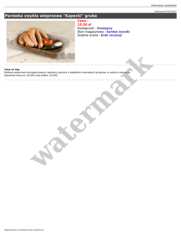 Informacje o produkcie Utworzono 07-03-2017 Parówka zwykła wieprzowa "Kapecki" gruba Cena : 15,30 zł er m ar k Dostępność : Dostępny Stan magazynowy : bardzo wysoki Średnia ocena : brak recenzji w at Cena za 1kg Kiełbasa wieprzowa homogenizowana, wędzona, parzona z dodatkiem naturalnych przypraw, w osłonce naturalnej. Zawartość tłuszczu: 33,50% oraz białka: 14,20%. Wygenerowano w programie www.oscGold.com