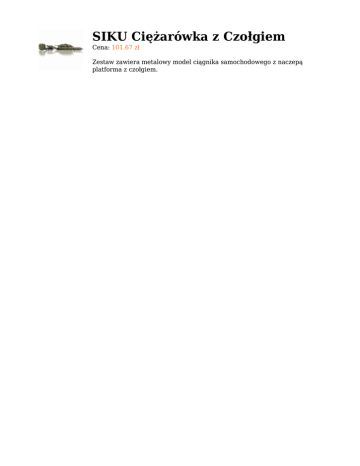 SIKU Ciężarówka z Czołgiem Cena: 101.67 zł Zestaw zawiera metalowy model ciągnika samochodowego z naczepą platforma z czołgiem.