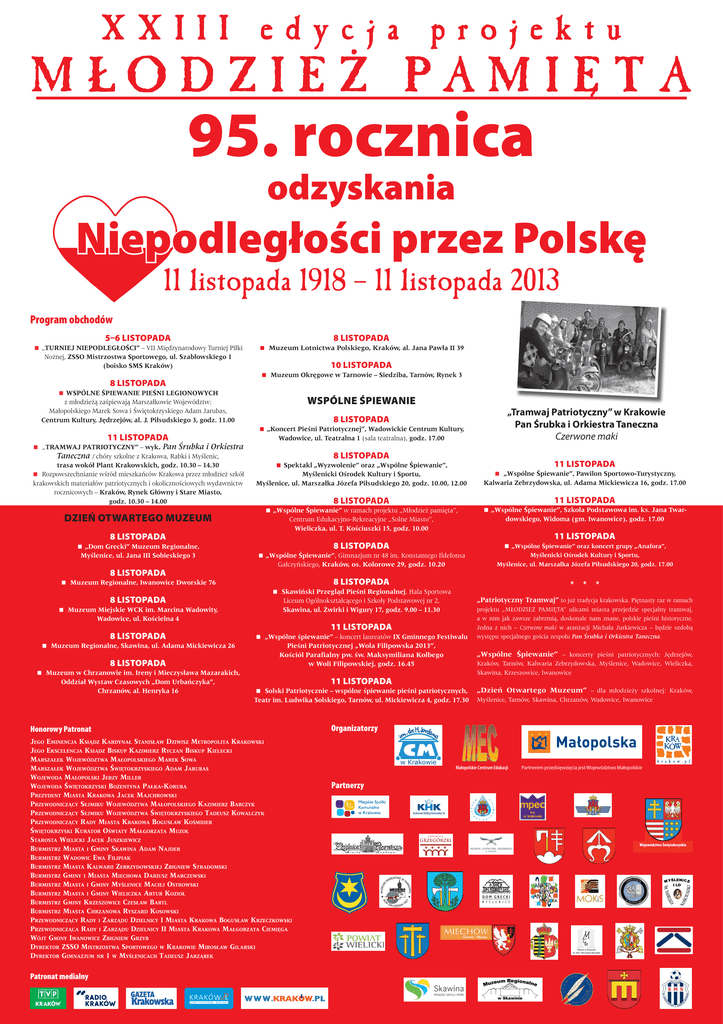 XXIII edycja projektu M ŁO D Z I E Ż PAM I Ę T A 95. rocznica odzyskania Niepodległości przez Polskę 11 listopada 1918 – 11 listopada 2013 Program obchodów 56 LISTOPADA 8 LISTOPADA „TURNIEJ NIEPODLEGŁOŚCI” – VII Międzynarodowy Turniej Piłki Nożnej, ZSSO Mistrzostwa Sportowego, ul. Szablowskiego 1 (boisko SMS Kraków) Muzeum Lotnictwa Polskiego, Kraków, al. Jana Pawła II 39 10 LISTOPADA Muzeum Okręgowe w Tarnowie – Siedziba, Tarnów, Rynek 3 8 LISTOPADA WSPÓLNE ŚPIEWANIE PIEŚNI LEGIONOWYCH z młodzieżą zaśpiewają Marszałkowie Województw: Małopolskiego Marek Sowa i Świętokrzyskiego Adam Jarubas, Centrum Kultury, Jędrzejów, al. J. Piłsudskiego 3, godz. 11.00 11 LISTOPADA WSPÓLNE ŚPIEWANIE 8 LISTOPADA „Koncert Pieśni Patriotycznej”, Wadowickie Centrum Kultury, Wadowice, ul. Teatralna 1 (sala teatralna), godz. 17.00 „Tramwaj Patriotyczny” w Krakowie Pan Śrubka i Orkiestra Taneczna Czerwone maki „TRAMWAJ PATRIOTYCZNY” – wyk. Pan Śrubka i Orkiestra Taneczna / chóry szkolne z Krakowa, Rabki i Myślenic, trasa wokół Plant Krakowskich, godz. 10.30 – 14.30 Rozpowszechnianie wśród mieszkańców Krakowa przez młodzież szkół krakowskich materiałów patriotycznych i okolicznościowych wydawnictw rocznicowych – Kraków, Rynek Główny i Stare Miasto, godz. 10.30 – 14.00 Spektakl „Wyzwolenie” oraz „Wspólne Śpiewanie”, Myślenicki Ośrodek Kultury i Sportu, Myślenice, ul. Marszałka Józefa Piłsudskiego 20, godz. 10.00, 12.00 „Wspólne Śpiewanie”, Pawilon Sportowo-Turystyczny, Kalwaria Zebrzydowska, ul. Adama Mickiewicza 16, godz. 17.00 8 LISTOPADA 11 LISTOPADA DZIEŃ OTWARTEGO MUZEUM „Wspólne Śpiewanie” w ramach projektu „Młodzież pamięta”, Centrum Edukacyjno-Rekreacyjne „Solne Miasto”, Wieliczka, ul. T. Kościuszki 15, godz. 10.00 „Wspólne Śpiewanie”, Szkoła Podstawowa im. ks. Jana Twardowskiego, Widoma (gm. Iwanowice), godz. 17.00 8 LISTOPADA 11 LISTOPADA 11 LISTOPADA 8 LISTOPADA „Dom Grecki” Muzeum Regionalne, Myślenice, ul. Jana III Sobieskiego 3 8 LISTOPADA „Wspólne Śpiewanie” oraz koncert grupy „Anafora”, „Wspólne Śpiewanie”, Gimnazjum nr 48 im. Konstantego Ildefonsa Gałczyńskiego, Kraków, os. Kolorowe 29, godz. 10.20 Myślenicki Ośrodek Kultury i Sportu, Myślenice, ul. Marszałka Józefa Piłsudskiego 20, godz. 17.00 Muzeum Regionalne, Iwanowice Dworskie 76 8 LISTOPADA * * * 8 LISTOPADA Skawiński Przegląd Pieśni Regionalnej, Hala Sportowa Liceum Ogólnokształcącego i Szkoły Podstawowej nr 2, Skawina, ul. Żwirki i Wigury 17, godz. 9.00 – 11.30 8 LISTOPADA Muzeum Miejskie WCK im. Marcina Wadowity, Wadowice, ul. Kościelna 4 „Patriotyczny Tramwaj” to już tradycja krakowska. Piętnasty raz w ramach 11 LISTOPADA 8 LISTOPADA Muzeum Regionalne, Skawina, ul. Adama Mickiewicza 26 8 LISTOPADA Muzeum w Chrzanowie im. Ireny i Mieczysława Mazarakich, Oddział Wystaw Czasowych „Dom Urbańczyka”, Chrzanów, al. Henryka 16 „Wspólne śpiewanie” – koncert laureatów IX Gminnego Festiwalu Pieśni Patriotycznej „Wola Filipowska 2013”, Kościól Parafialny pw. św. Maksymiliana Kolbego w Woli Filipowskiej, godz. 16.45 11 LISTOPADA Solski Patriotycznie – wspólne śpiewanie pieśni patriotycznych, Teatr im. Ludwika Solskiego, Tarnów, ul. Mickiewicza 4, godz. 17.30 Honorowy Patronat JEGO EMINENCJA KSIĄDZ KARDYNAŁ STANISŁAW DZIWISZ METROPOLITA KRAKOWSKI JEGO EKSCELENCJA KSIĄDZ BISKUP KAZIMIERZ RYCZAN BISKUP KIELECKI MARSZAŁEK WOJEWÓDZTWA MAŁOPOLSKIEGO MAREK SOWA MARSZAŁEK WOJEWÓDZTWA ŚWIĘTOKRZYSKIEGO ADAM JARUBAS WOJEWODA MAŁOPOLSKI JERZY MILLER WOJEWODA ŚWIĘTOKRZYSKI BOŻENTYNA PAŁKA-KORUBA PREZYDENT MIASTA KRAKOWA JACEK MAJCHROWSKI PRZEWODNICZĄCY SEJMIKU WOJEWÓDZTWA MAŁOPOLSKIEGO KAZIMIERZ BARCZYK PRZEWODNICZĄCY SEJMIKU WOJEWÓDZTWA ŚWIĘTOKRZYSKIEGO TADEUSZ KOWALCZYK PRZEWODNICZĄCY RADY MIASTA KRAKOWA BOGUSŁAW KOŚMIDER ŚWIĘTOKRZYSKI KURATOR OŚWIATY MAŁGORZATA MUZOŁ STAROSTA WIELICKI JACEK JUSZKIEWICZ BURMISTRZ MIASTA I GMINY SKAWINA ADAM NAJDER BURMISTRZ WADOWIC EWA FILIPIAK BURMISTRZ MIASTA KALWARII ZEBRZYDOWSKIEJ ZBIGNIEW STRADOMSKI BURMISTRZ GMINY I MIASTA MIECHOWA DARIUSZ MARCZEWSKI BURMISTRZ MIASTA I GMINY MYŚLENICE MACIEJ OSTROWSKI BURMISTRZ MIASTA I GMINY WIELICZKA ARTUR KOZIOŁ BURMISTRZ GMINY KRZESZOWICE CZESŁAW BARTL BURMISTRZ MIASTA CHRZANOWA RYSZARD KOSOWSKI PRZEWODNICZĄCY RADY I ZARZĄDU DZIELNICY I MIASTA KRAKOWA BOGUSŁAW KRZECZKOWSKI PRZEWODNICZĄCA RADY I ZARZĄDU DZIELNICY II MIASTA KRAKOWA MAŁGORZATA CIEMIĘGA WÓJT GMINY IWANOWICE ZBIGNIEW GRZYB DYREKTOR ZSSO MISTRZOSTWA SPORTOWEGO W KRAKOWIE MIROSŁAW GILARSKI DYREKTOR GIMNAZJUM NR 1 W MYŚLENICACH TADEUSZ JARZĄBEK Patronat medialny projektu „MŁODZIEŻ PAMIĘTA” ulicami miasta przejedzie specjalny tramwaj, a w nim jak zawsze zabrzmią, doskonale nam znane, polskie pieśni historyczne. Jedna z nich – Czerwone maki w aranżacji Michała Jurkiewicza – będzie ozdobą występu specjalnego gościa zespołu Pan Śrubka i Orkiestra Taneczna. „Wspólne Śpiewanie” – koncerty pieśni patriotycznych: Jędrzejów, Kraków, Tarnów, Kalwaria Zebrzydowska, Myślenice, Wadowice, Wieliczka, Skawina, Krzeszowice, Iwanowice „Dzień Otwartego Muzeum” – dla młodzieży szkolnej: Kraków, Myślenice, Tarnów, Skawina, Chrzanów, Wadowice, Iwanowice Organizatorzy Małopolskie Centrum Edukacji Partnerem przedsięwzięcia jest Województwo Małopolskie Partnerzy Województwo Świętokrzyskie DOM GRECKI M Y Œ L E N I C E Muzeum w Chrzanowie im. Ireny i Mieczysława Mazarakich