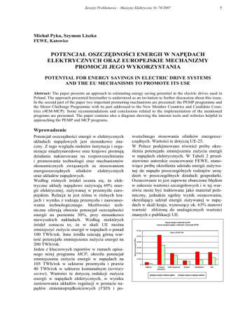 Zeszyty Problemowe – Maszyny Elektryczne Nr 78/2007 7 Michał Pyka, Szymon Liszka FEWE, Katowice POTENCJAŁ OSZCZĘDNOŚCI ENERGII W NAPĘDACH ELEKTRYCZNYCH ORAZ EUROPEJSKIE MECHANIZMY PROMOCJI JEGO WYKORZYSTANIA POTENTIAL FOR ENERGY SAVINGS IN ELECTRIC DRIVE SYSTEMS AND THE EU MECHANISMS TO PROMOTE ITS USE Abstract: The paper presents an approach to estimating energy saving potential in the electric drives used in Poland. The approach presented hereinafter is understood as an invitation to further discussion about this issue. In the second part of the paper two important promoting mechanisms are presented: the PEMP programme and the Motor Challenge Programme with its part addressed to the New Member Countries and Candidate Countries (4EM-MCP). Some recommendations and conclusions related to the implementation of the mentioned programs are presented. The paper contains also a diagram showing the internet tools and websites helpful in approaching the PEMP and MCP programs. Wprowadzenie wszechnego stosowania silników energooszczędnych. Wartości te dotyczą UE-25. W Polsce podejmowano również próby określenia potencjału zmniejszenia zużycia energii w napędach elektrycznych. W Tabeli 2 przedstawiono autorskie oszacowanie FEWE, stanowiące próbę określenia udziału energii zużywanej do napędu poszczególnych rodzajów urządzeń w poszczególnych działach gospodarki. Oszacowanie to jest zapewne obarczone błędem w zakresie wartości szczegółowych i w tej warstwie może być traktowane jako materiał polemiczny, jednakże ogólny wynik oszacowania, określający udział energii zużywanej w napędach w skali kraju, wynoszący ok. 63% stanowi wartość zbliżoną do analogicznych wartości znanych z publikacji UE. Zuzycie energii w sektorach wg GUS i zuzycie energii na napędy w sektorach - oszacowanie FEWE 60 000 Razem: 128 245 GWh 50 000 Zuzycie energii GWh Potencjał oszczędności energii w elektrycznych układach napędowych jest stosunkowo znaczny. Z tego względu niektóre instytucje i organizacje międzynarodowe oraz krajowe promują działania nakierowane na rozpowszechnianie i promowanie technologii oraz mechanizmów ekonomicznych związanych ze stosowaniem energooszczędnych silników elektrycznych oraz układów napędowych. Według różnych źródeł ocenia się, że elektryczne układy napędowe zużywają 69% energii elektrycznej, zużywanej w przemyśle europejskim. Relacja ta jest różna w różnych krajach i wynika z rodzaju przemysłu i zaawansowania technologicznego. Możliwości techniczne oferują obecnie potencjał oszczędności energii na poziomie 30%, przy stosunkowo niewysokich nakładach. Według niektórych źródeł oznacza to, że w skali UE można zmniejszyć zużycie energii w napędach o ponad 100 TWh/rok. Inne źródła szacują górną wartość potencjału zmniejszenia zużycia energii na 200 TWh/rok. Jeden z kluczowych raportów w ramach opisanego niżej programu MCP, określa potencjał zmniejszenia zużycia energii w napędach na 105 TWh/rok w sektorze przemysłu i prawie 40 TWh/rok w sektorze komunalnym (tertiary sector). Wartości te dotyczą redukcji zużycia energii w napędach elektrycznych, w wyniku zastosowania układów regulacji w postacie napędów zmiennoprędkościowych (VSD) i po- 40 000 30 000 20 000 10 000 0 Rolnictwo Przemysł i budownictwo Sektor energetyczny Zużycie energii w sektorze ogółem Transport Mieszkalnictwo Zuzycie energii na napędy w sektorze Inne Zeszyty Problemowe – Maszyny Elektryczne Nr 78/2007 Określenie potencjału redukcji zużycia energii w napędach elektrycznych w Polsce 7% 21,4% 24,9% 15,0% 14,8% 24% udział w mocy zainstalowanej 6% 5% 4% 3% 2% 1% 3000 600 2000 1000 400 300 200 160 132 90 75 110 55 45 37 30 22 15 11 18,5 4 7,5 3 5,5 2,2 1,5 1,1 0,55 0% typoszereg silników, [kW] Mozliwa poprawa sprawności silników 100% Sprawność: obecnie i przy Eff1 Określenie potencjału oszczędności częściowo możliwe jest poprzez zastosowanie metod statystycznych, ale wymaga równocześnie pewnej dozy intuicji, ponieważ brak jest danych na temat liczby poszczególnych typów silników w całej gospodarce. Ponadto należałoby uwzględnić czas pracy poszczególnych silników i stopień ich obciążenia. Z konieczności przyjęto tutaj pewne założenia upraszczające. Następnie przyjęto, że działające w Polsce układy napędowe zużywają ilości energii w takiej samej proporcji procentowej, w jakiej w krajach UE wprowadza się na rynek nowe układy napędowe w poszczególnych grupach mocy silników (wykorzystano dane na podstawie opracowania A. Almeidy, p.t.: „Inception Report: Analysis of existing technical and market information”, Uniwersytet Coimbra, 2006). W tym opracowaniu przedstawiono zestawienie, cytowane poniżej w Tabeli 1. Udział poszczególnych silników z typoszeregu w mocy zainstalowanej silników ogółem 0,75 8 95% 90% 85% 80% 75% 100,0% 9,1 Dla celów niniejszej analizy oszacowano (FEWE), że duże silniki (pow. 200 kW) zużywają 24% energii zużywanej przez wszystkie napędy elektryczne, a pozostałe 76% zużycia energii w napędach przypisano grupom silników mniejszych (zdefiniowanych jak w Tabeli 1), z zachowaniem wewnętrznej proporcji udziału, w ramach owych 76%, w proporcjach wynikających z Tabeli 1. Następnie zestawiono porównanie sprawności standardowej silników ze sprawnością silników klasy EFF1, dla reprezentatywnych grup i mocy z danego typoszeregu. 3000 1000 400 200 132 90 55 37 22 15 7,5 4 2,2 0,5 5 Potencjał oszczędności energii w wyniku poprawy sprawności do EFF1, w poszczególnych grupach silników, w skali kraju 700 600 500 400 300 200 100 0 3000 79,6 1000 RAZEM 400 0,1 200 14,6% 132 11,6 90 75-200 kW 55 0,3 37 19,6% 22 15,6 15 37-75 kW 7,5 1,5 4 37,7% 2,2 30,0 1,1 7.5-37 kW 0,55 22,5 Moc zain- Udział grupy stalowana, w mocy zainGW stalowanej Następnie wyliczono potencjalną redukcję zużycia energii wynikającą z zastąpienia s
